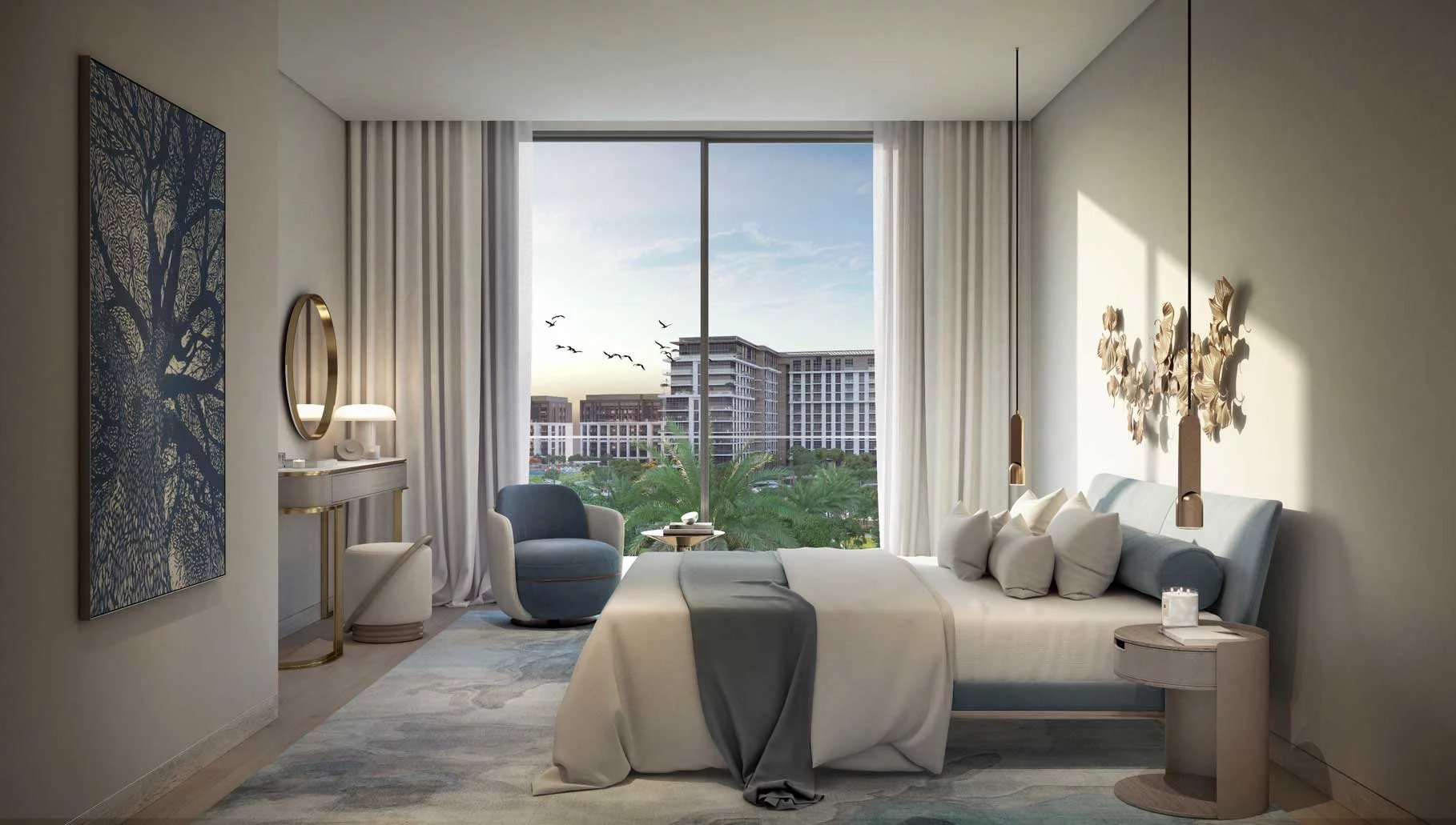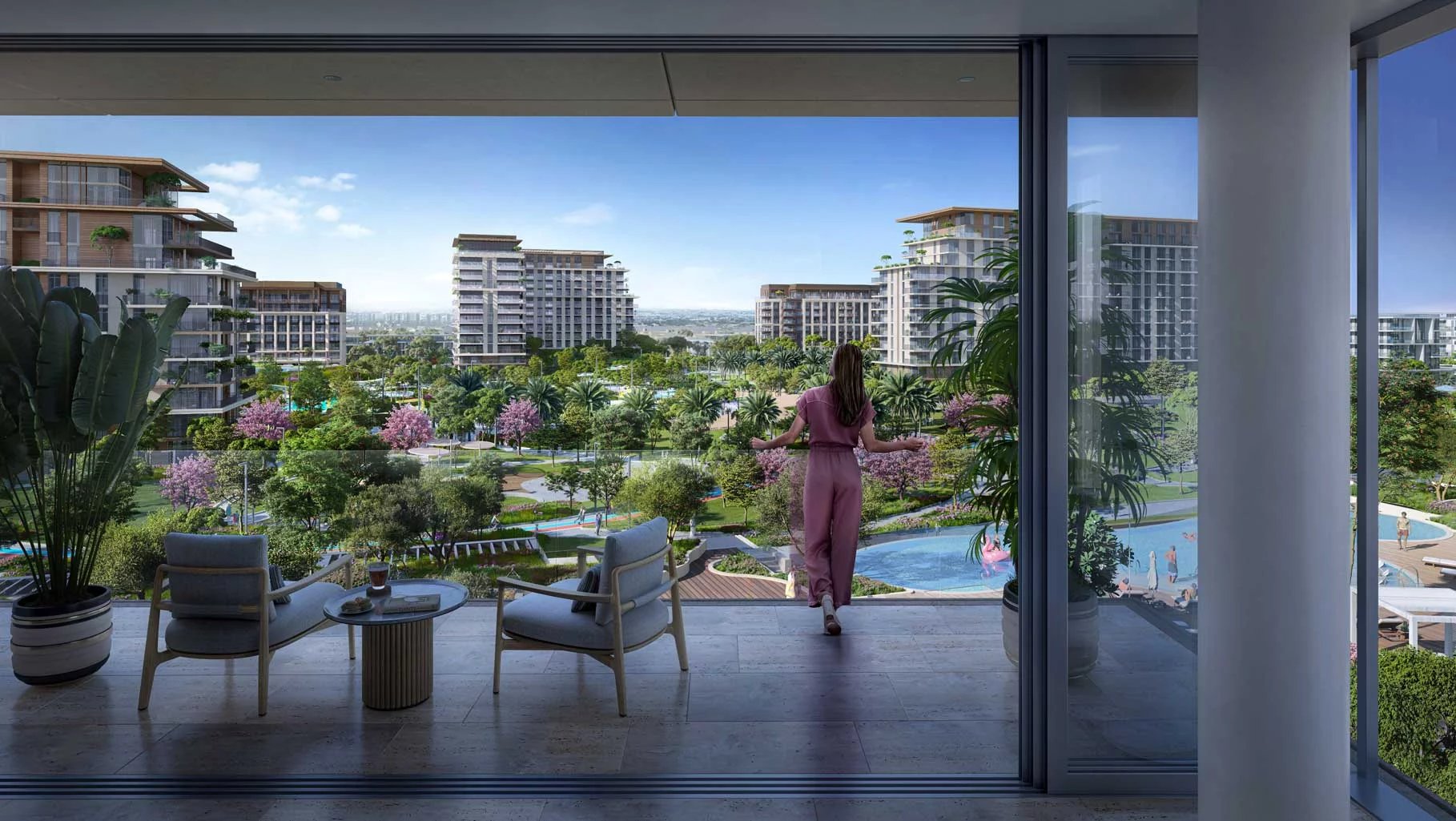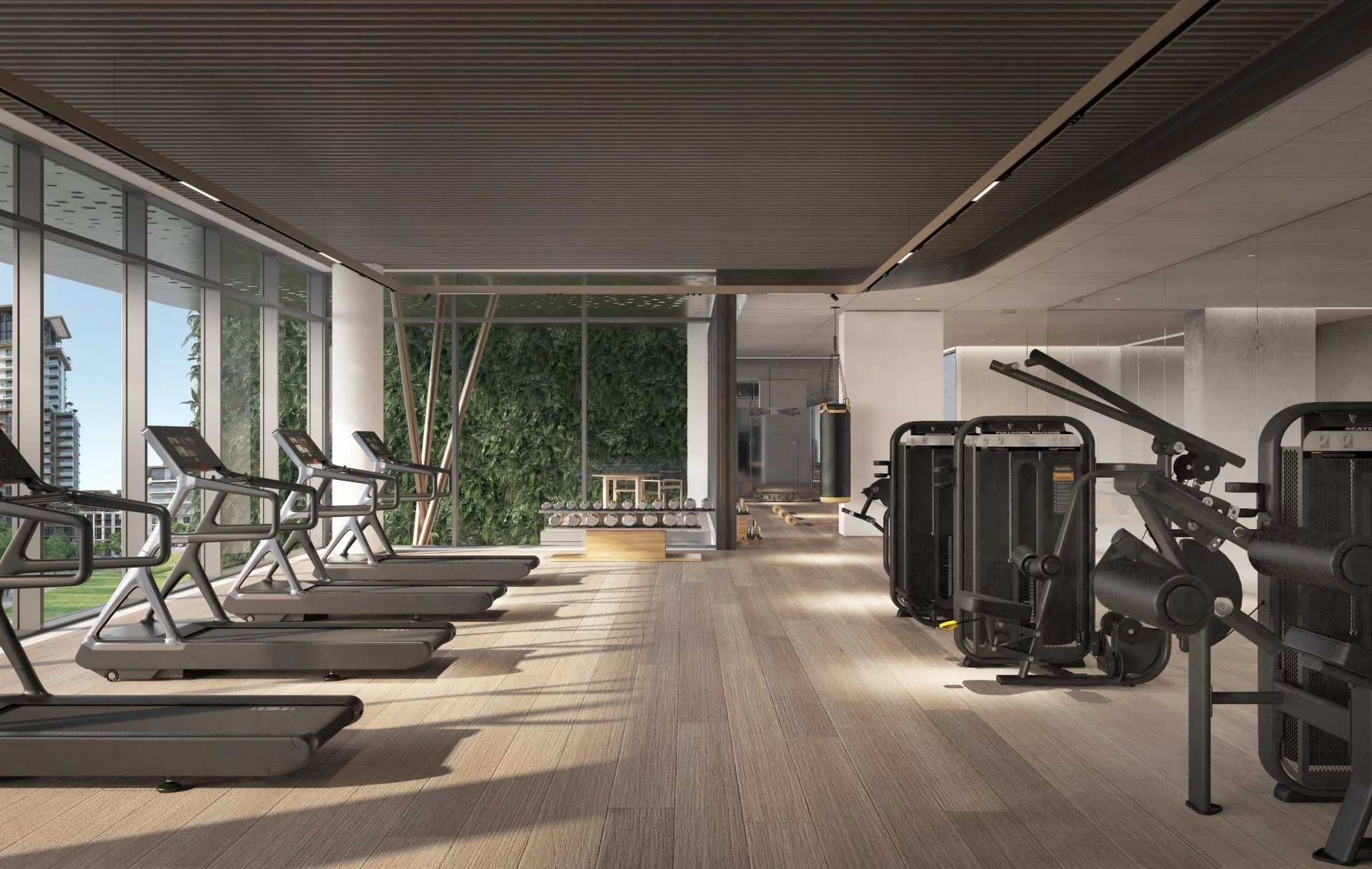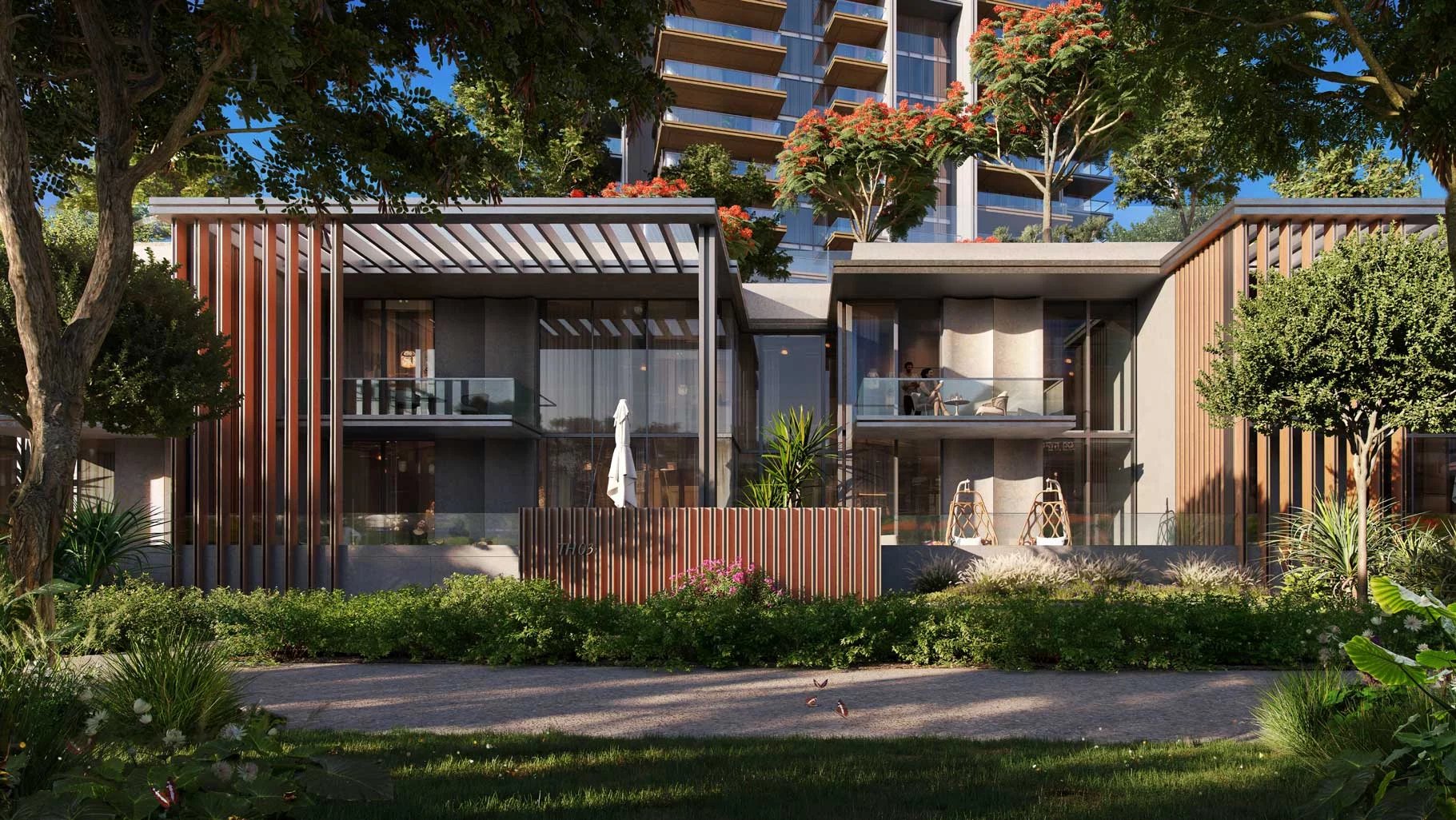 Finishing and materials: Contemporary living enhanced by superior finishes with corner panoramic views. Bedrooms with full height glass panels overlooking the park. Spacious bathrooms with variety of fixtures and high-end materials selection.