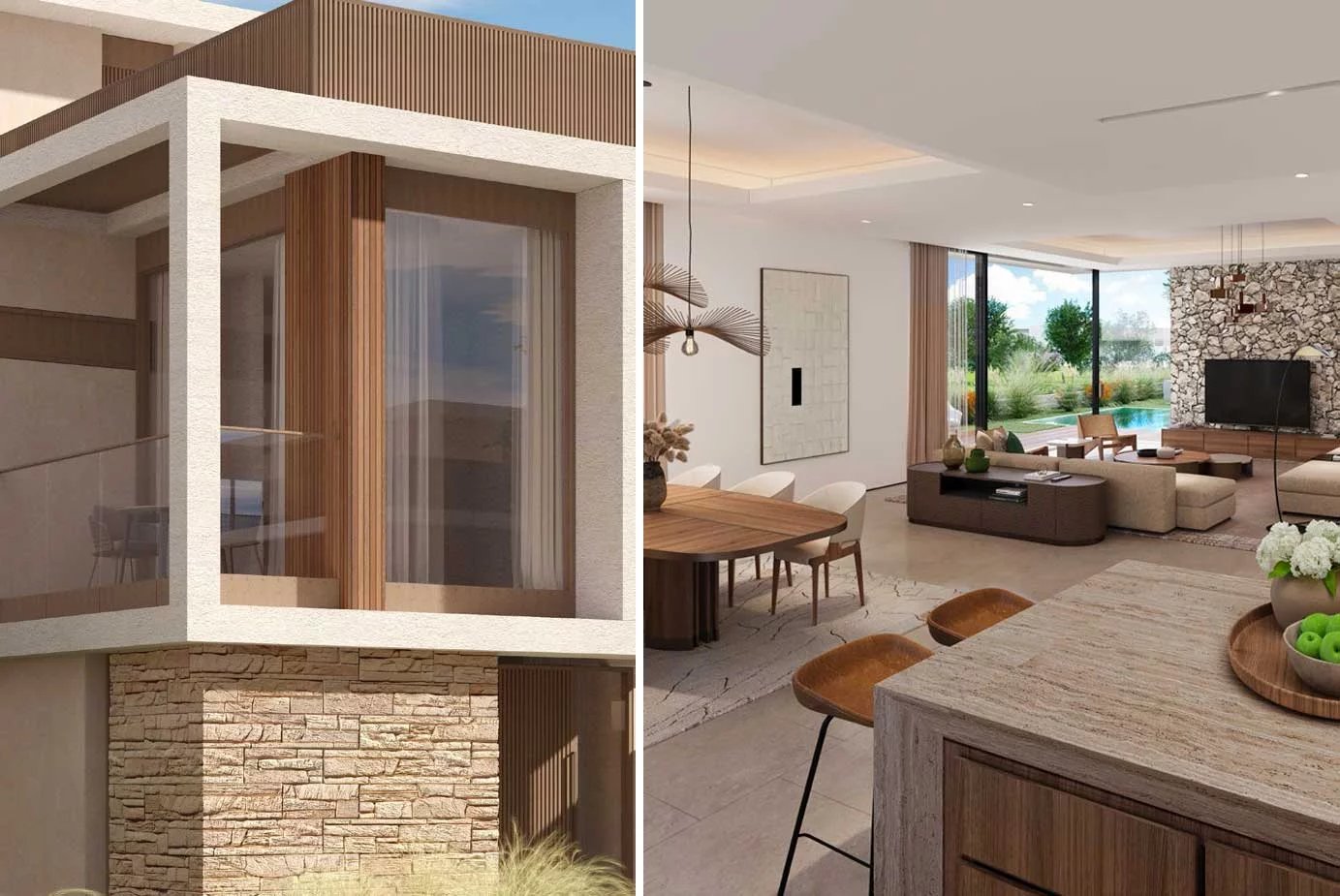 The architecture and design philosophy at The Acres is a testament to a harmonious alliance between modern luxury and nature. Inspired by the elements, the architecture proudly features stone, wood and glass crafting a visual symphony that mirrors the natural surroundings. The villas feature contemporary palettes that bathe the walls in light, while the sleek structures maximise exposure, creating a continuous interaction with the lush environment.