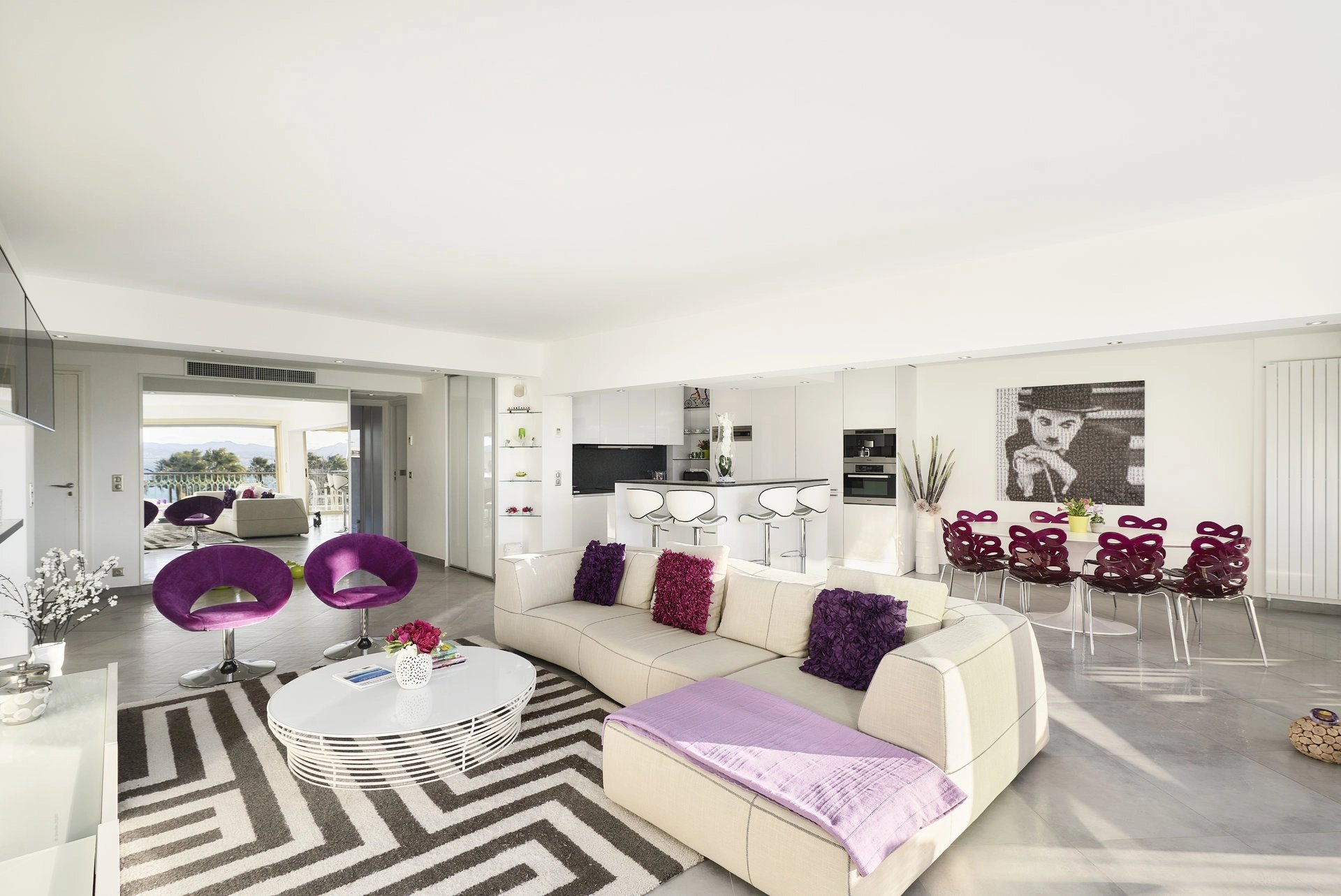Large reception opening onto the terrace and comprising living room, dining area and kitchen