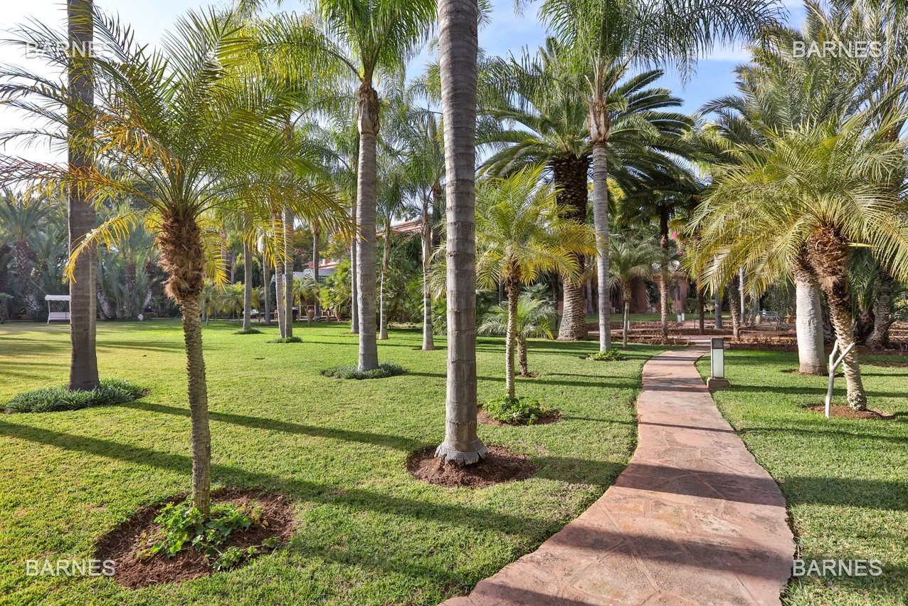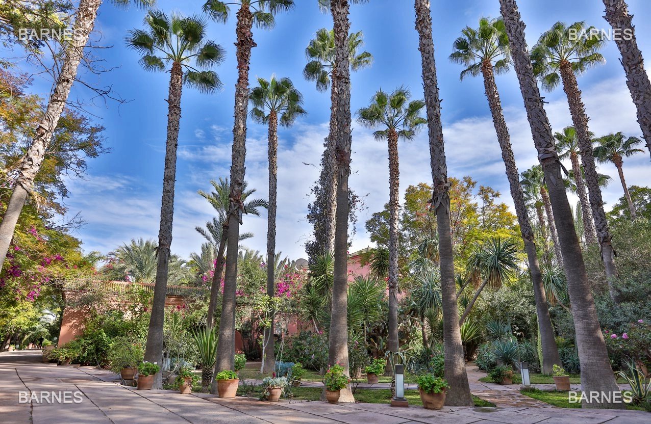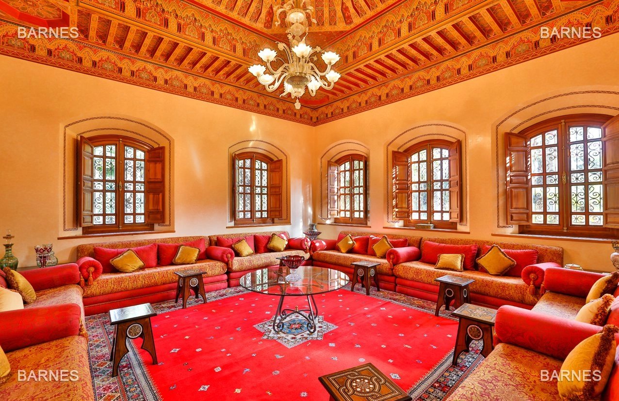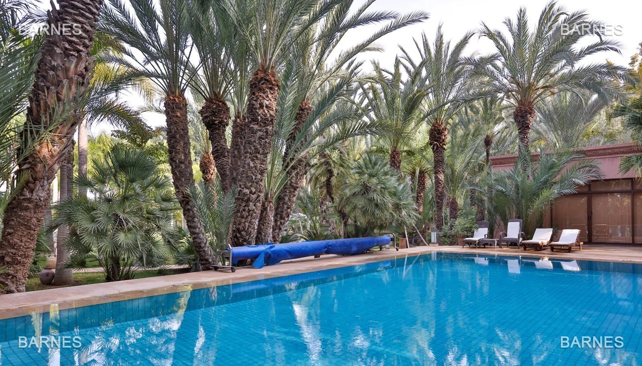 Arab- Berber superb Palace , located on a one hectare oasis . Beautiful entrance which serves many different reception rooms and a dining room , large kitchen with pantry ; 4 large suites with walk-in bathroom and a large master suite upstairs . Beautiful heated pool with Jacuzzi area and sports area , sauna, hamam . 3 car garage housing Staff Finish and quality materials. Gas central heating and air conditioning sheathed .