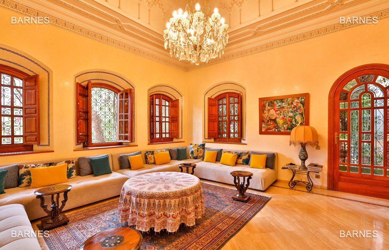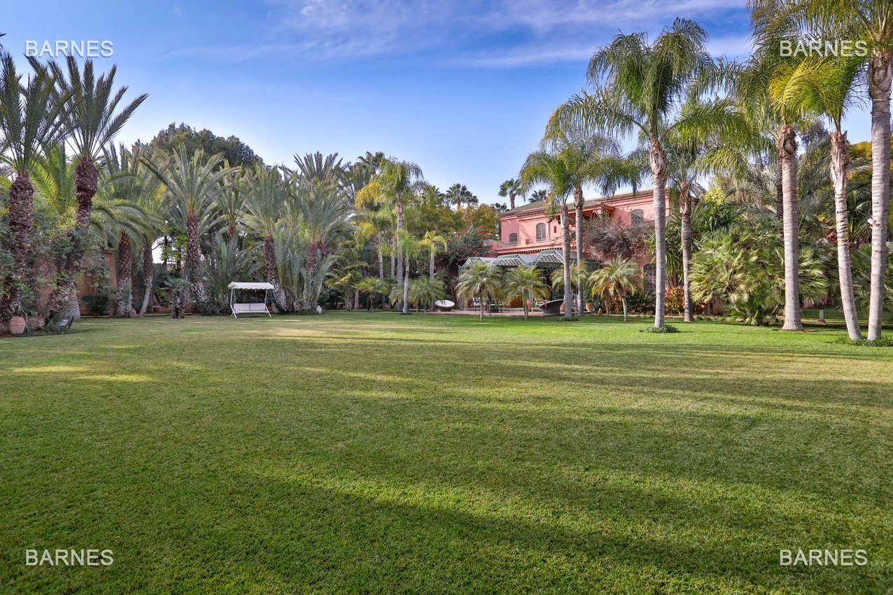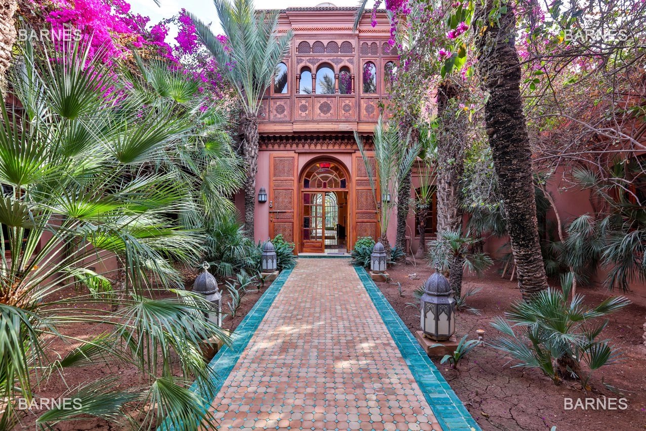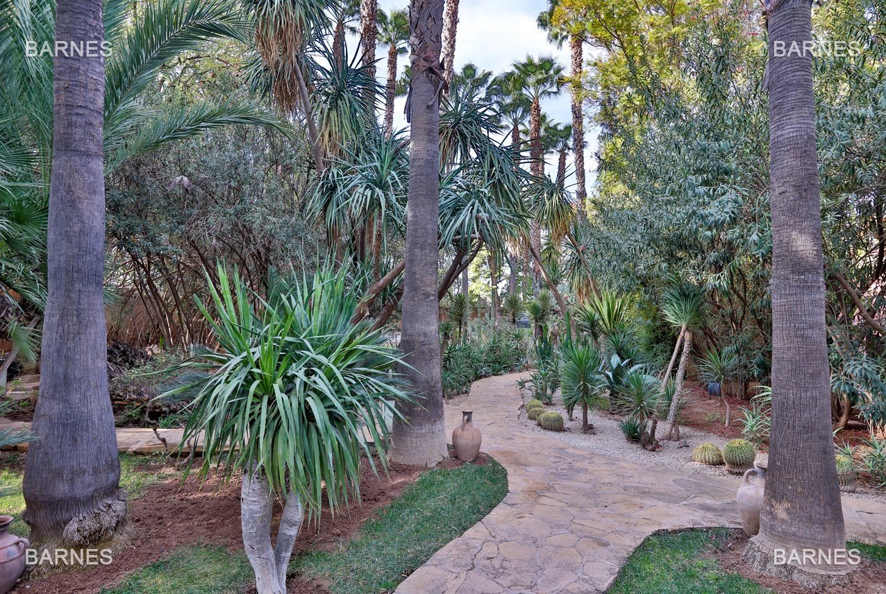 Arab- Berber superb Palace , located on a one hectare oasis . Beautiful entrance which serves many different reception rooms and a dining room , large kitchen with pantry ; 4 large suites with walk-in bathroom and a large master suite upstairs . Beautiful heated pool with Jacuzzi area and sports area , sauna, hamam . 3 car garage housing Staff Finish and quality materials. Gas central heating and air conditioning sheathed .