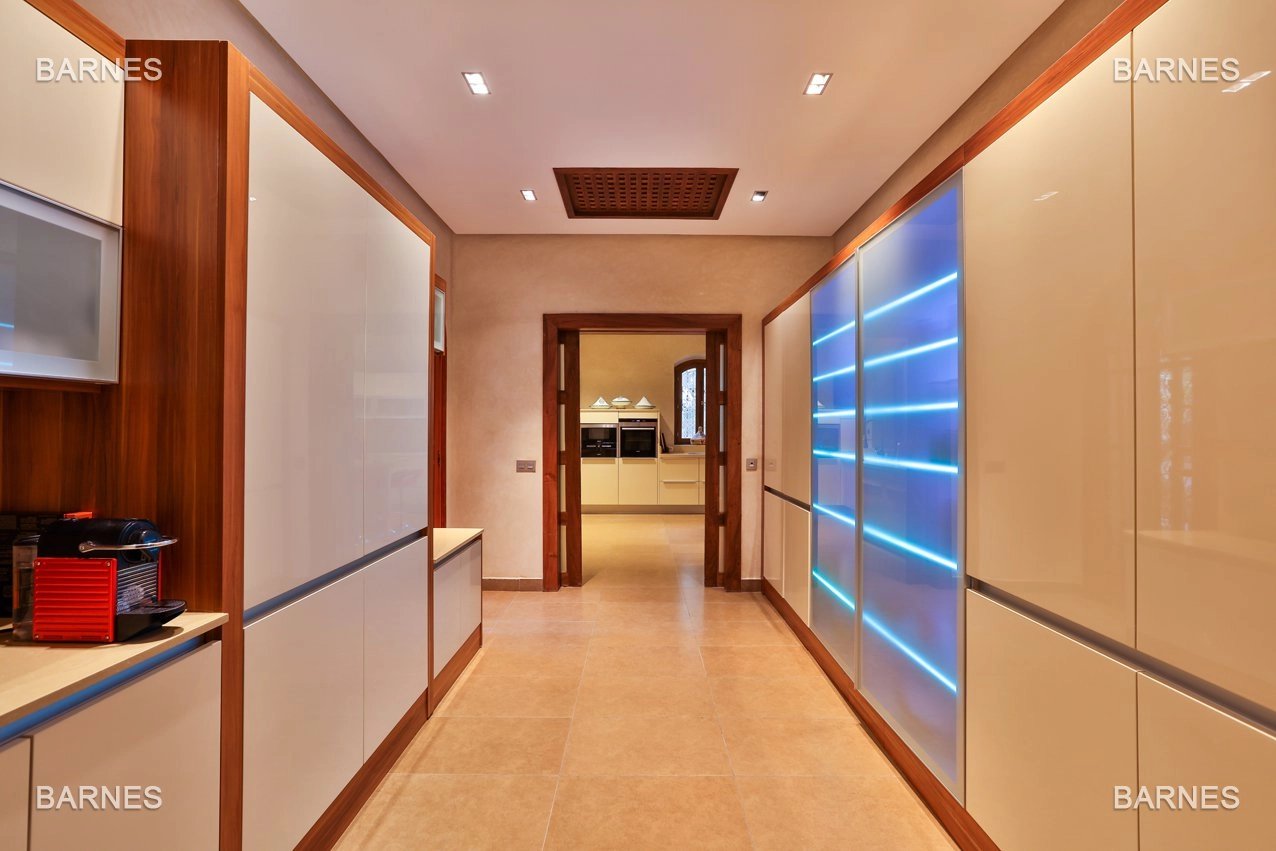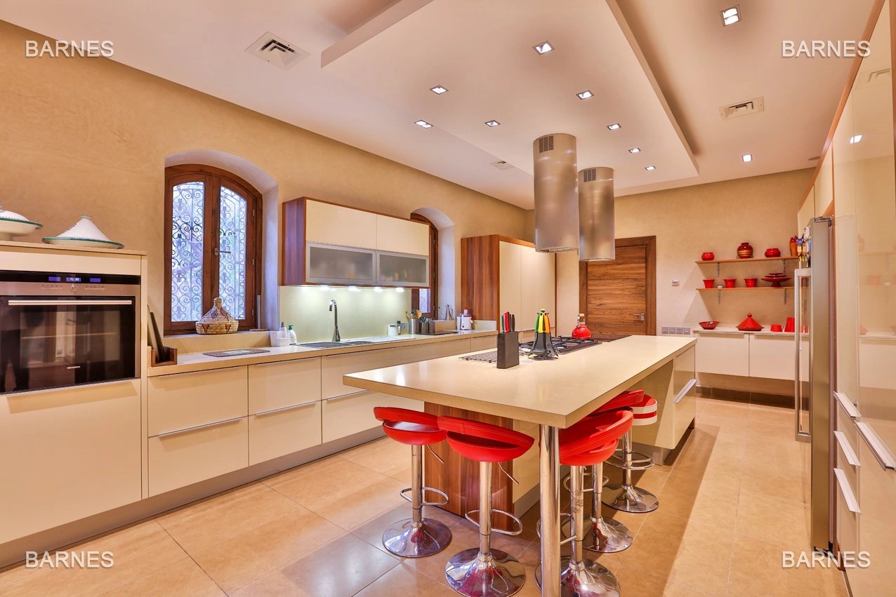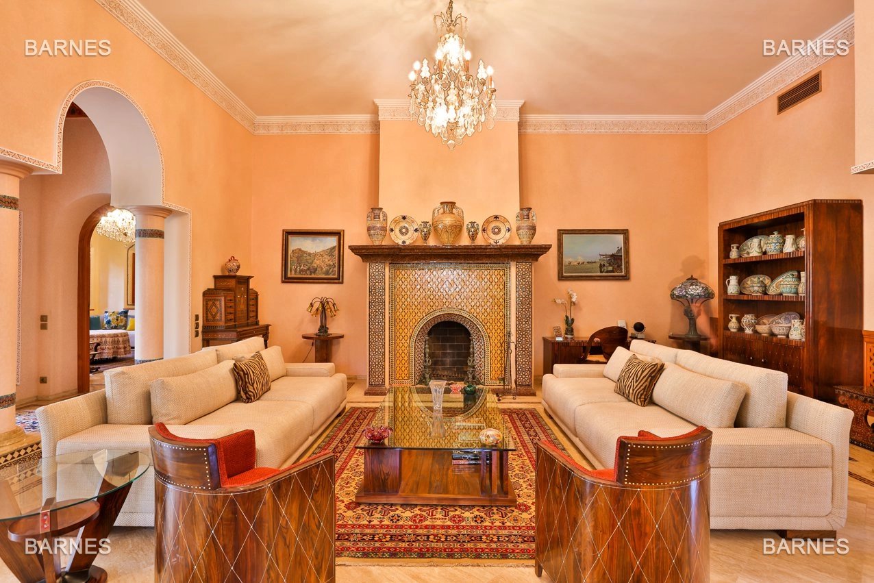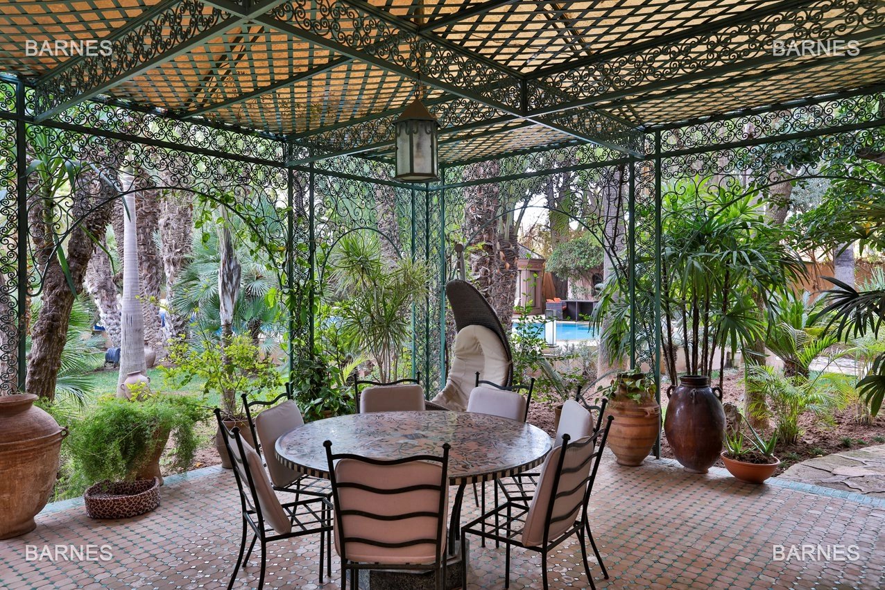 Arab- Berber superb Palace , located on a one hectare oasis . Beautiful entrance which serves many different reception rooms and a dining room , large kitchen with pantry ; 4 large suites with walk-in bathroom and a large master suite upstairs . Beautiful heated pool with Jacuzzi area and sports area , sauna, hamam . 3 car garage housing Staff Finish and quality materials. Gas central heating and air conditioning sheathed .