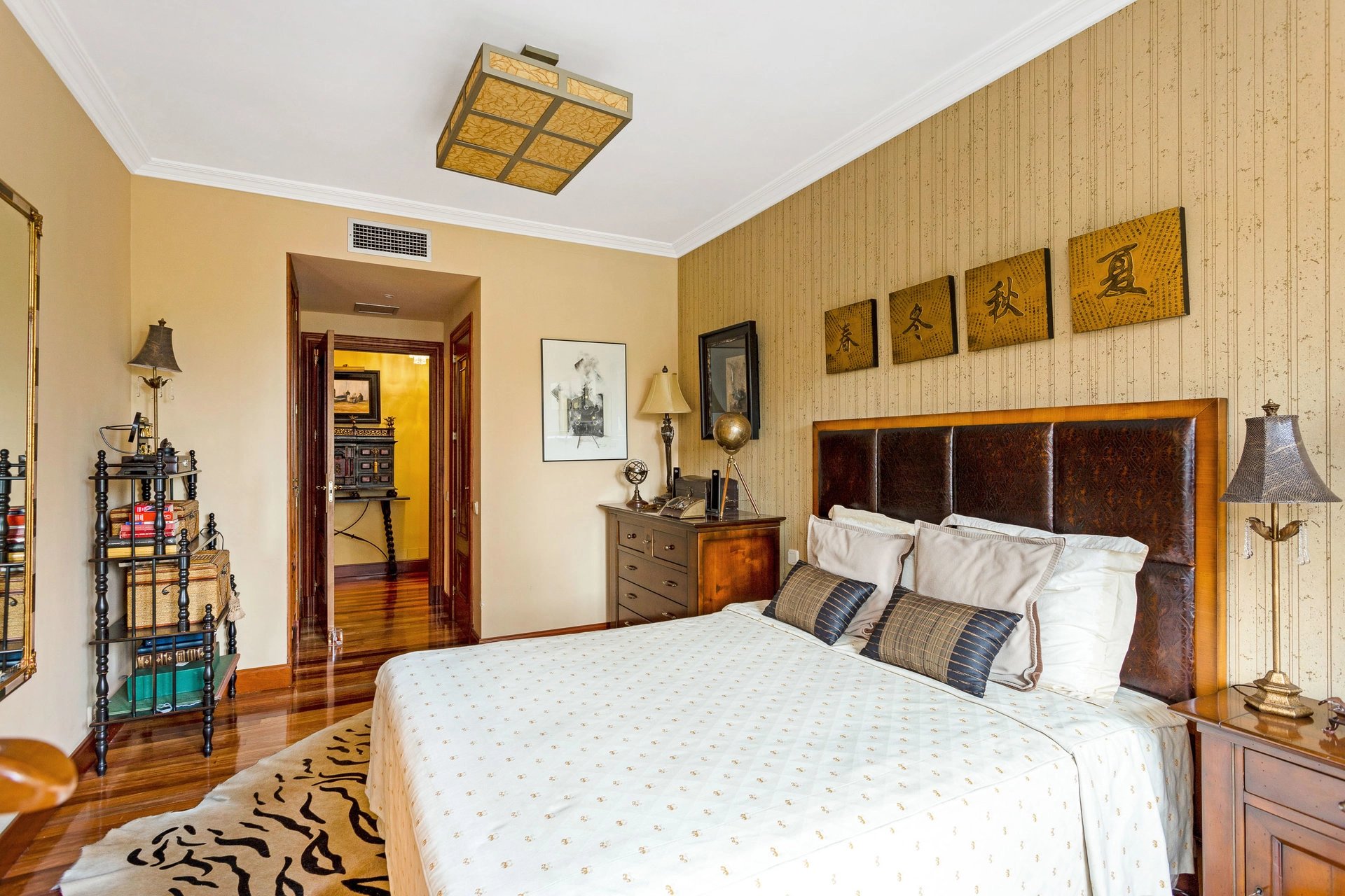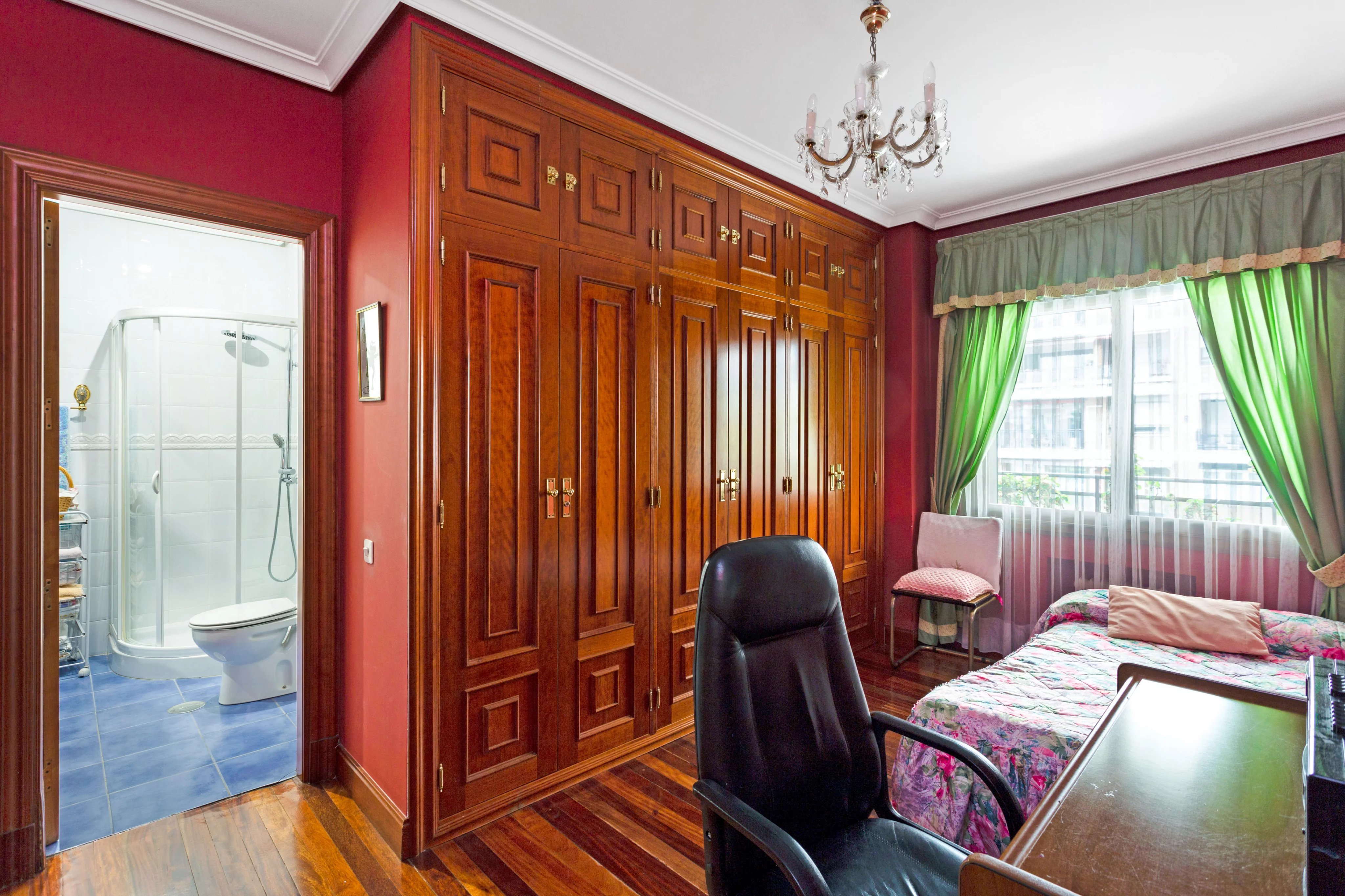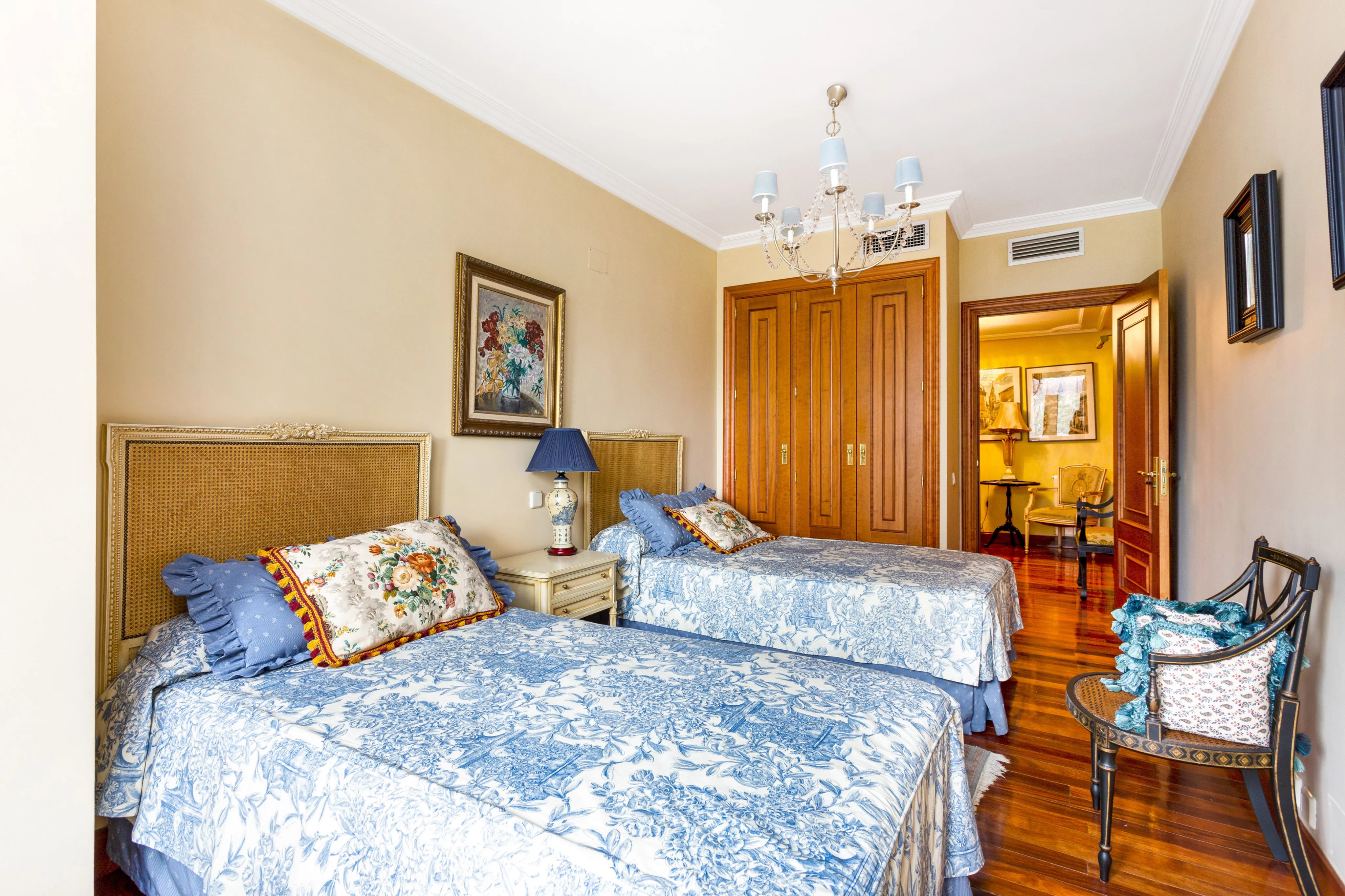 The apartment has three bedrooms, two of them with en-suite bathrooms and the third with a bathroom in the hallway, plus a service bedroom with its own bathroom.