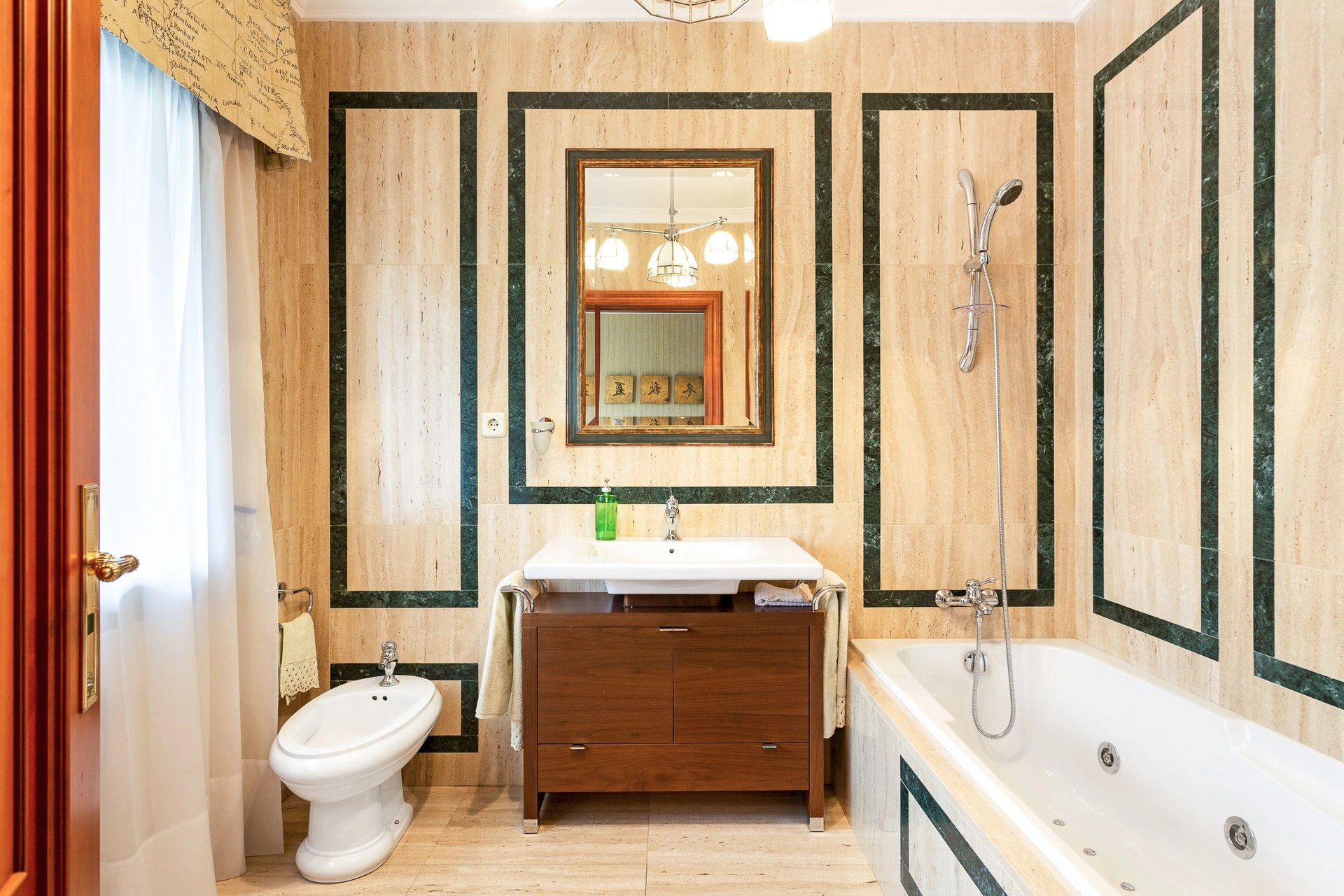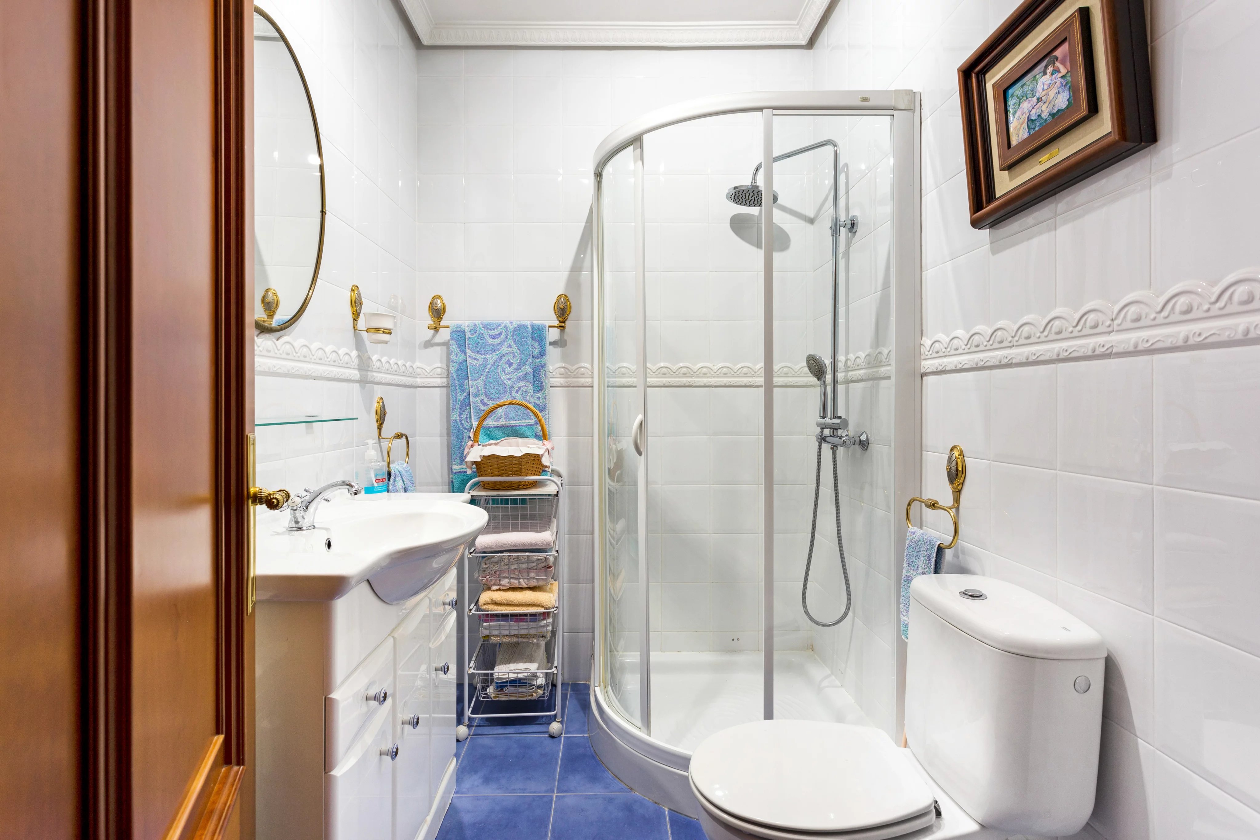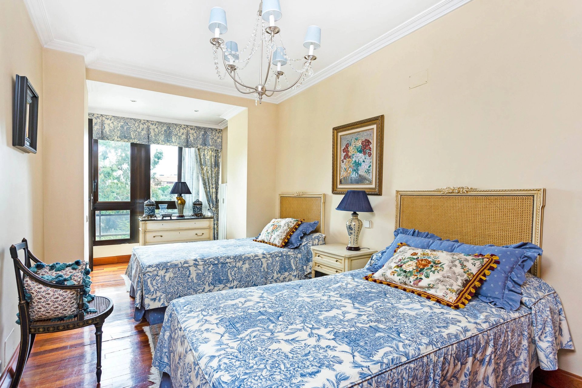 The apartment has three bedrooms, two of them with en-suite bathrooms and the third with a bathroom in the hallway, plus a service bedroom with its own bathroom.