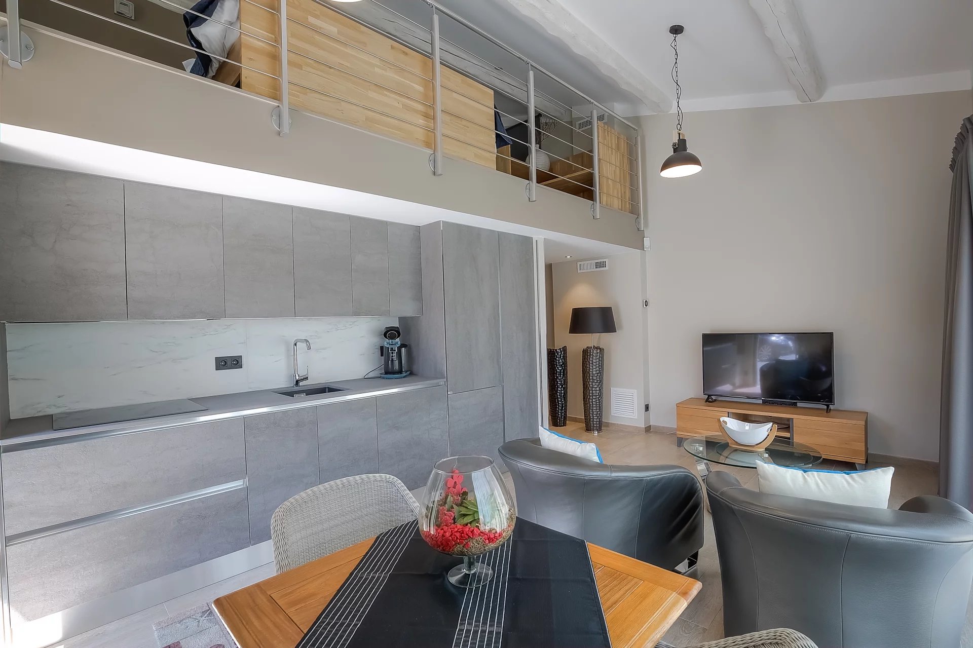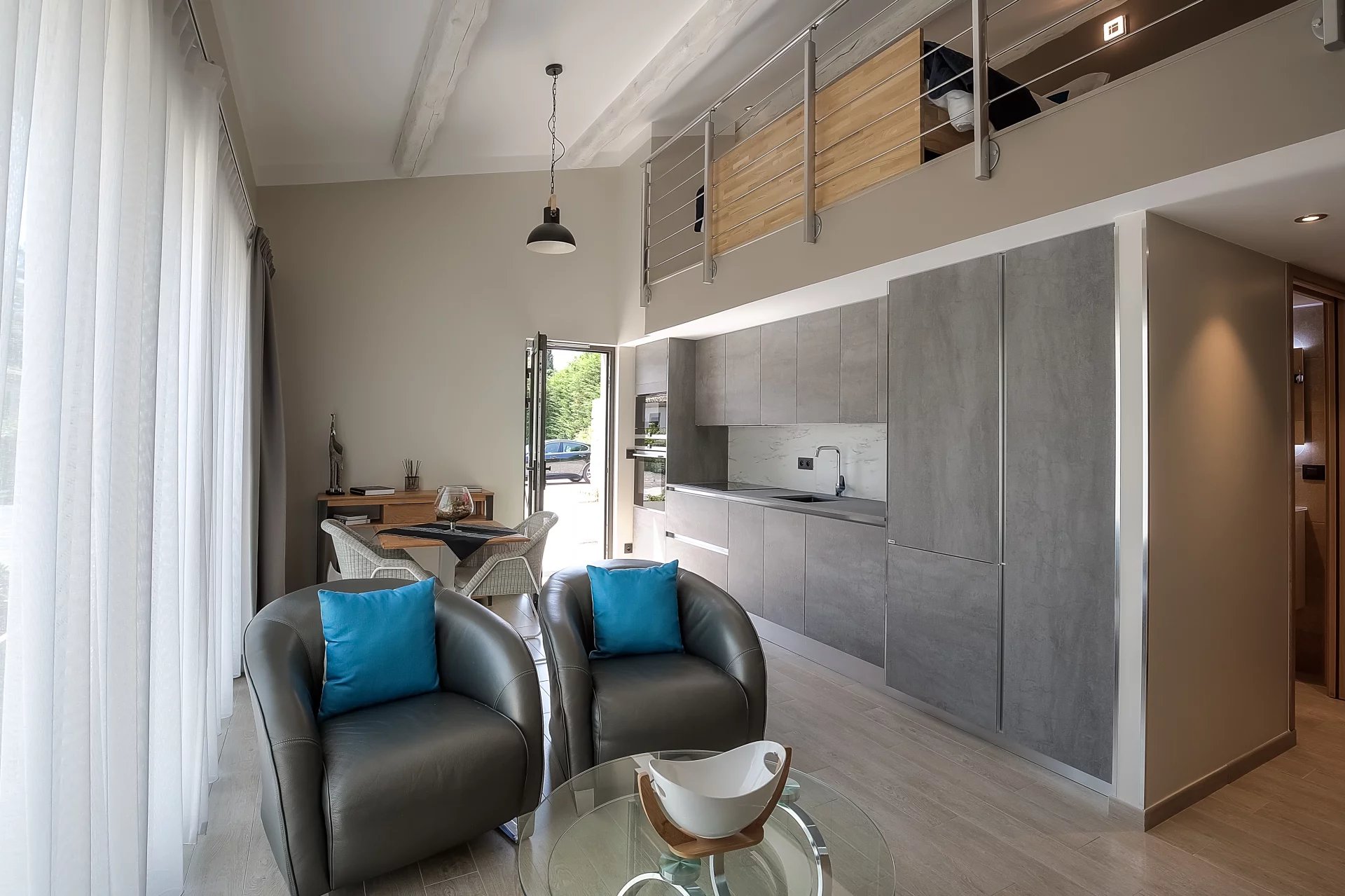 The modern, bright, and pleasant caretaker's house has an open kitchen, a living room, a bathroom, and a mezzanine bedroom.