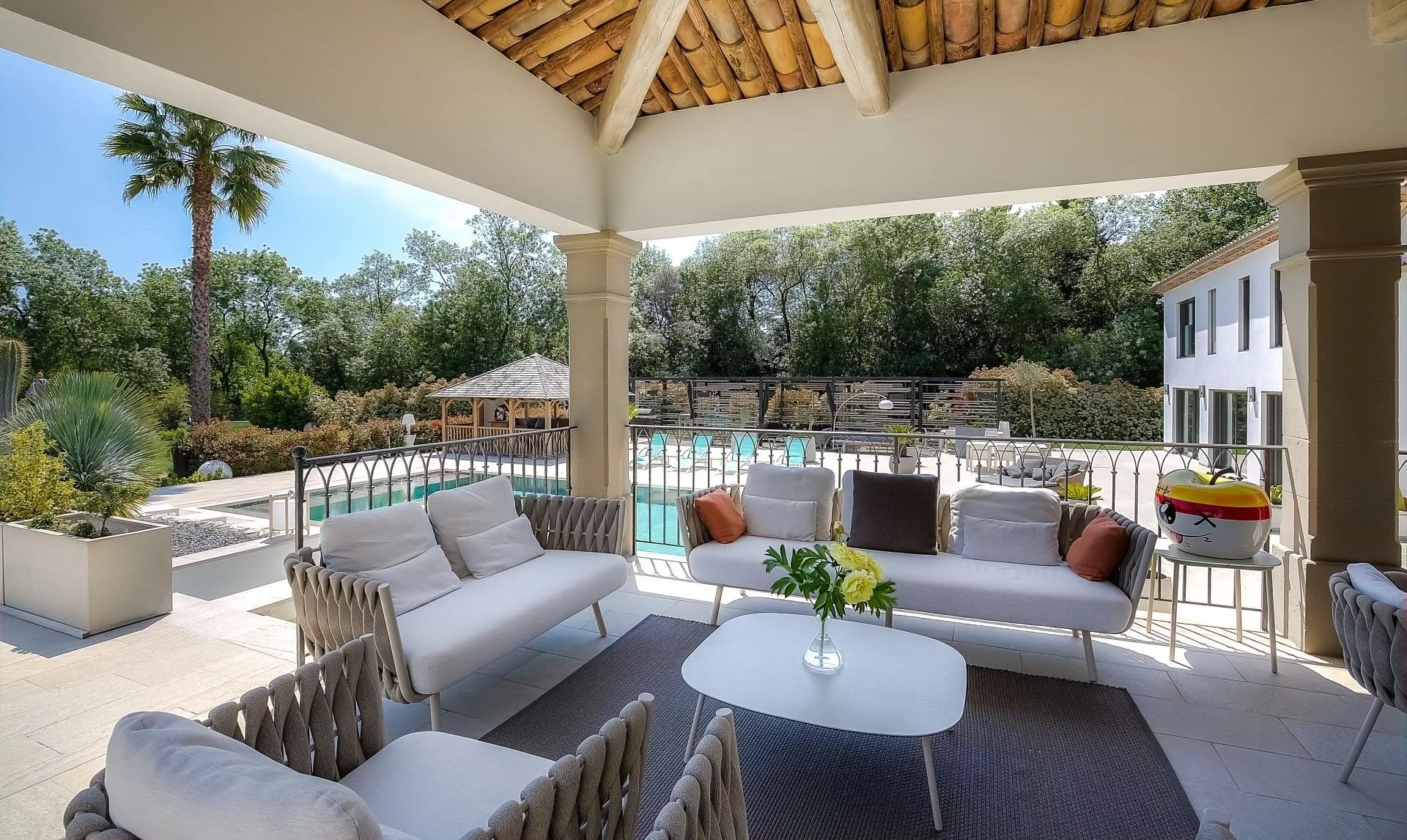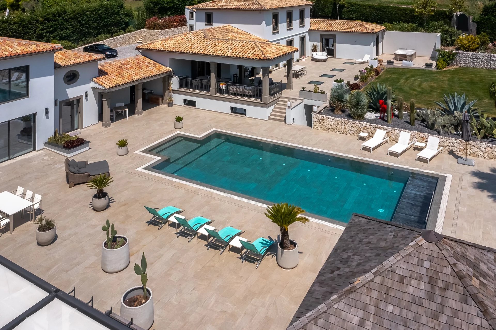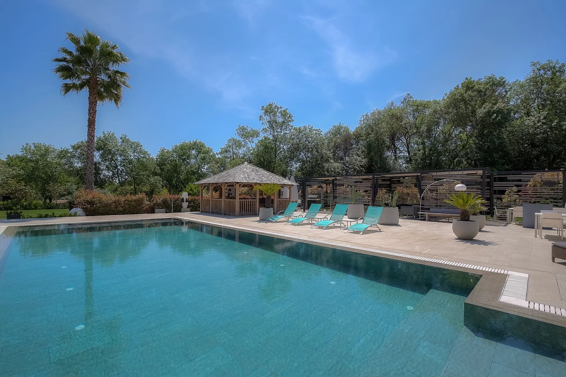 A large heated rectangular mirror pool of 6 x 14 meters and an impressive 600 m² terrace with a pergola and gazebo occupy a central place, offering a vast space for receptions, as well as the terraces, ideal for outdoor dining.