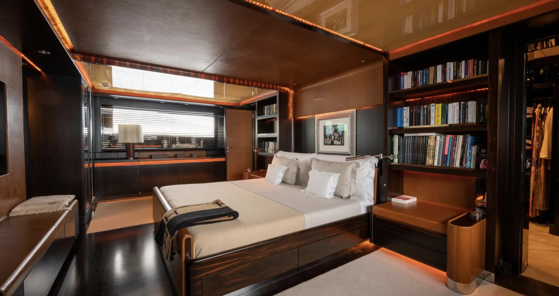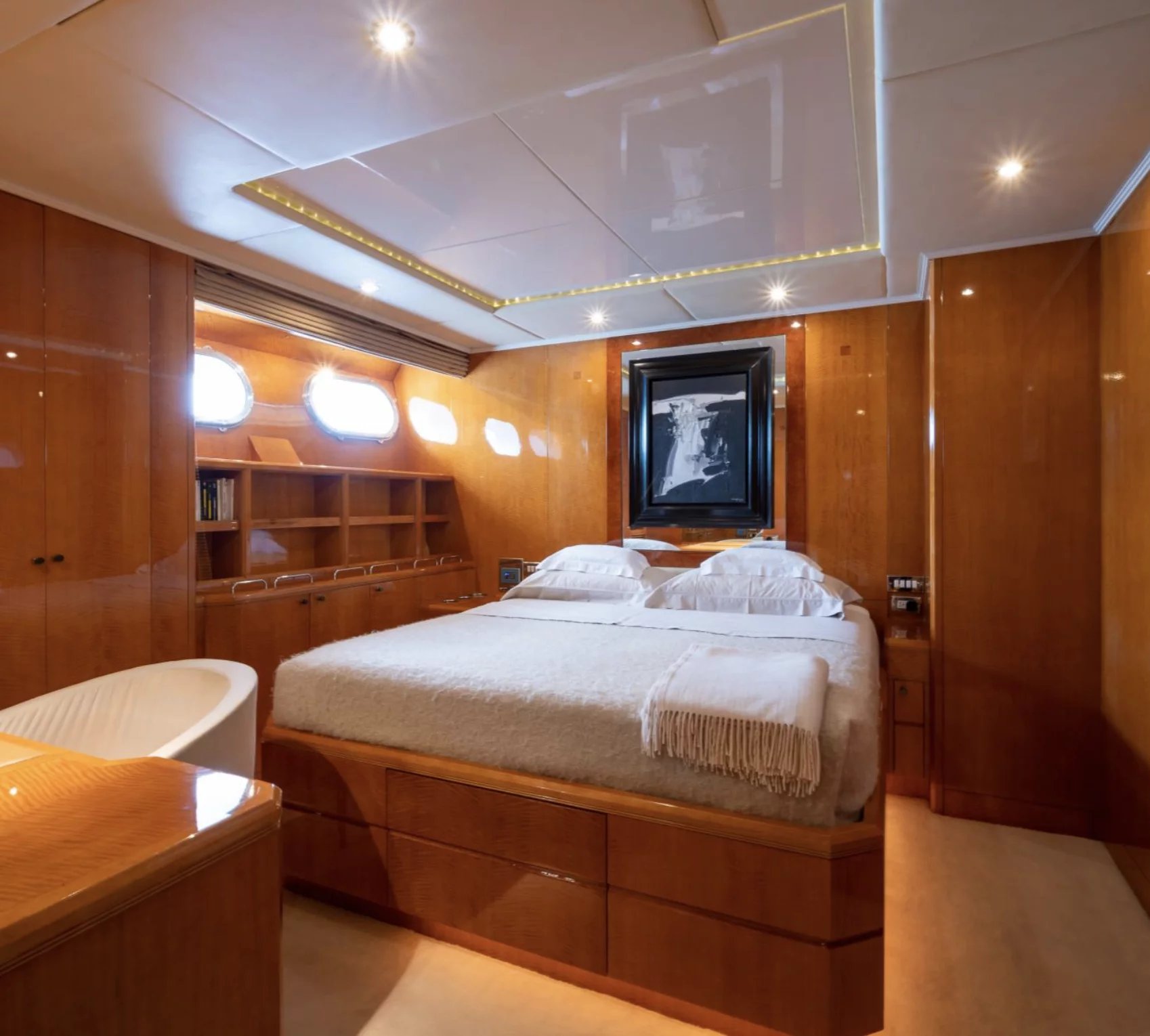 The motor yacht can accommodate as many as 10 guests between five staterooms, including a full-beam main deck master stateroom with a large office, wardrobes and an ensuite. The additional staterooms are located on the lower deck.