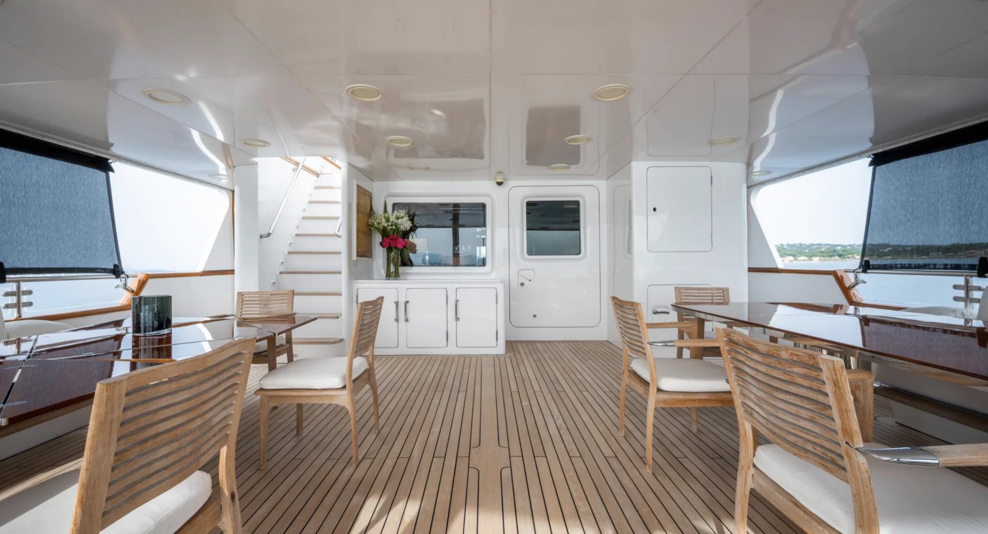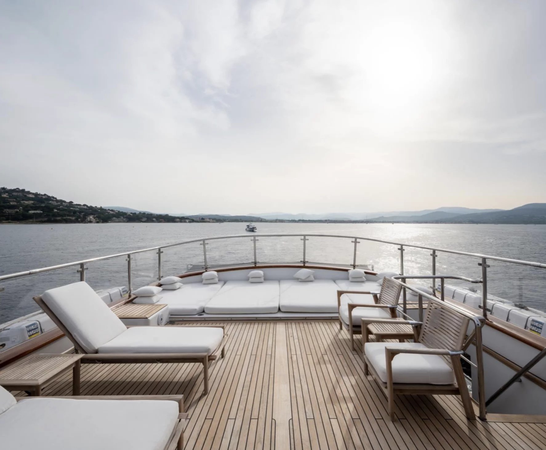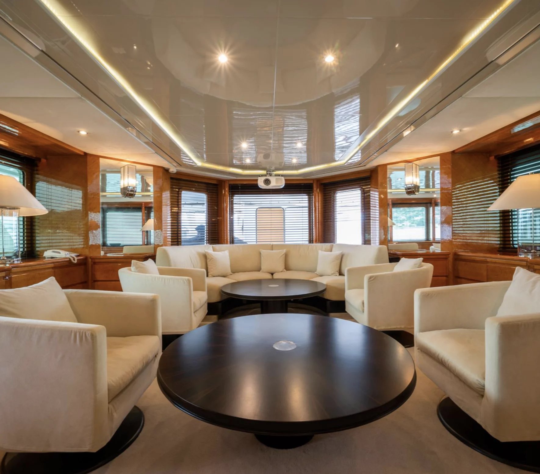 Her main deck has a large open saloon with an array of cream sofas and two circular tables. The main deck also features the large galley.