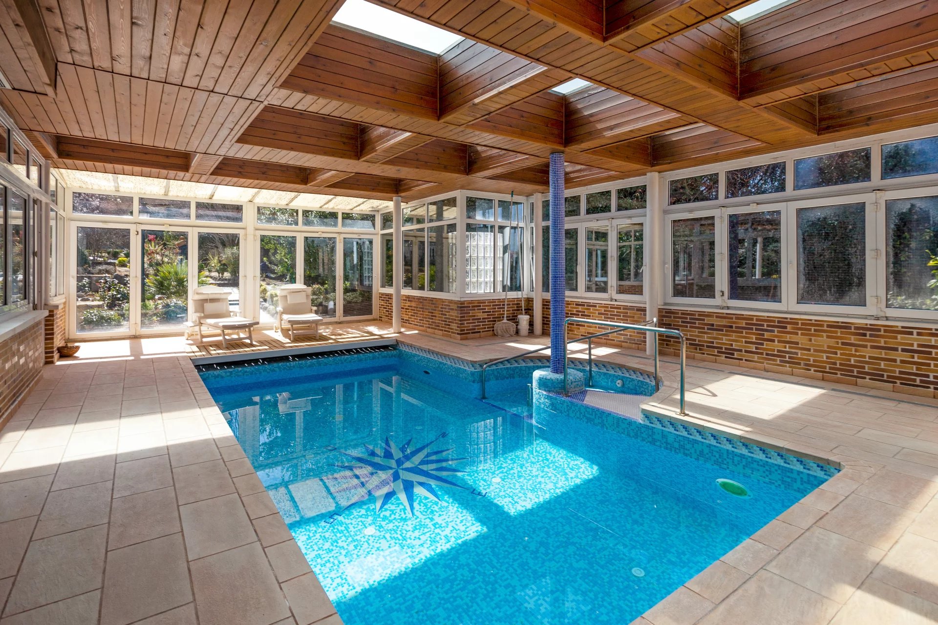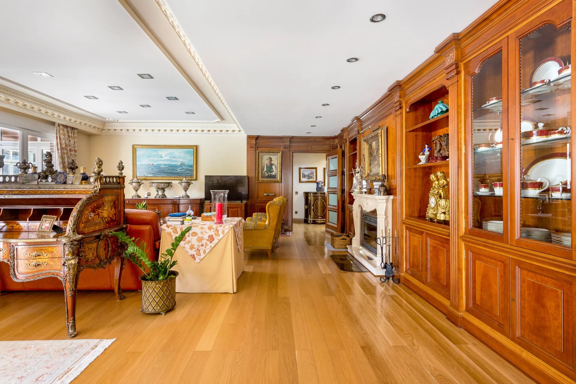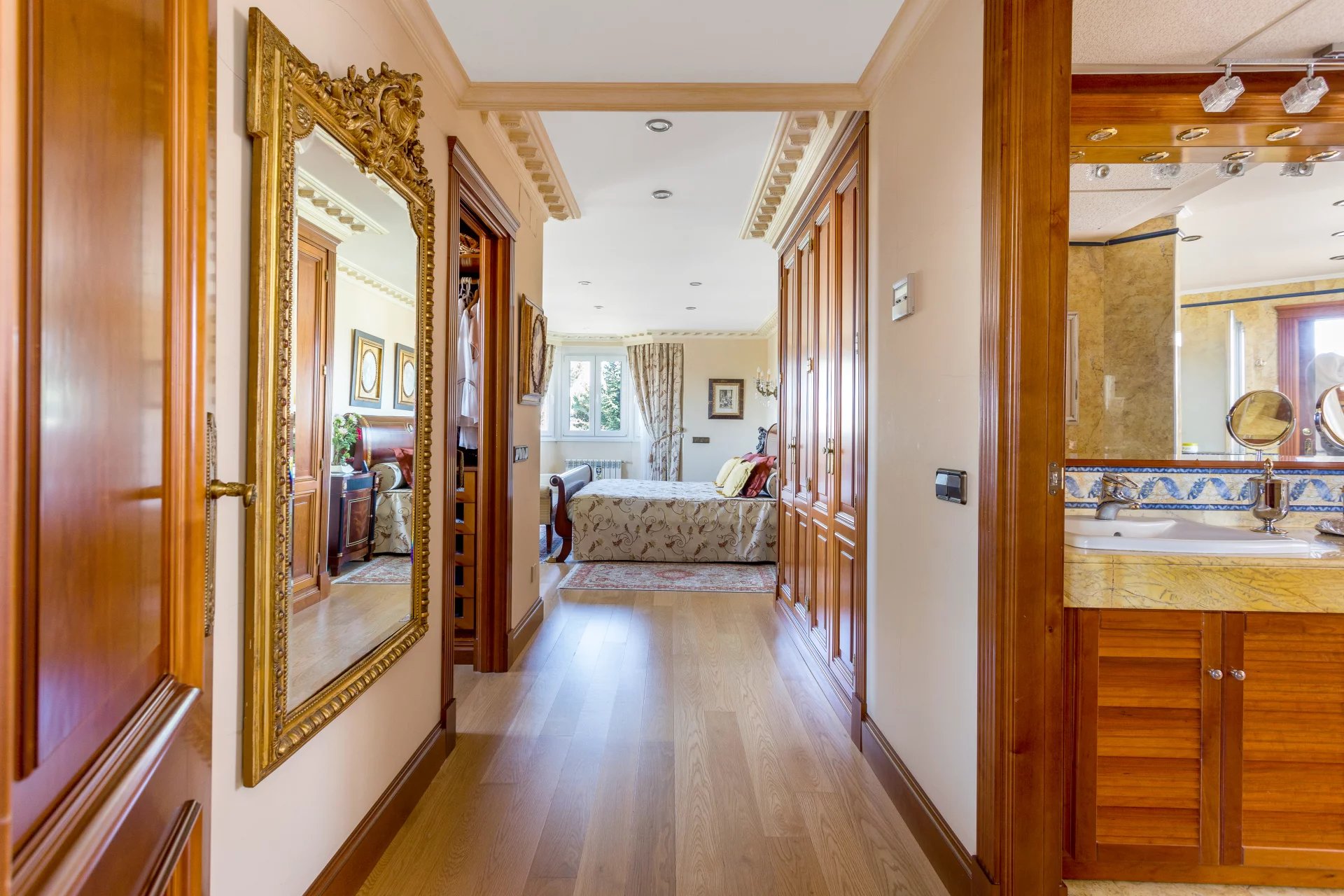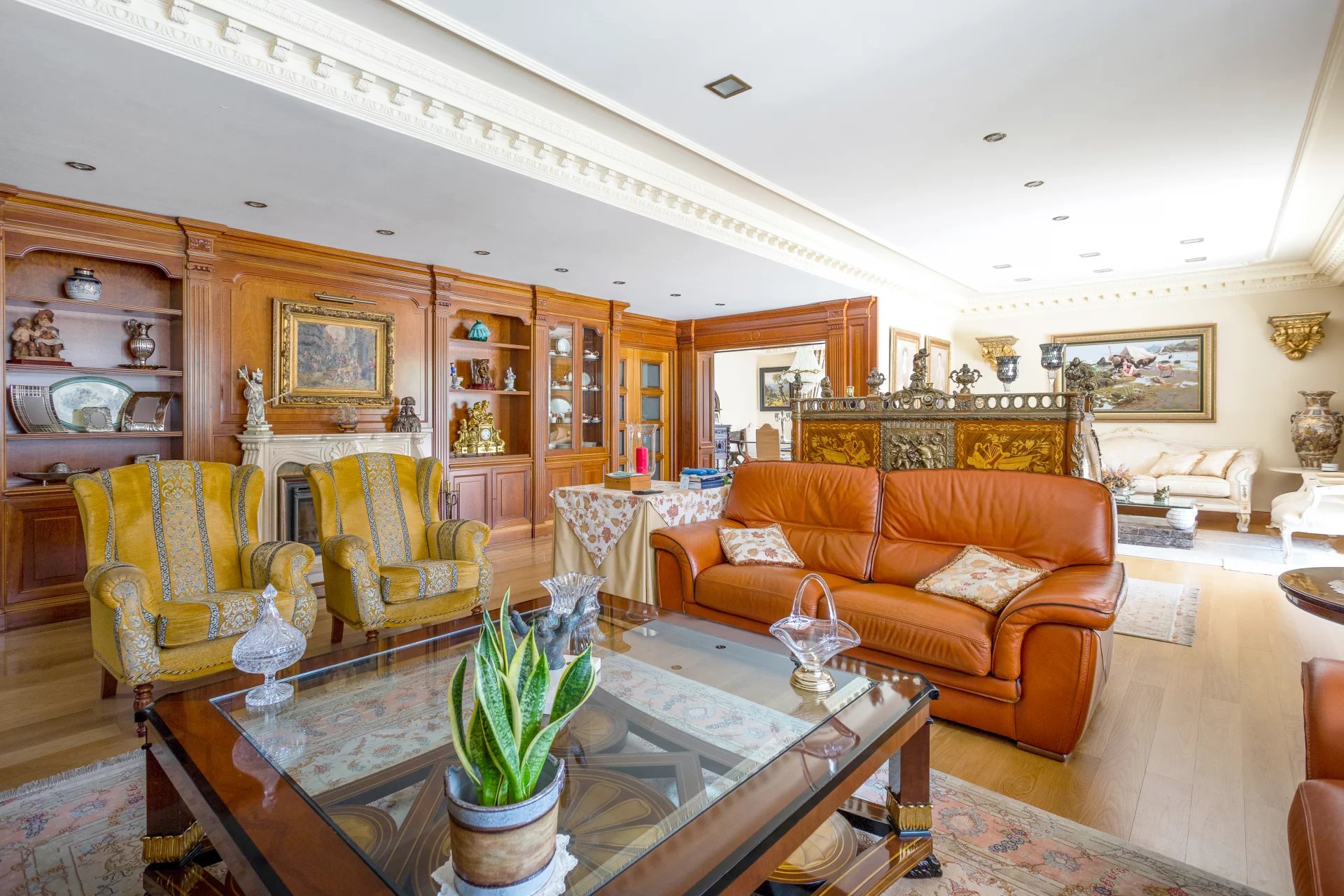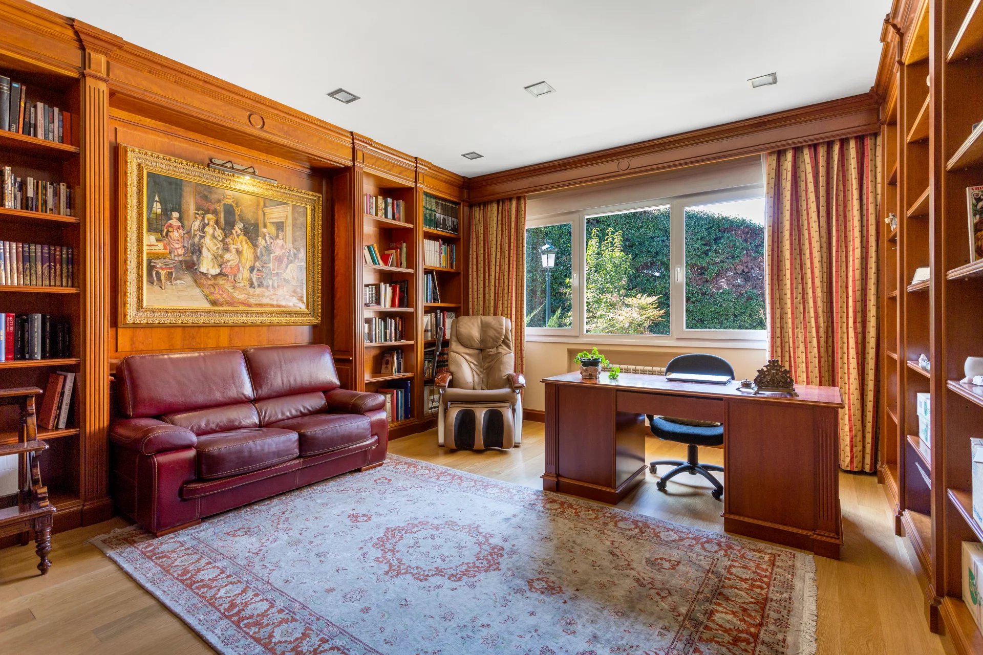 In the more private area of this first floor there is a library, an office with walnut bookcases, a guest toilet, and two bedrooms with en-suite bathrooms each. There is also direct access to the heated swimming pool.