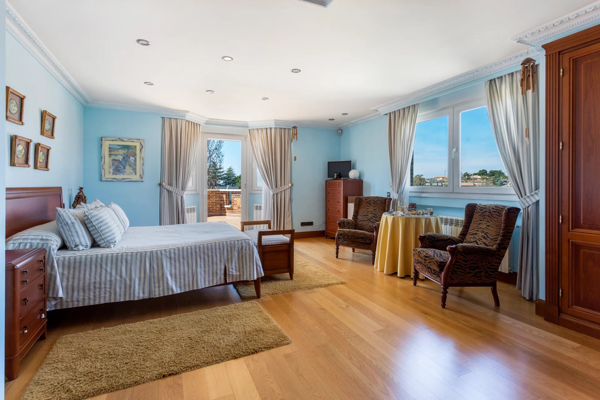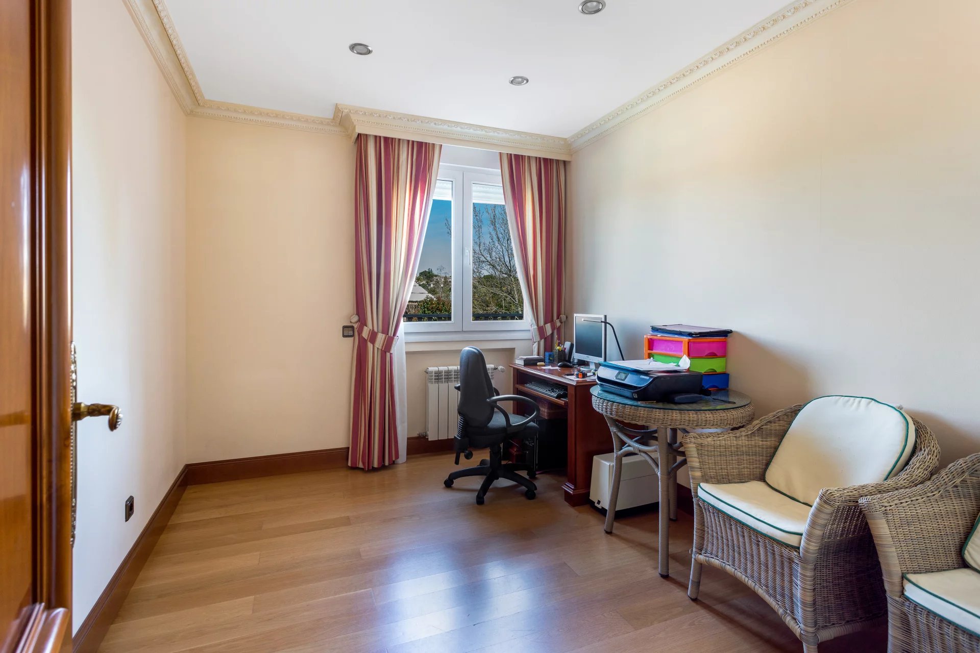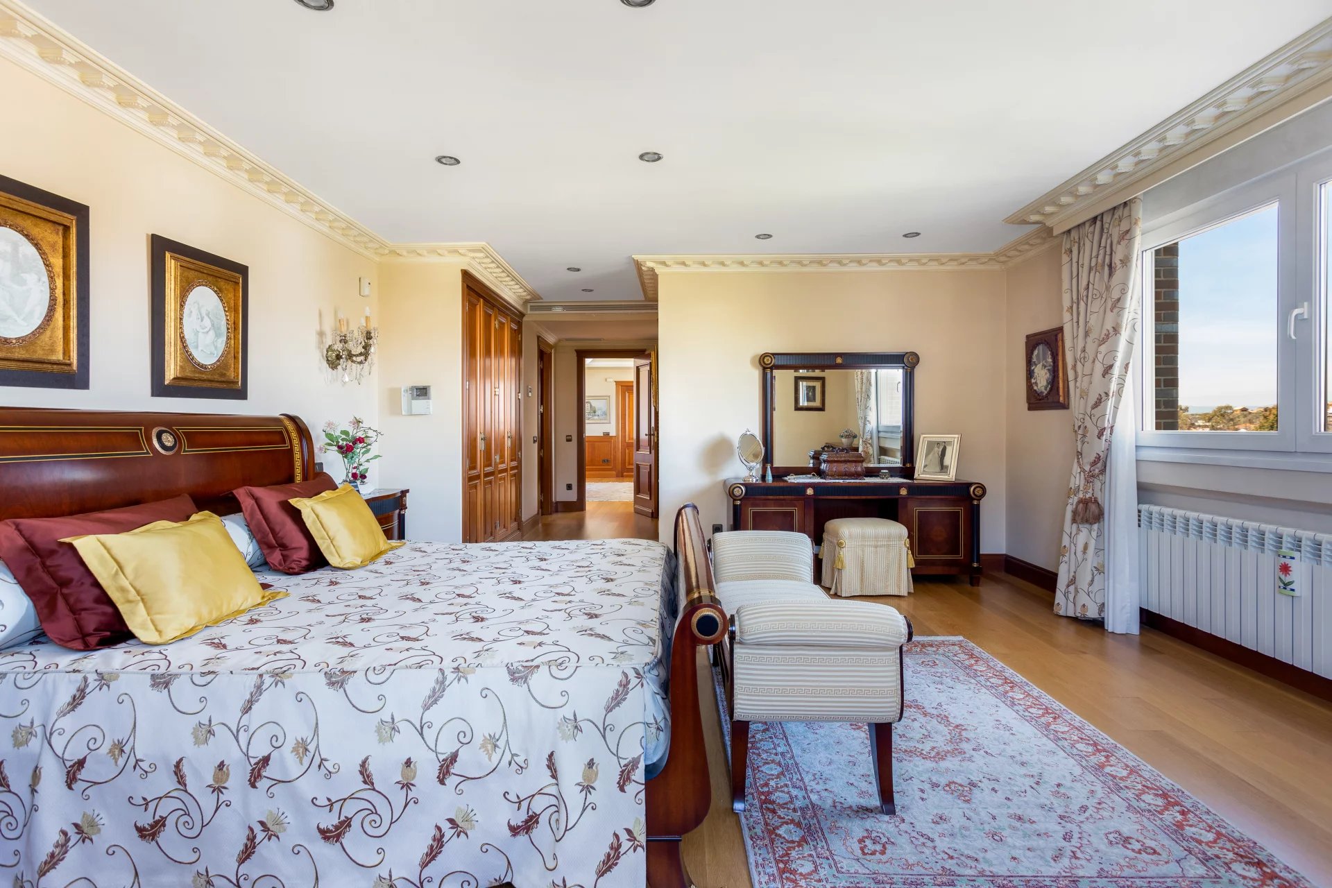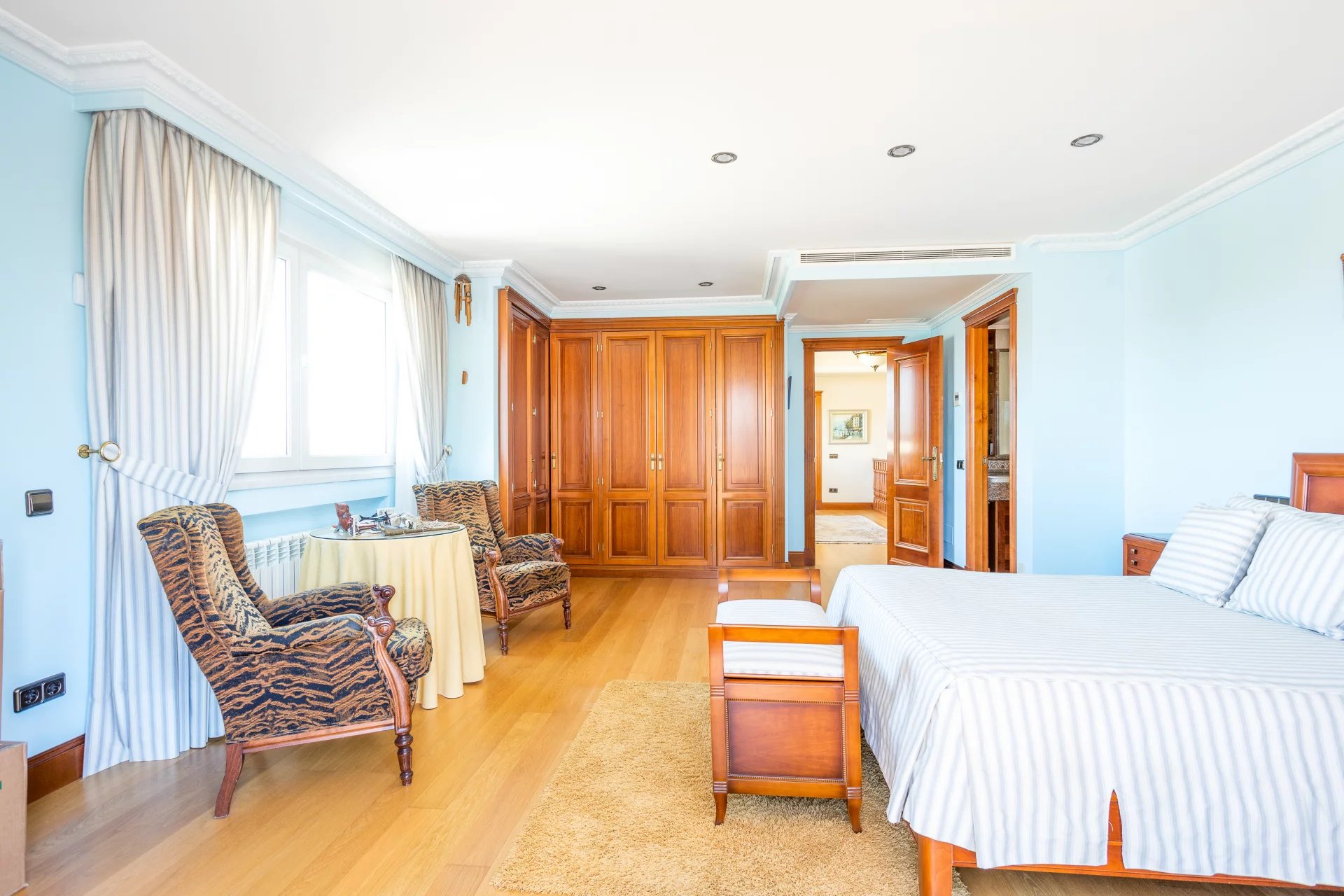 In the more private area of this first floor there is a library, an office with walnut bookcases, a guest toilet, and two bedrooms with en-suite bathrooms each. There is also direct access to the heated swimming pool.