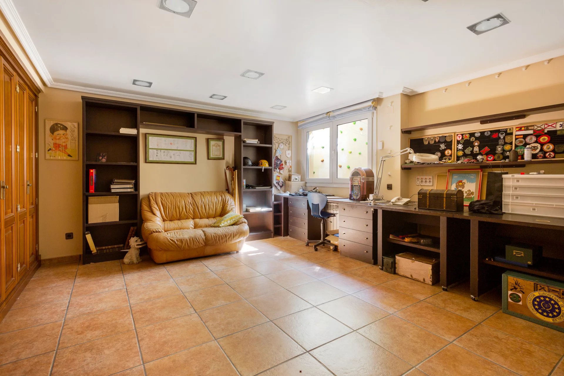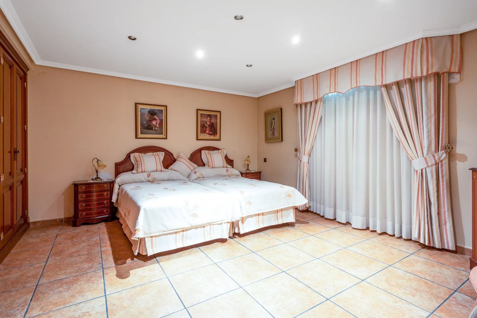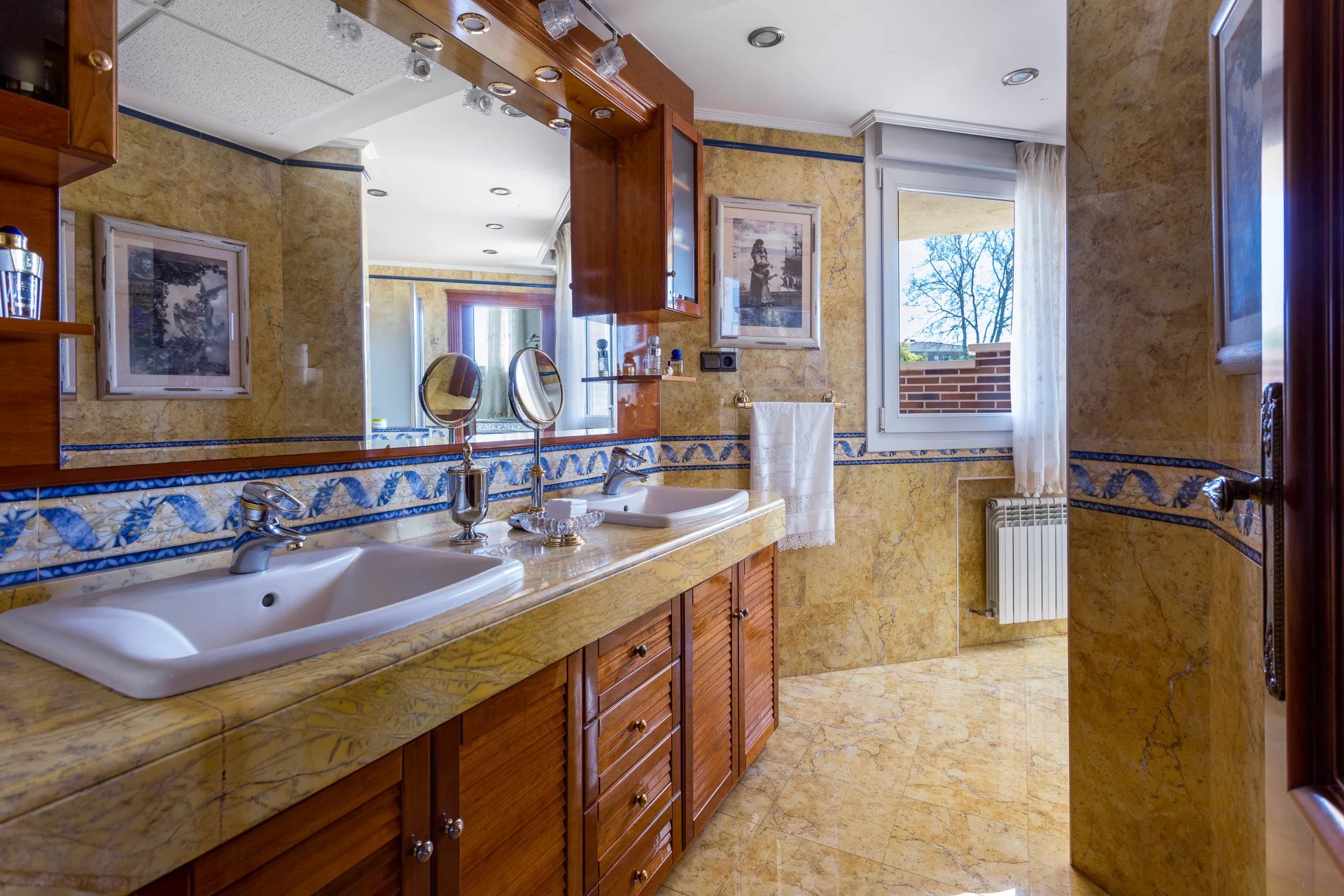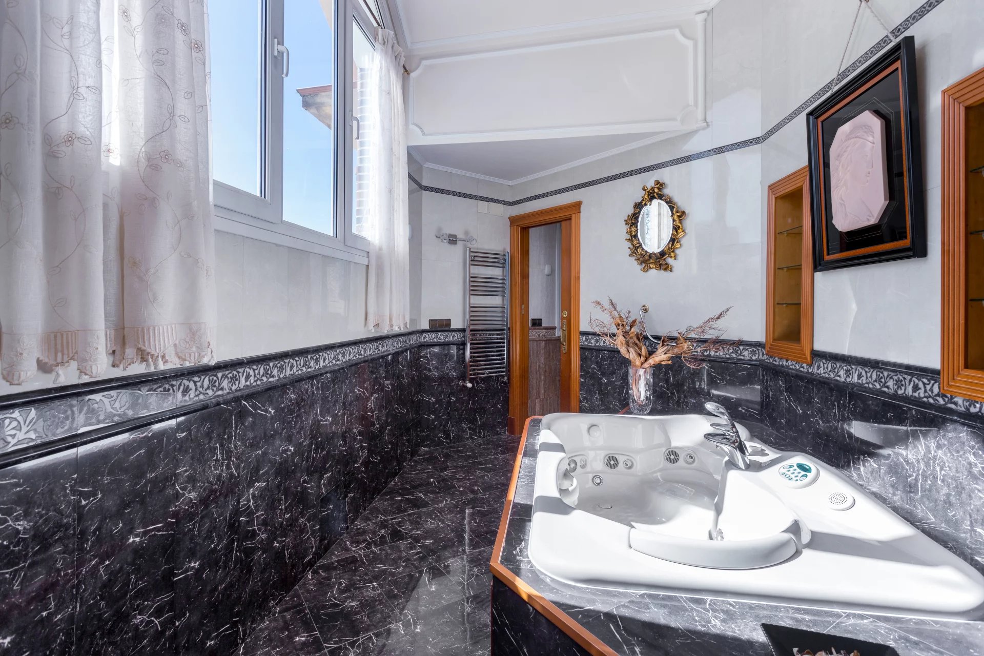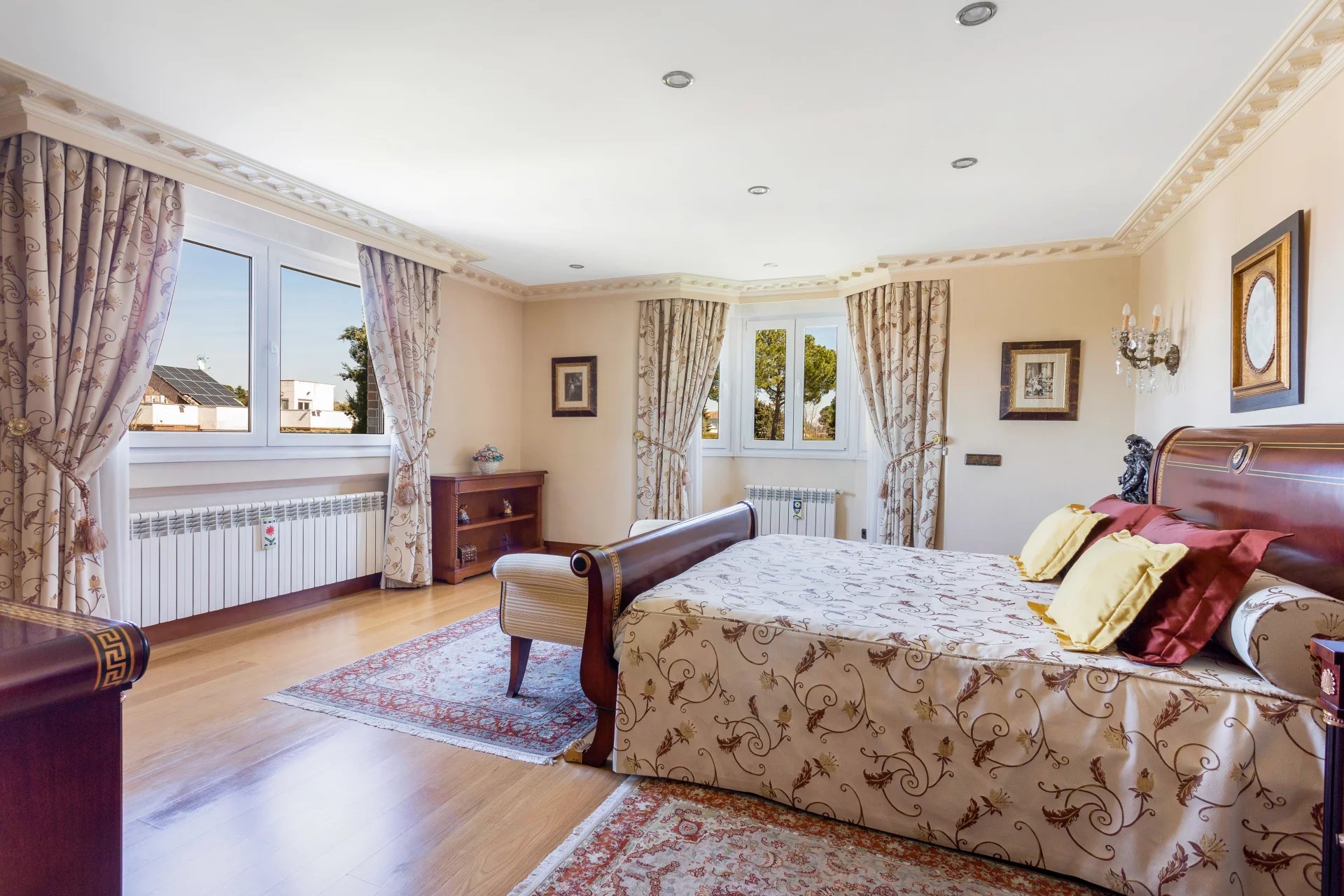 In the more private area of this first floor there is a library, an office with walnut bookcases, a guest toilet, and two bedrooms with en-suite bathrooms each. There is also direct access to the heated swimming pool.