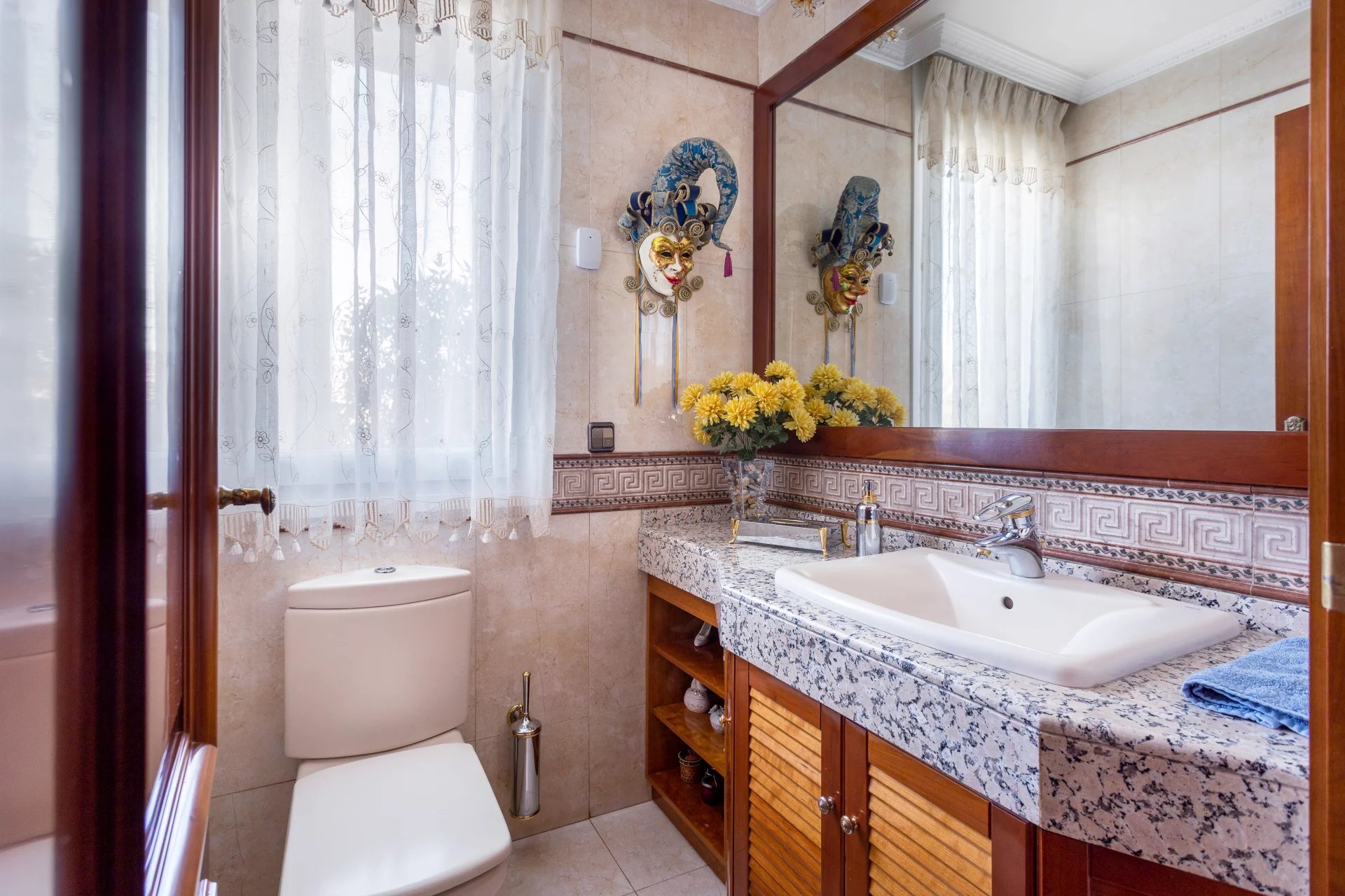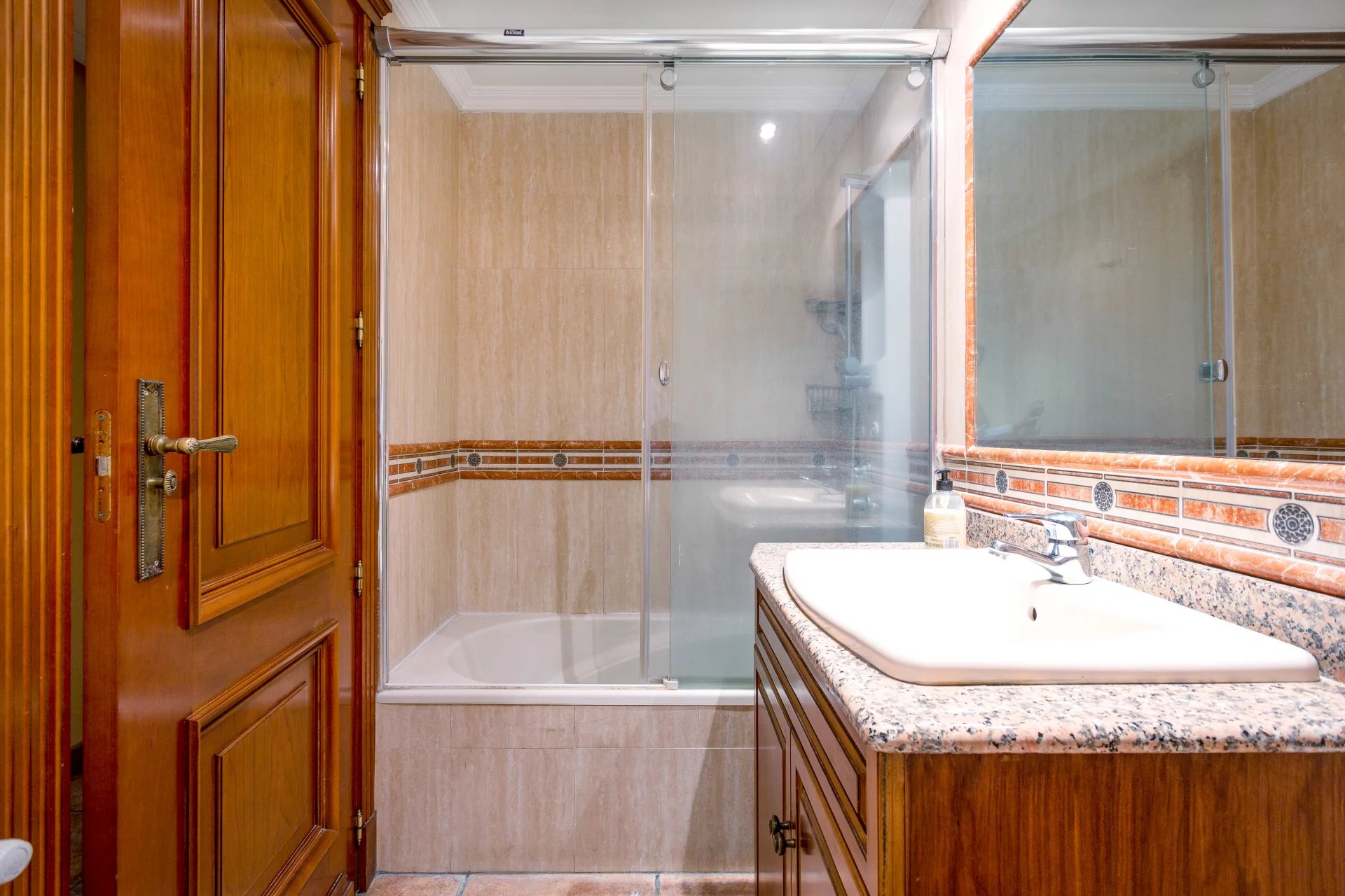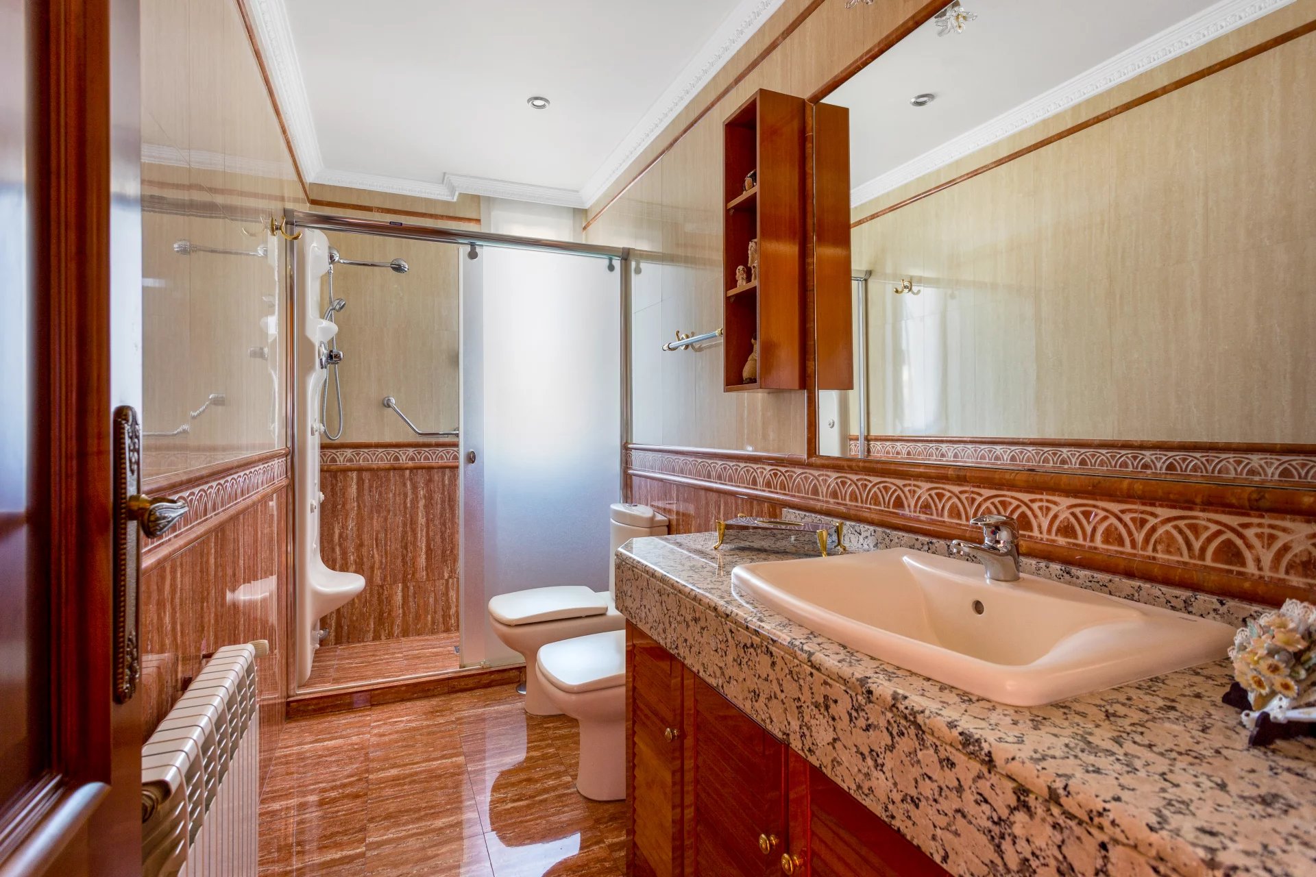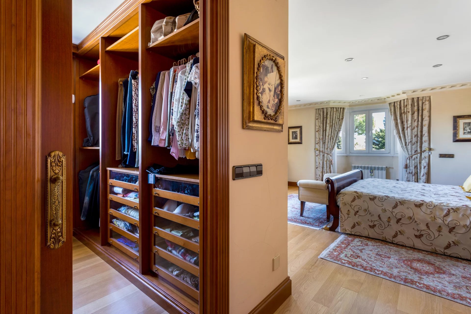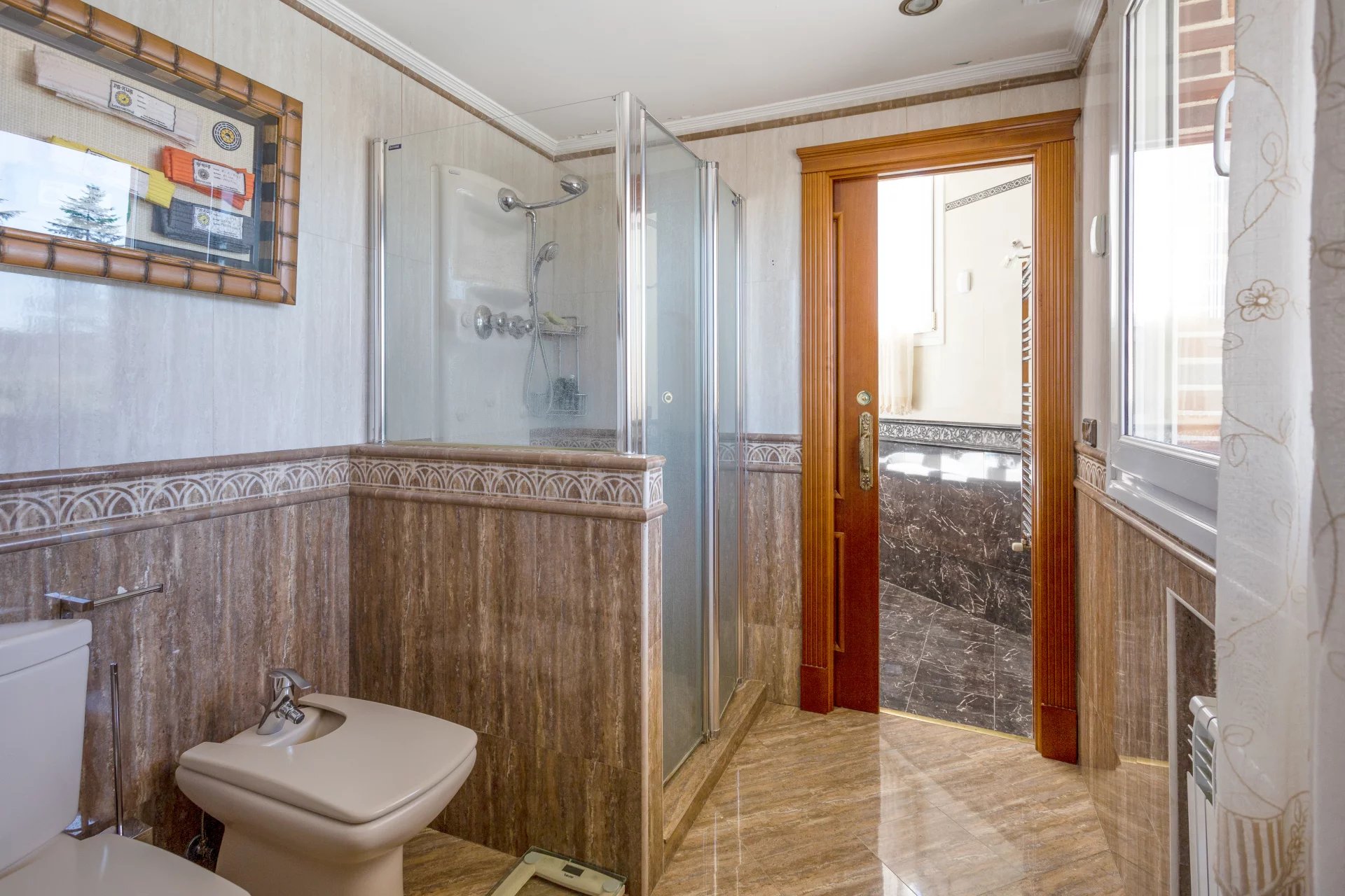 In the more private area of this first floor there is a library, an office with walnut bookcases, a guest toilet, and two bedrooms with en-suite bathrooms each. There is also direct access to the heated swimming pool.