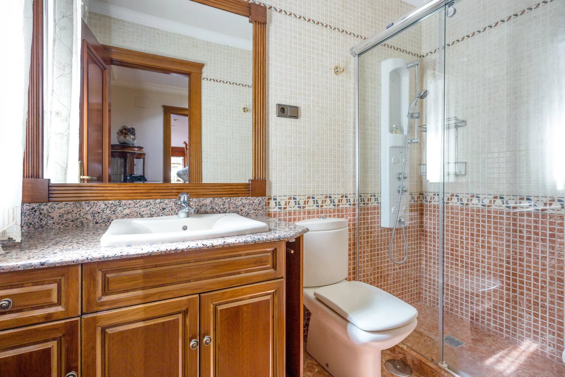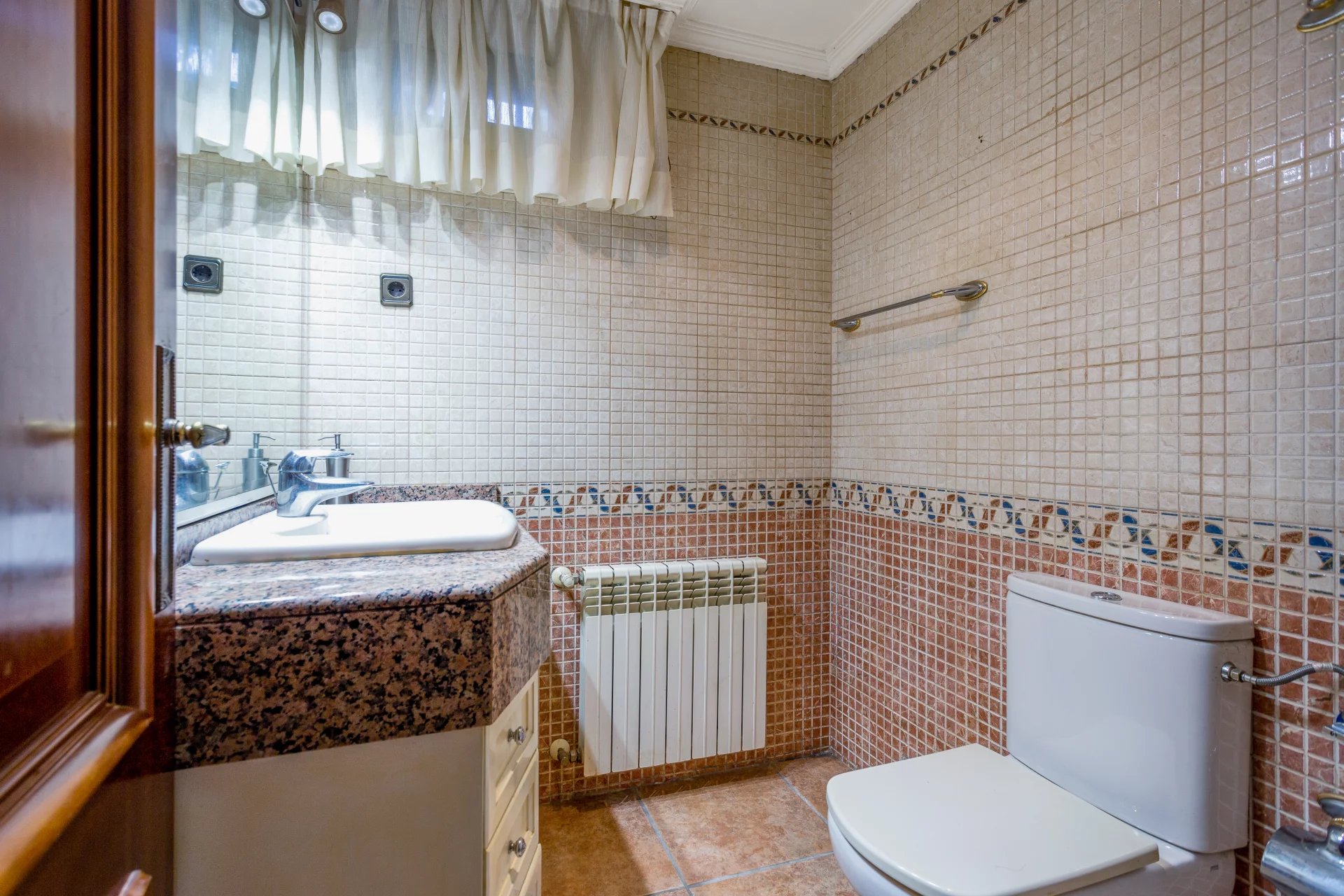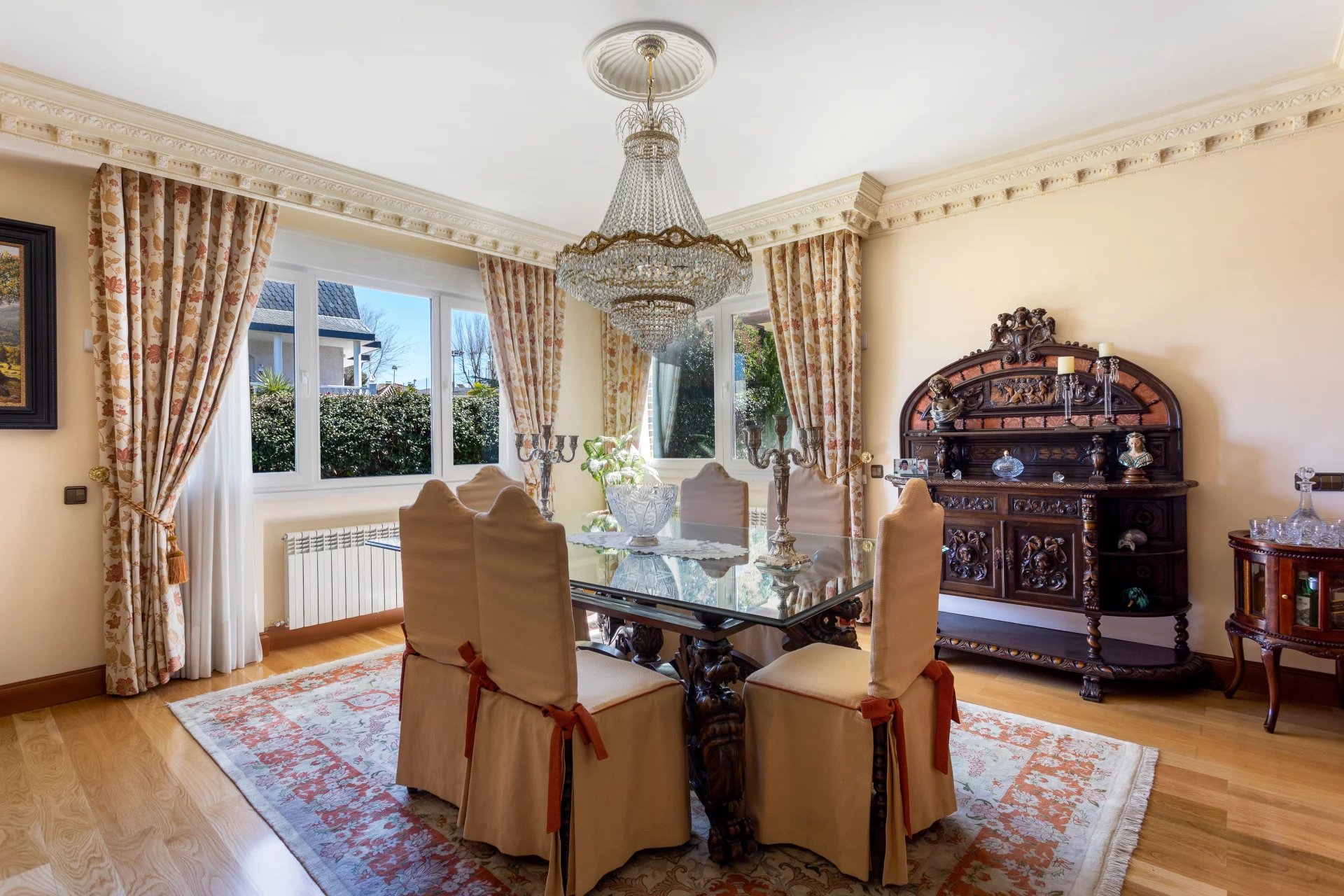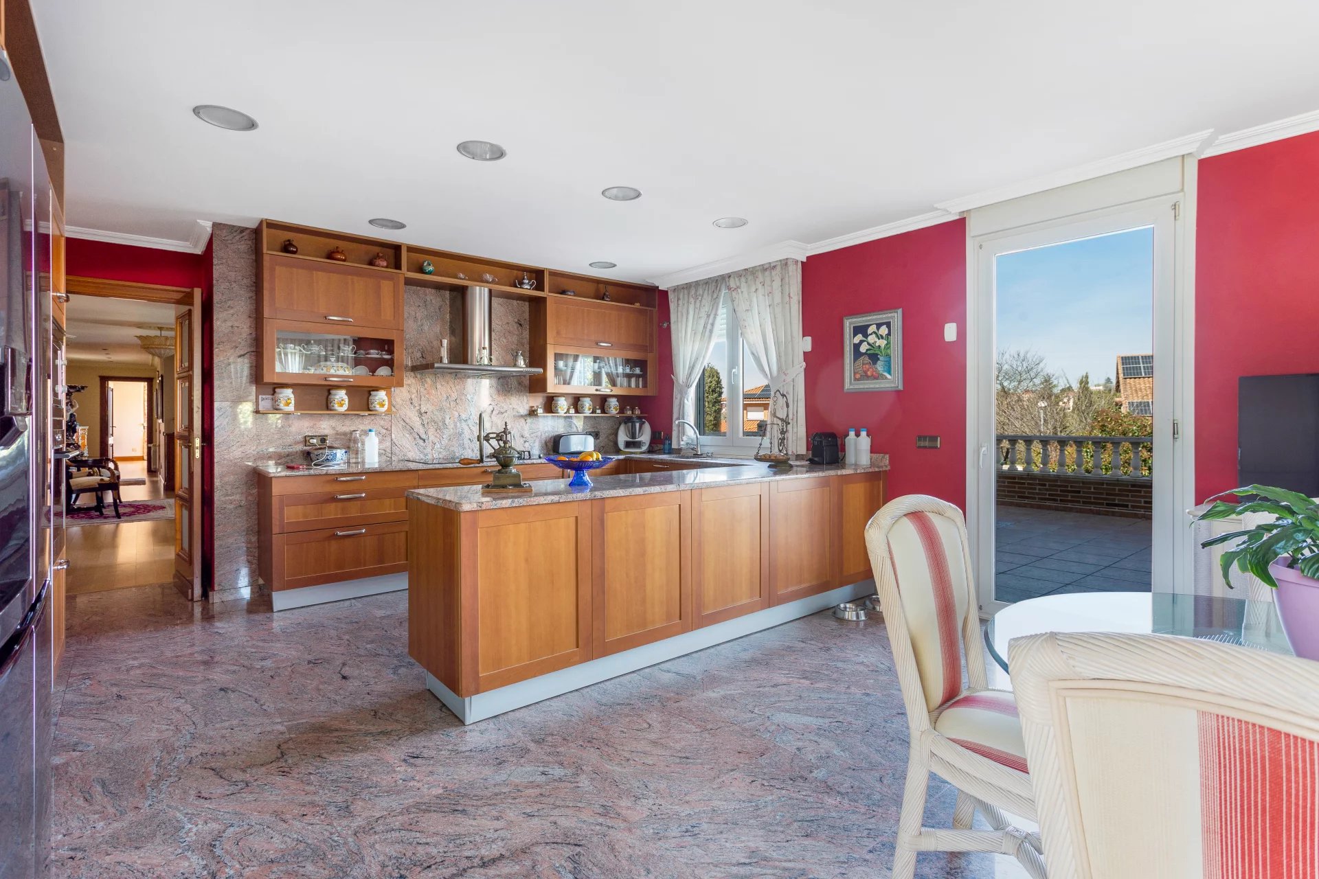 The ground floor has direct access to the garden, and the swimming pool is in the public area, as well as a magnificent entrance hall connecting the other two floors. The immense living room with fireplace is connected to a large dining room with access to the enormous porch and the garden, and the main dining room is connected to the kitchen and has a huge terrace of some 50m² with views of the mountains.