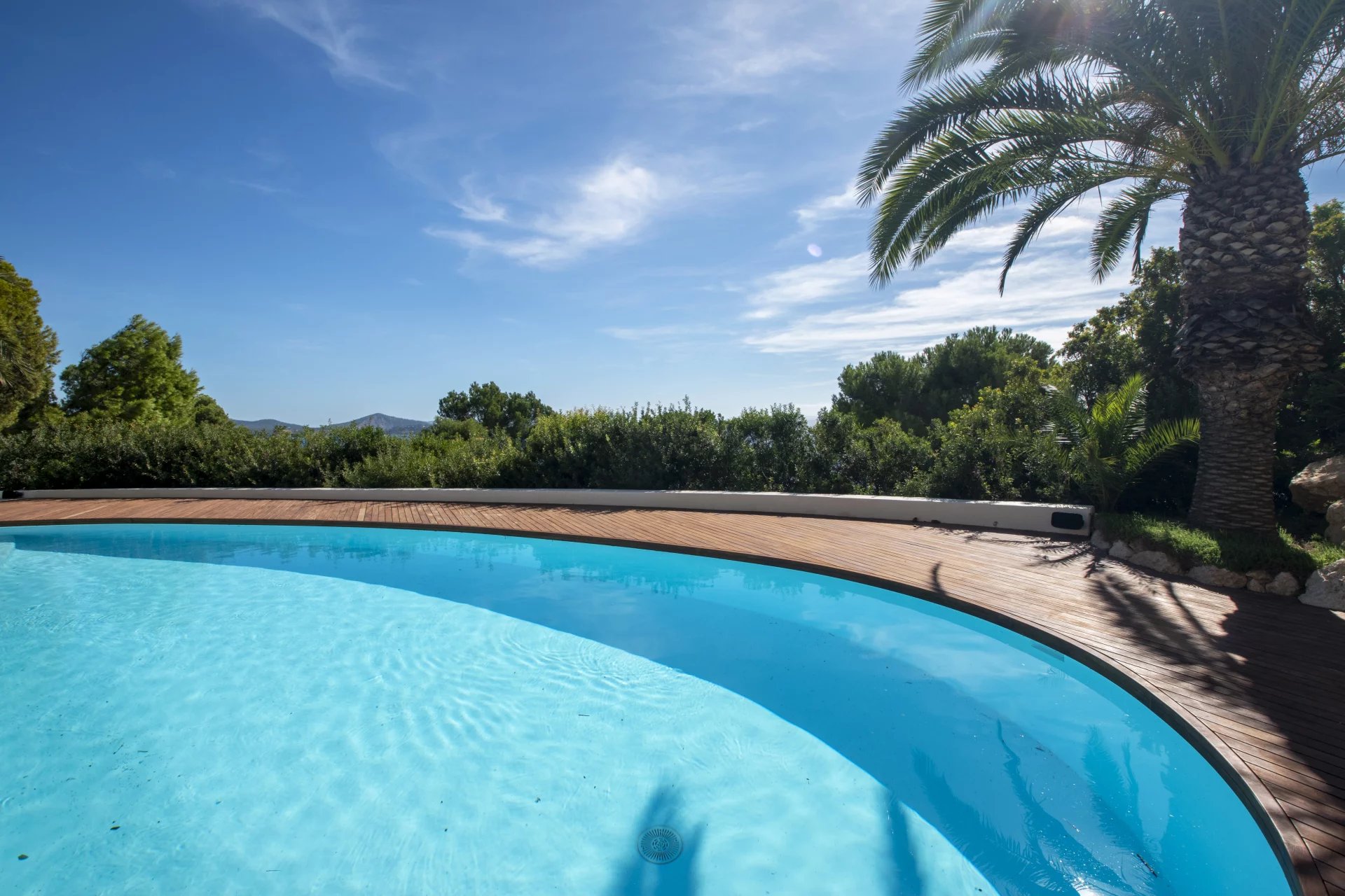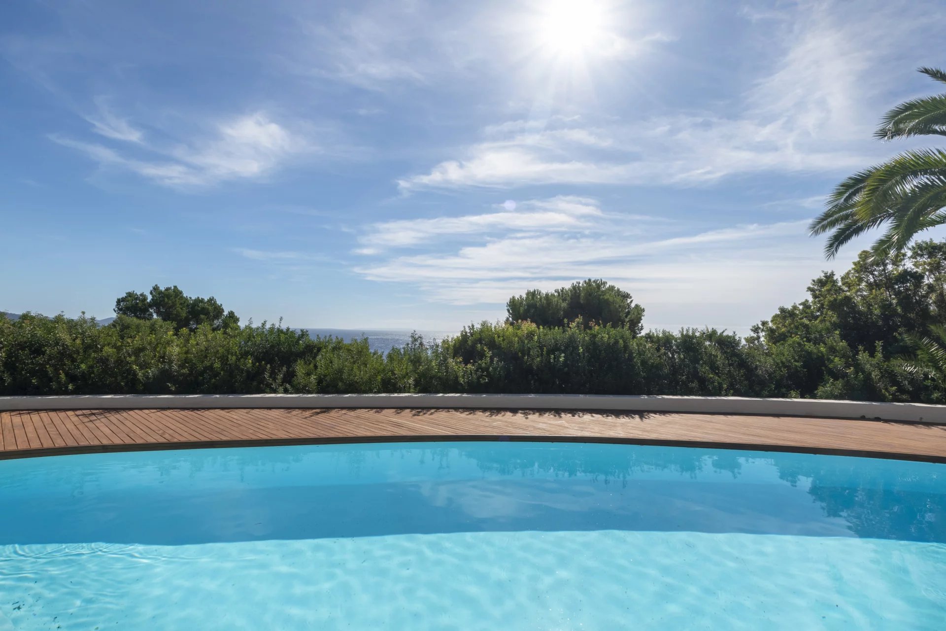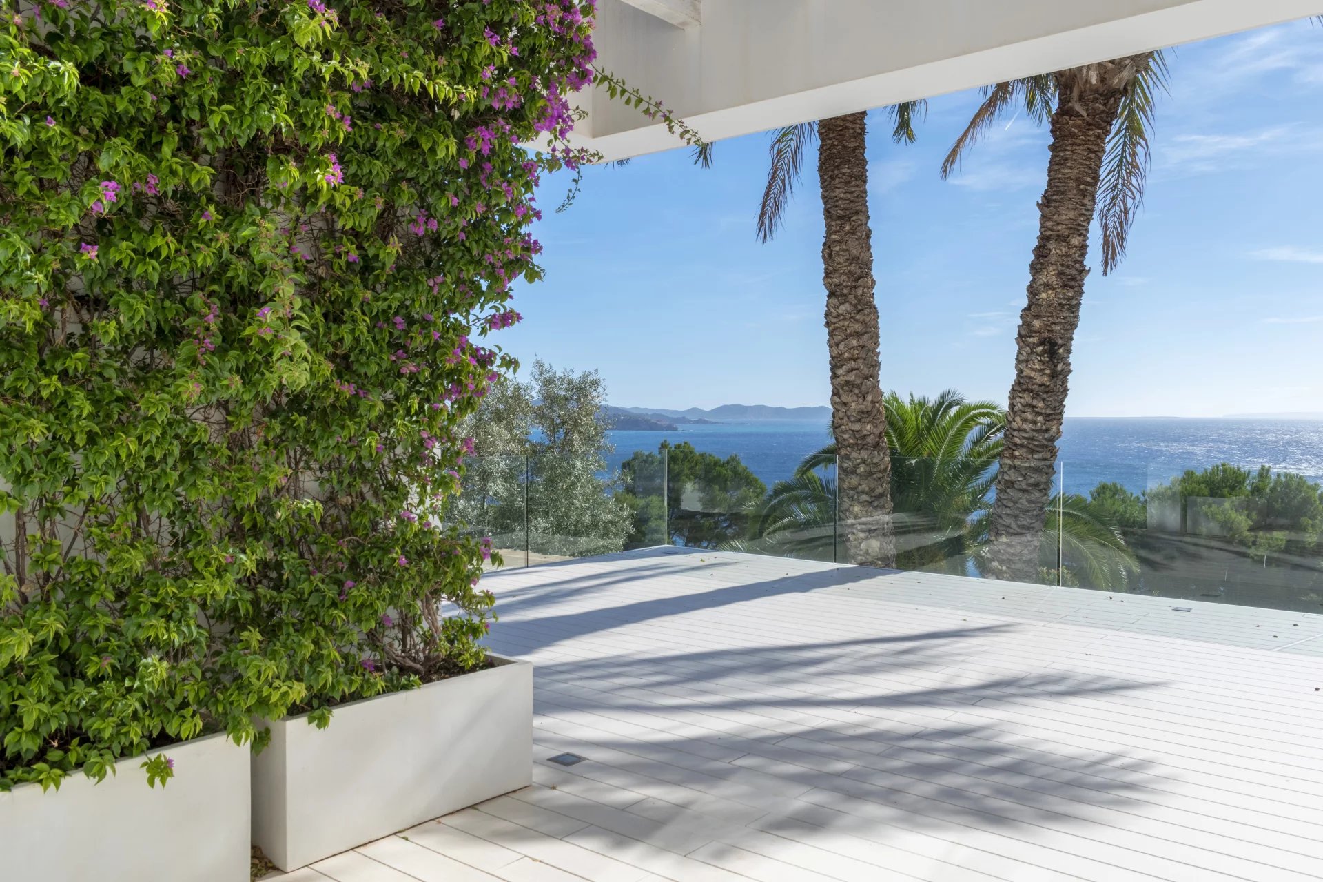 Spread across two levels, the upper floor hosts a grand master suite with a luxurious en-suite bathroom and four additional bedrooms, each with its own full bathroom. Expansive terraces and manicured gardens provide breathtaking views over the sparkling Mediterranean Sea.