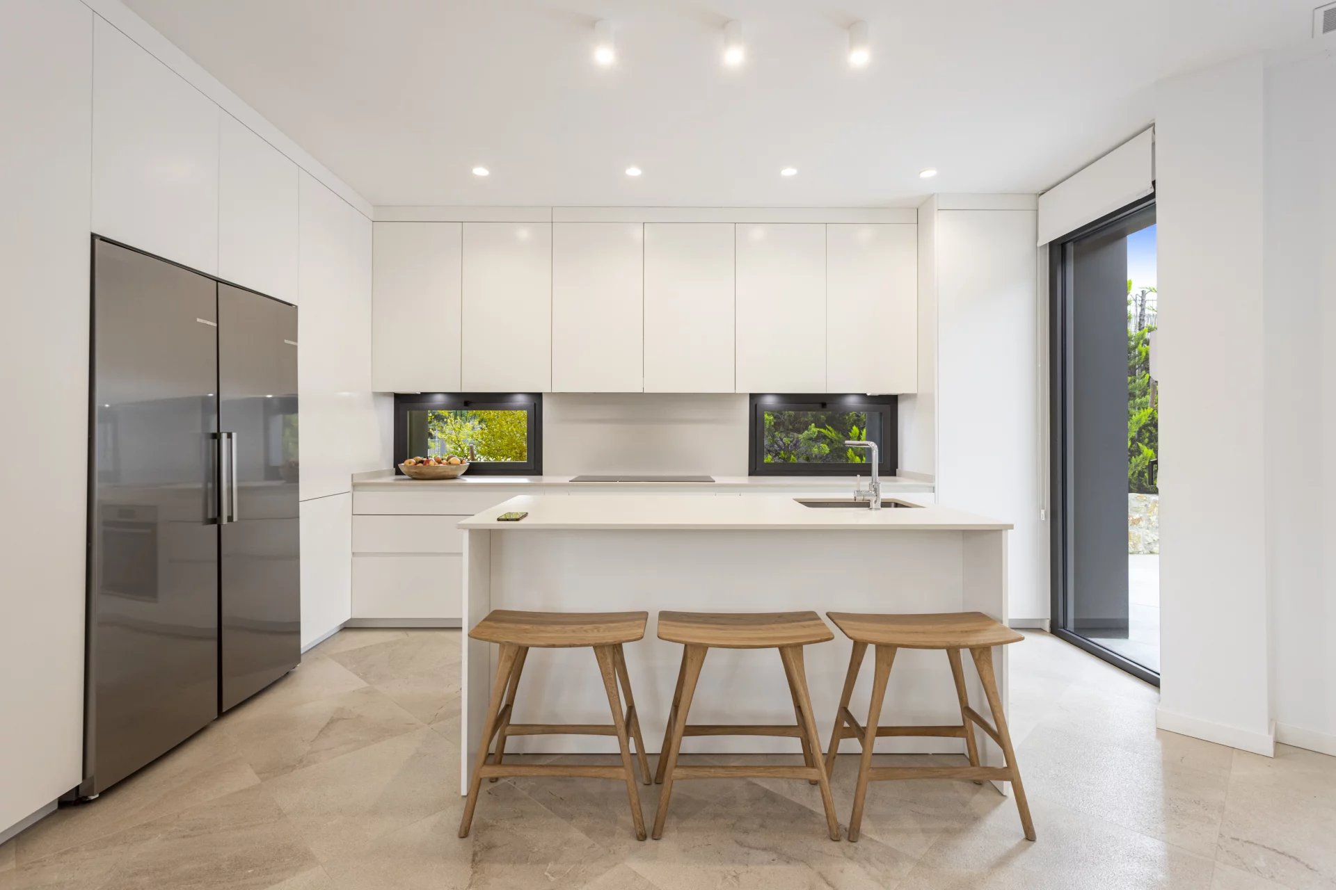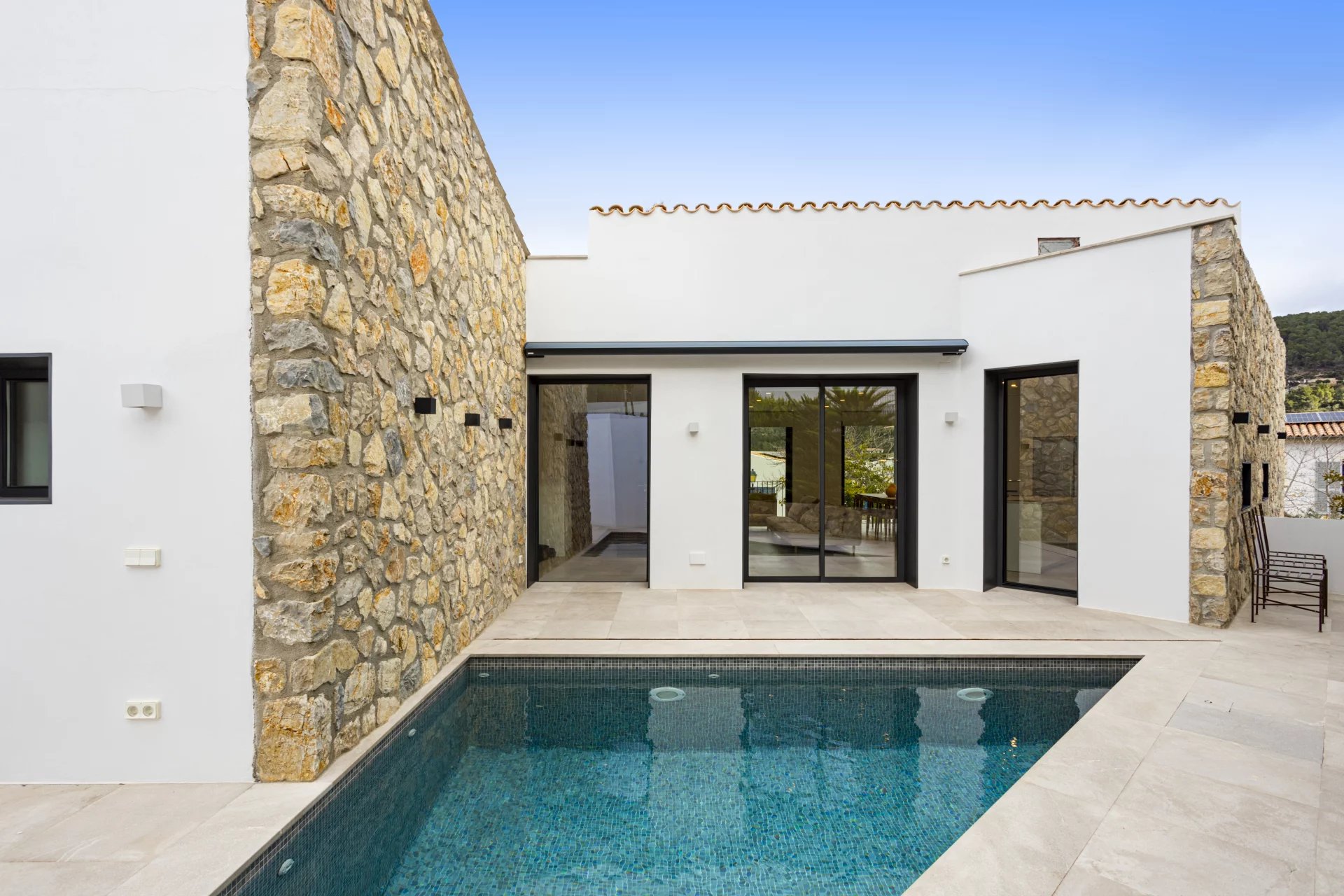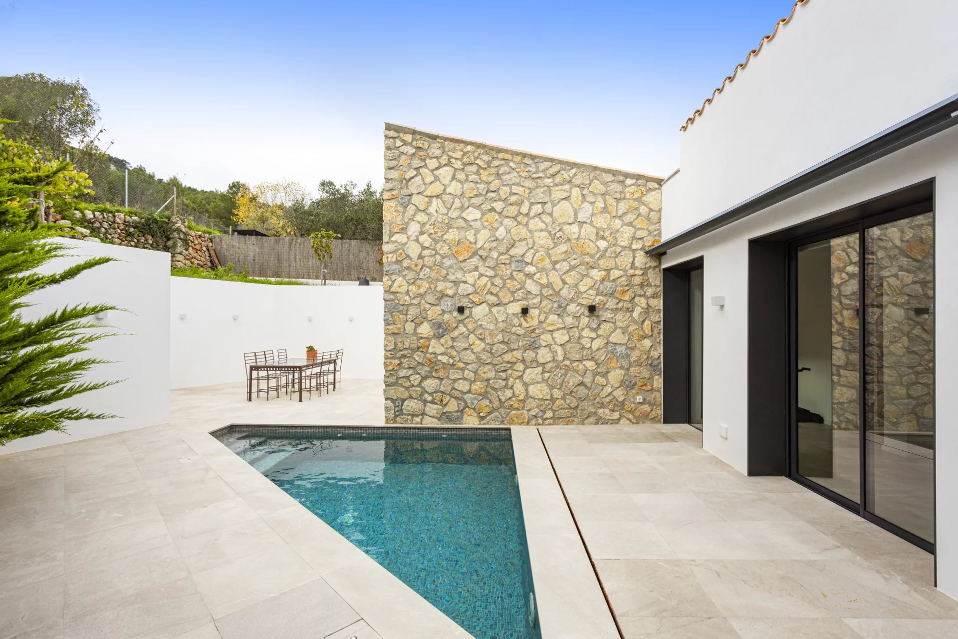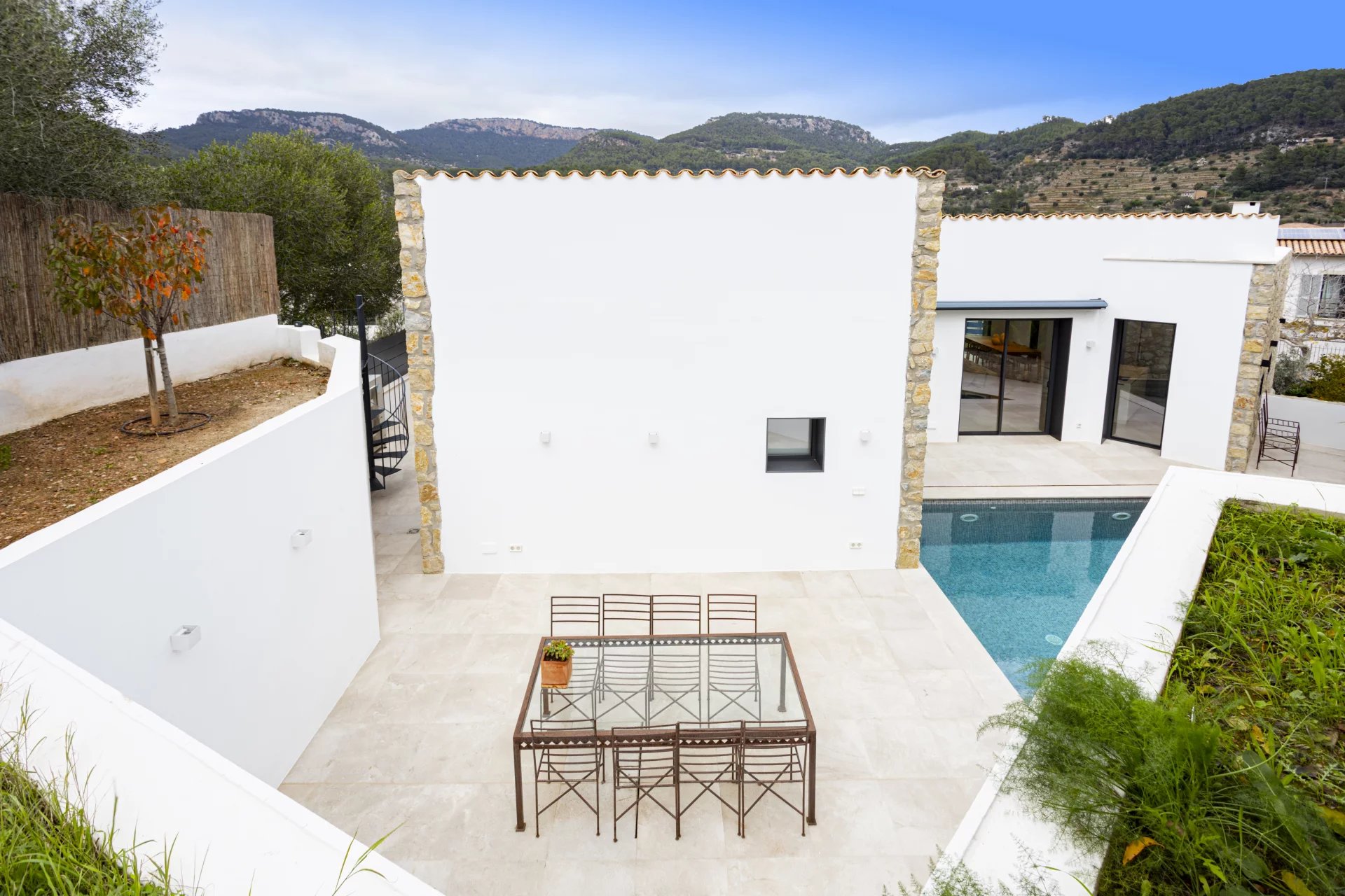 The house features 3 bedrooms, including two double bedrooms and one single bedroom, as well as two full bathrooms. The spacious living-dining area with an integrated kitchen creates an open, bright, and welcoming space with direct access to the terrace and the pool, where you can enjoy a privileged setting with total privacy and panoramic views of the Tramuntana Mountains.