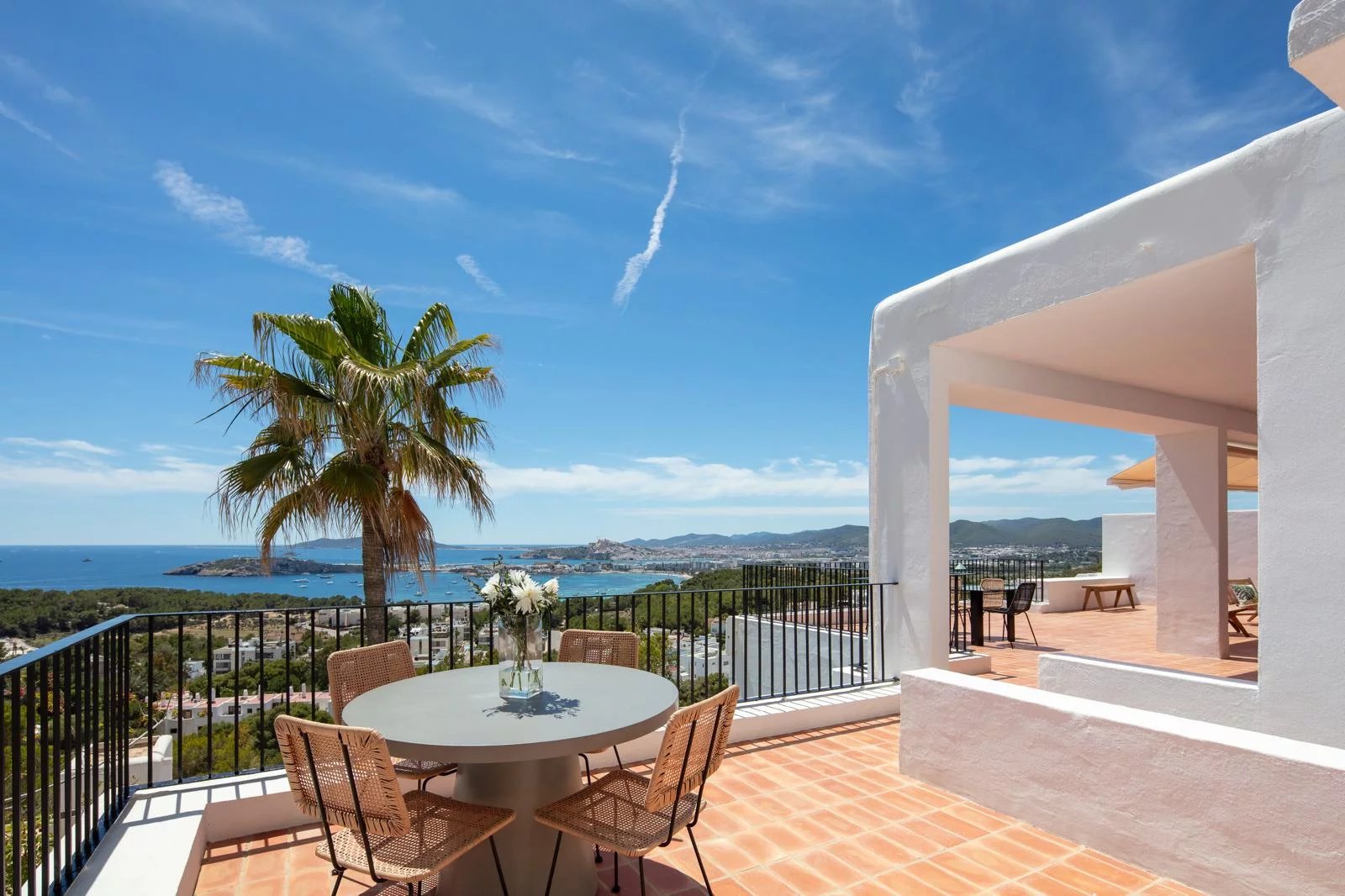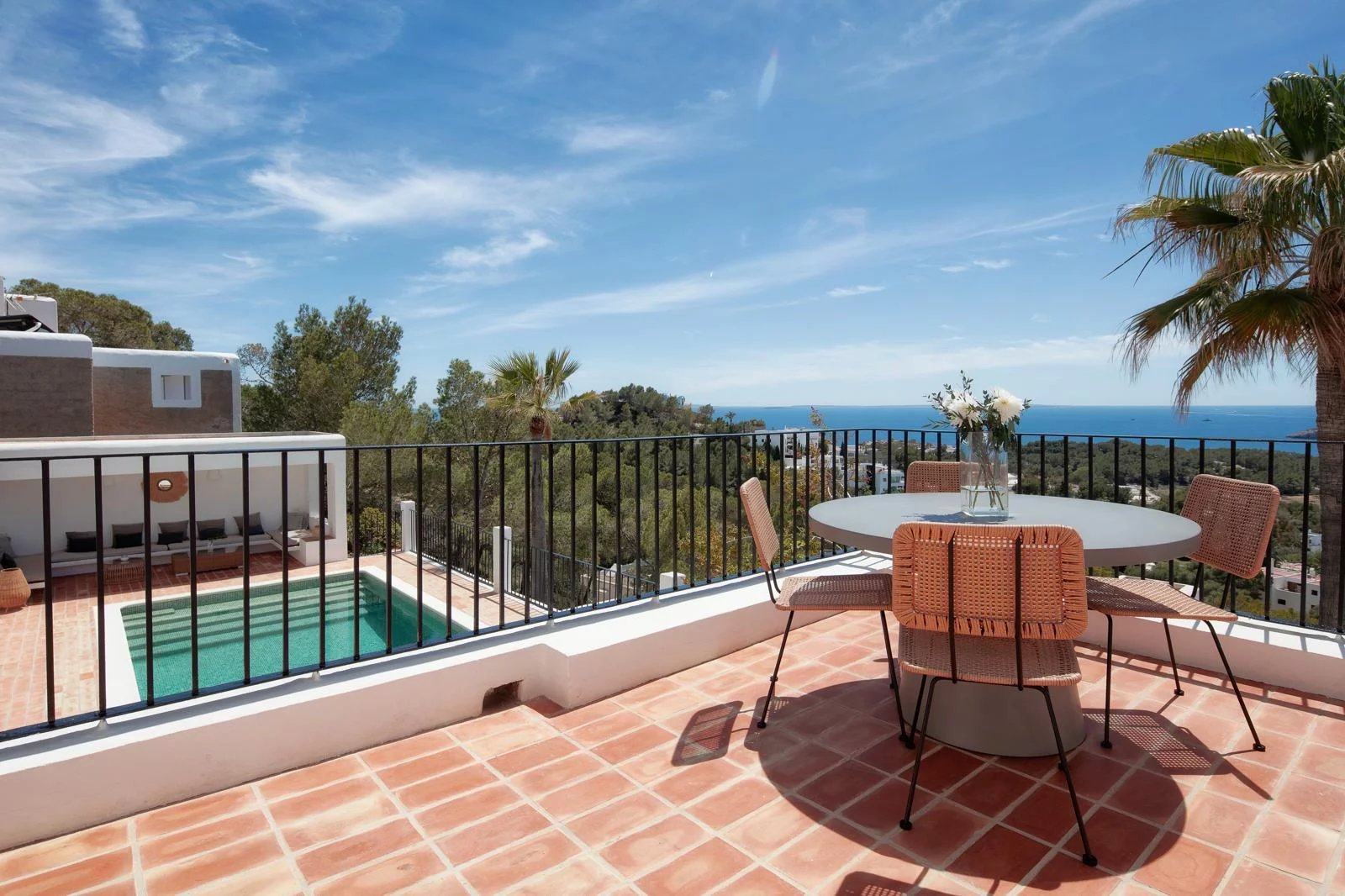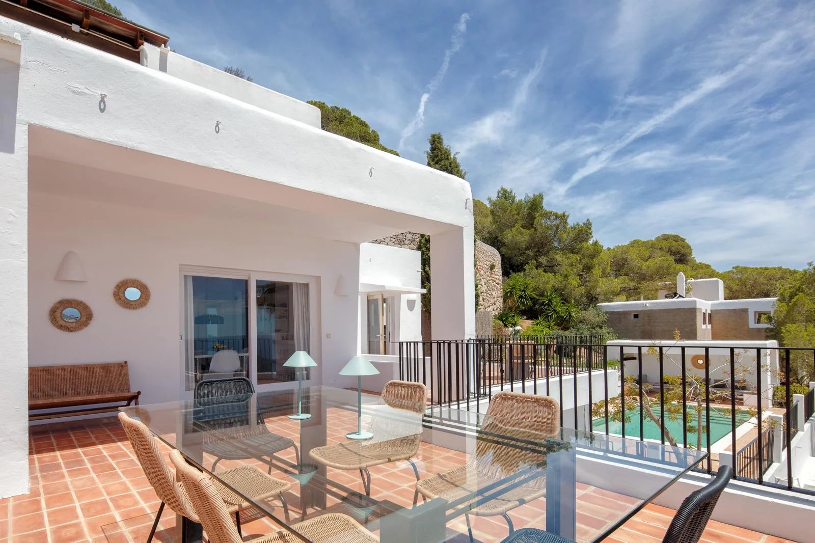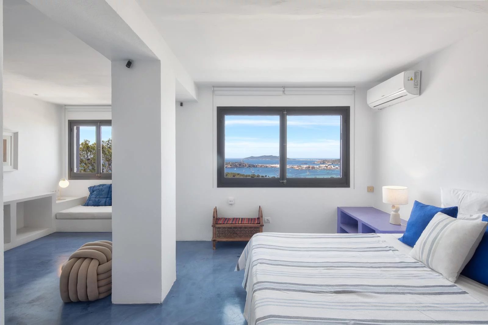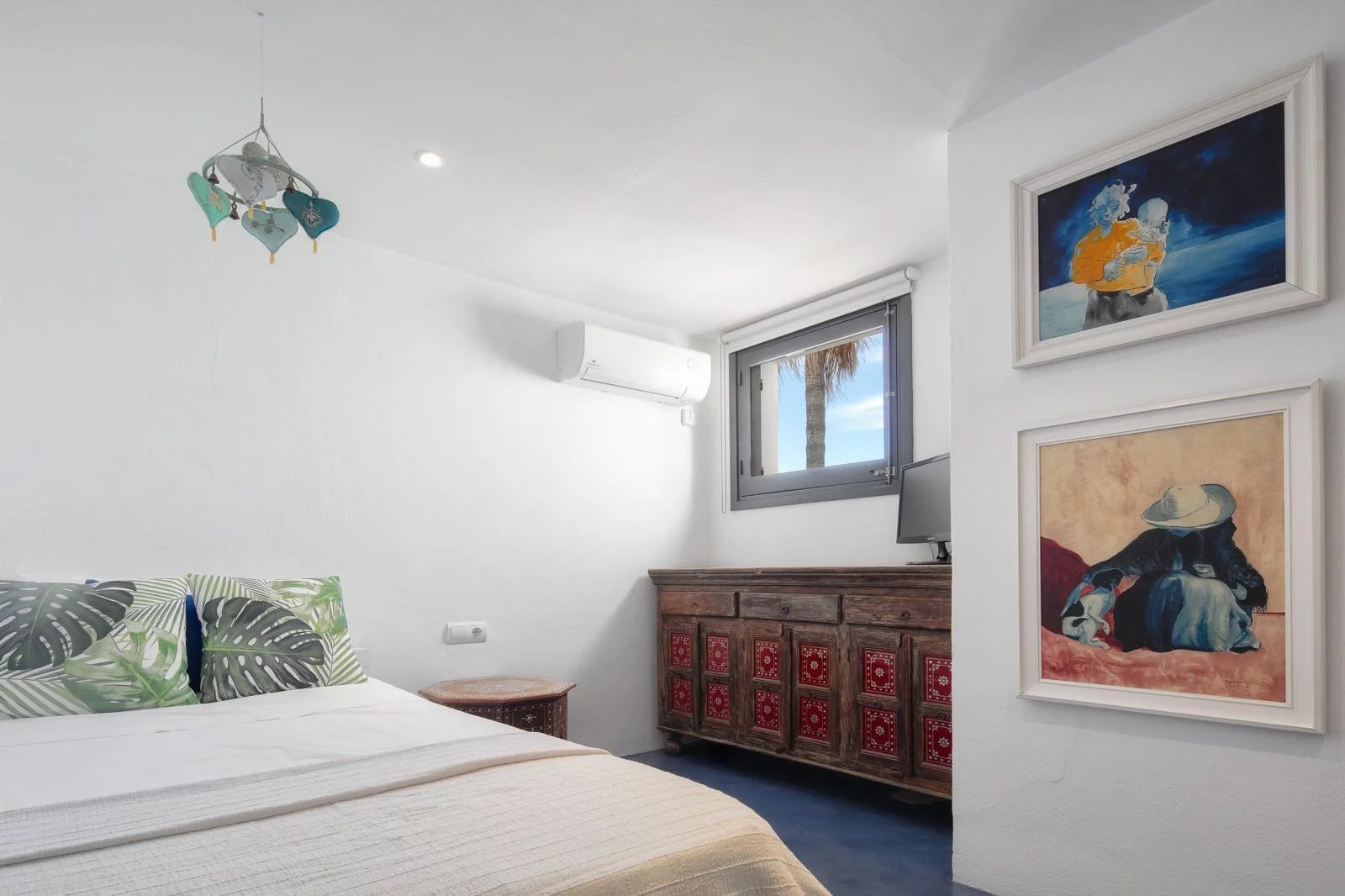 Casa Meta offers modern conveniences such as fast fiber-optic Wi-Fi and air conditioning in all bedrooms, the living room, and the kitchen. The outdoor area features a beautiful swimming pool with breathtaking views of Formentera, the bay of Talamanca, and the castle.