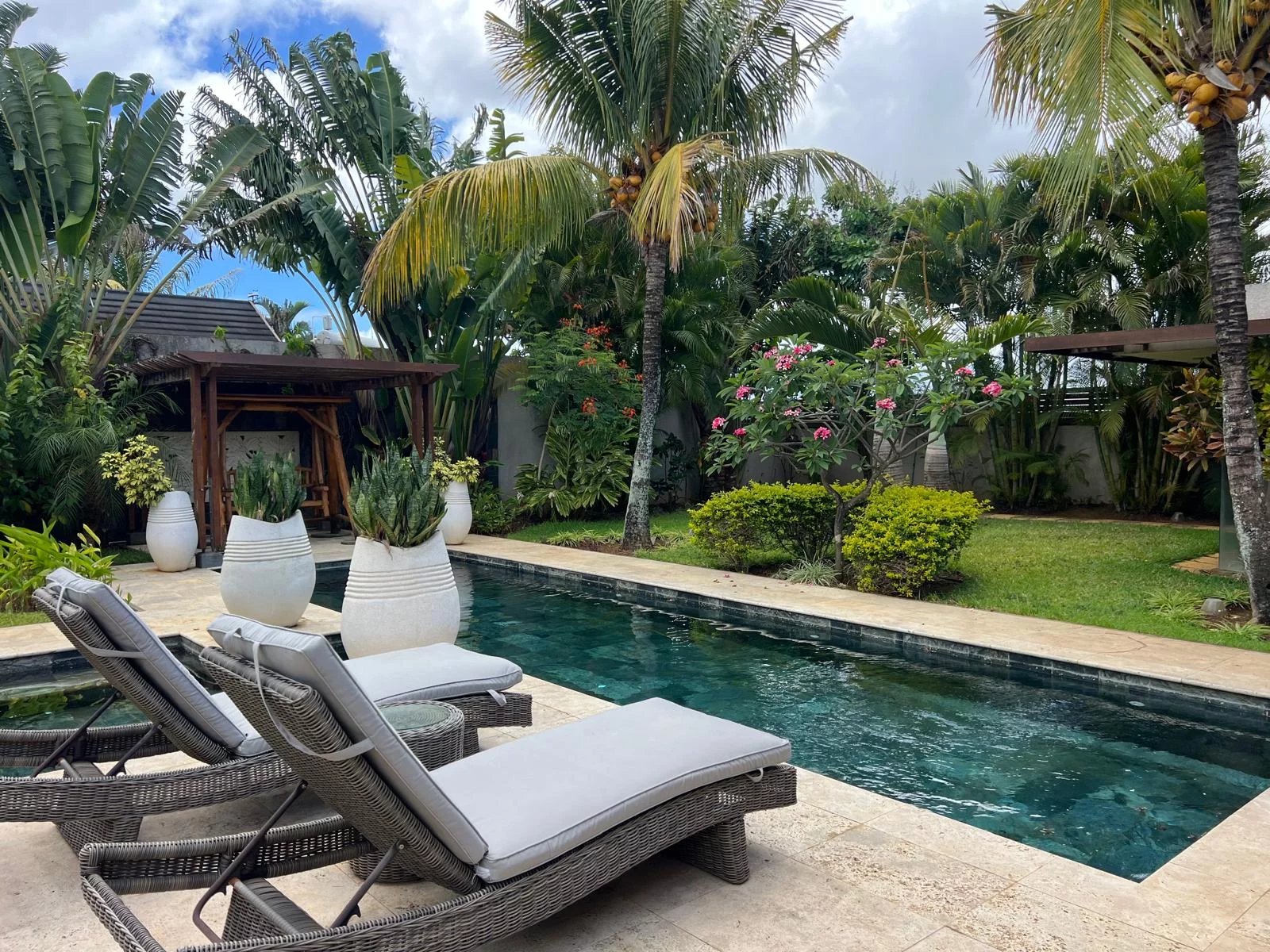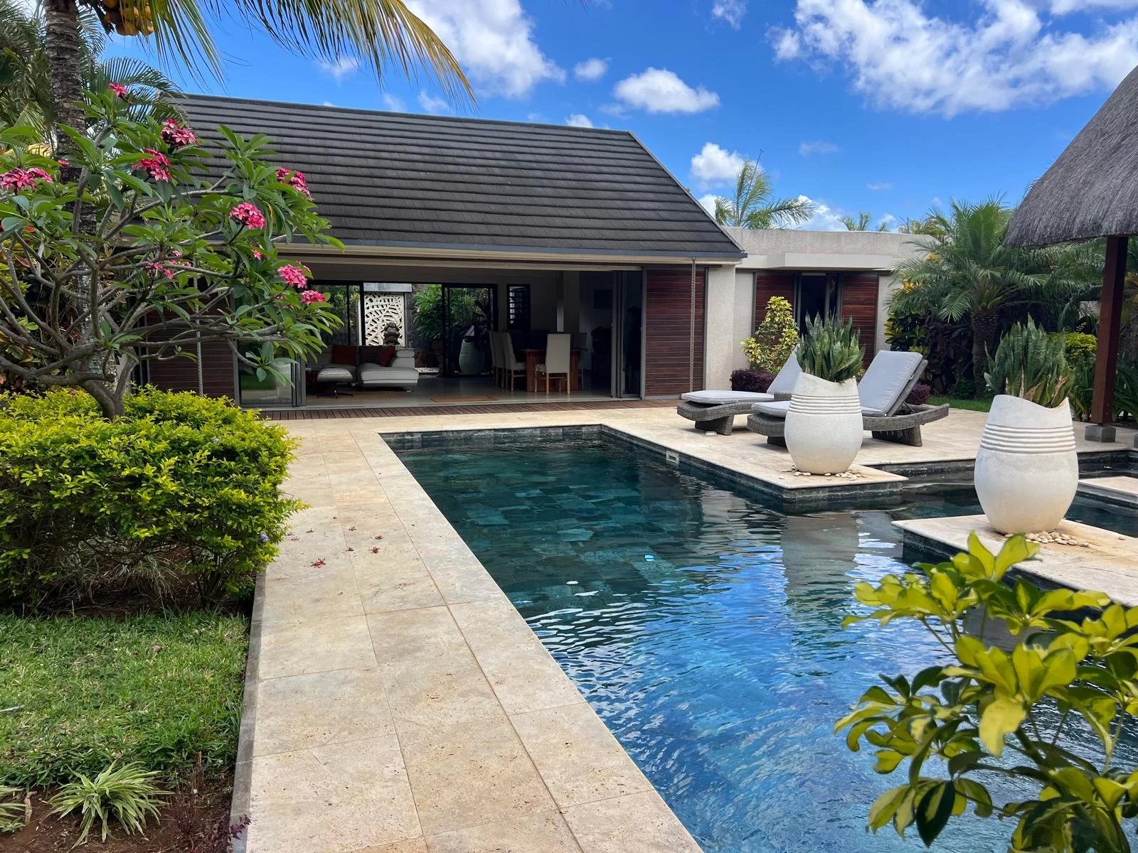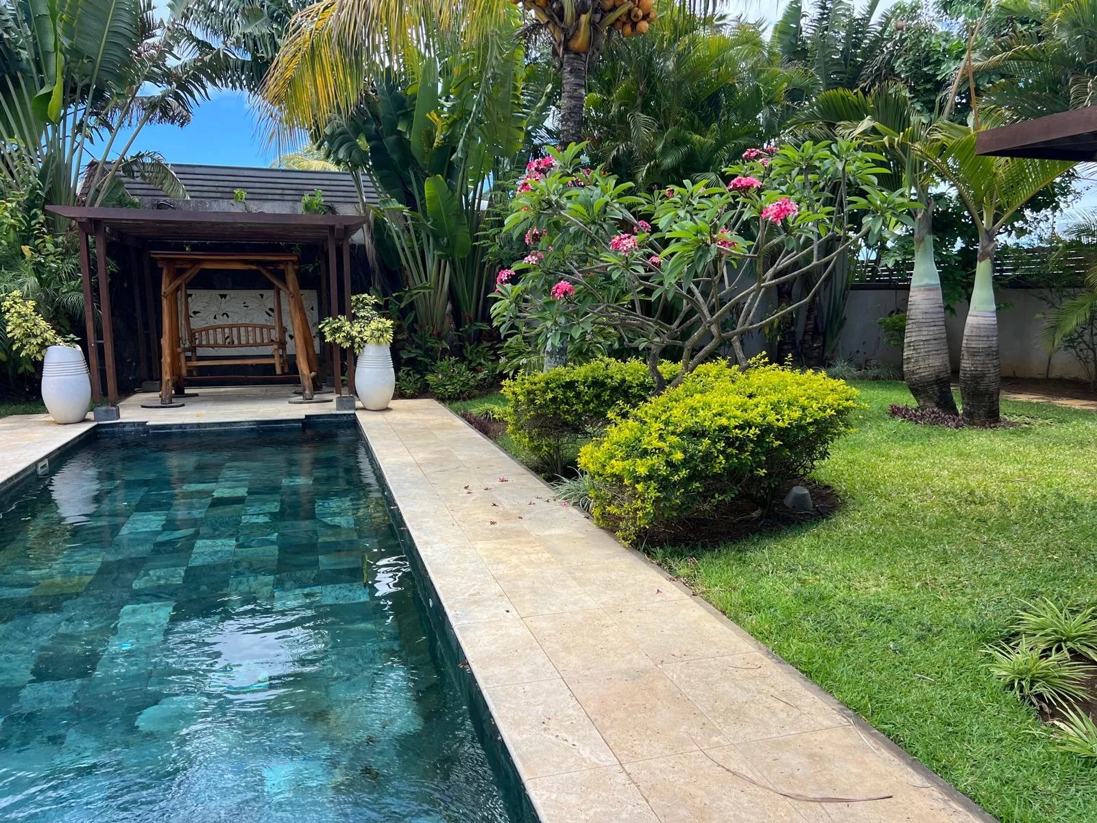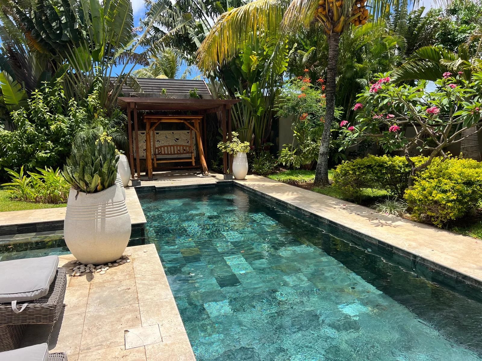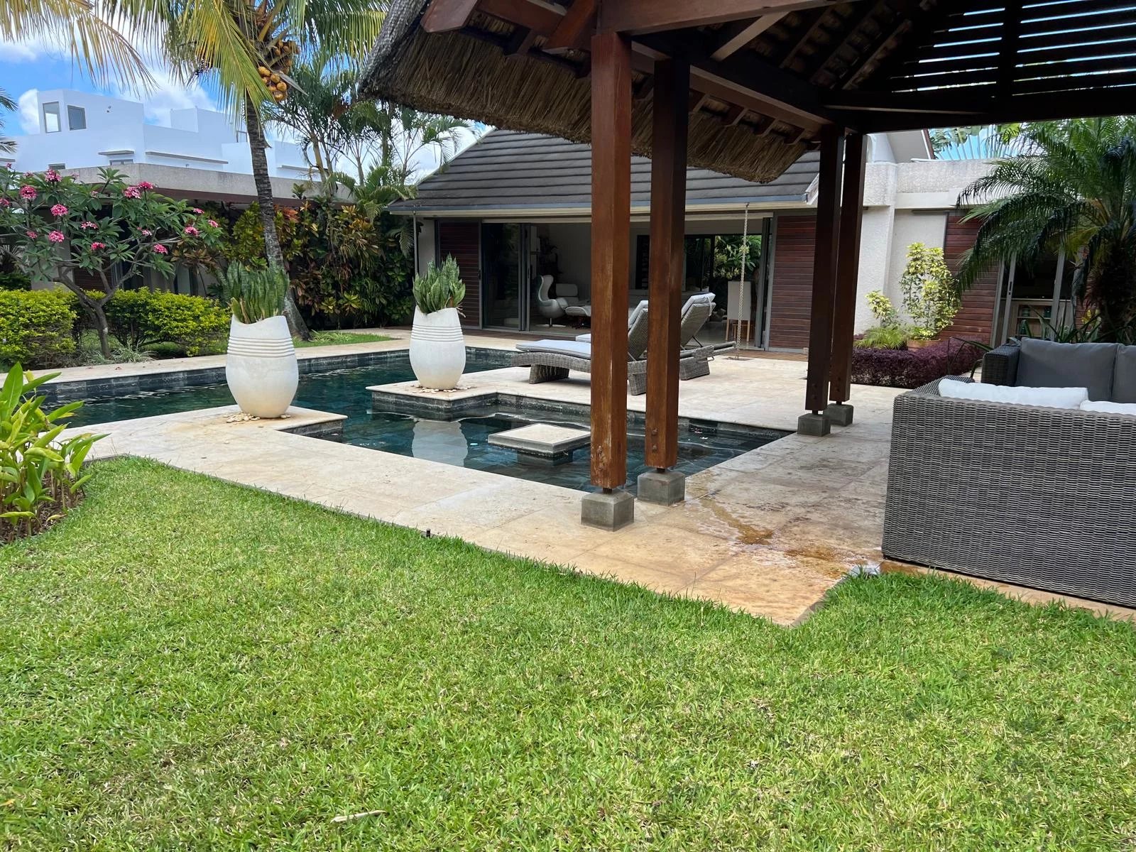 Discover this modern and elegant villa situated within a secure residential complex in Grand Bay. Enjoy an exceptional living environment with a large pool surrounded by a meticulously maintained garden, featuring two pavilions for your relaxation.