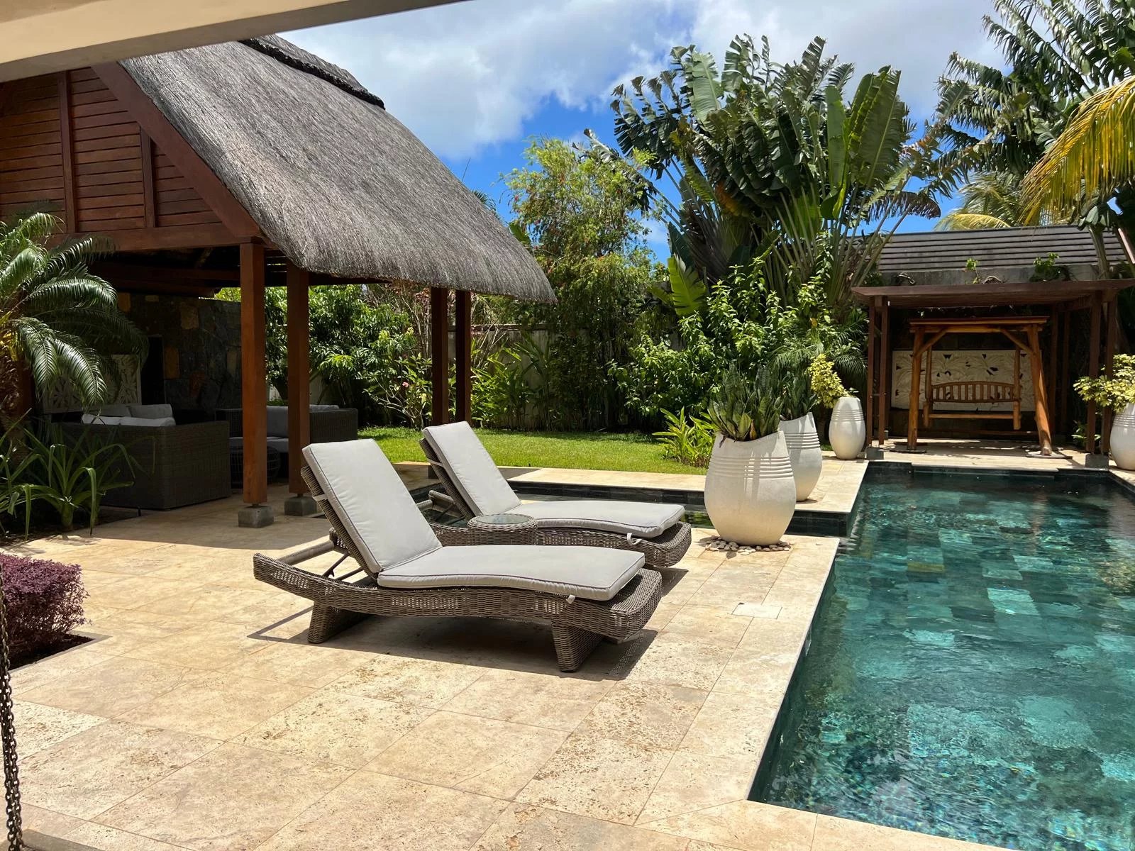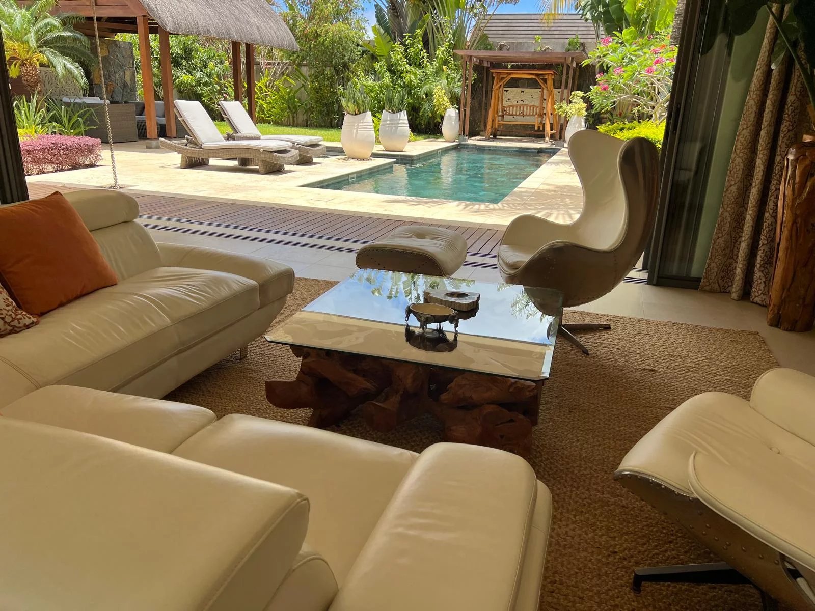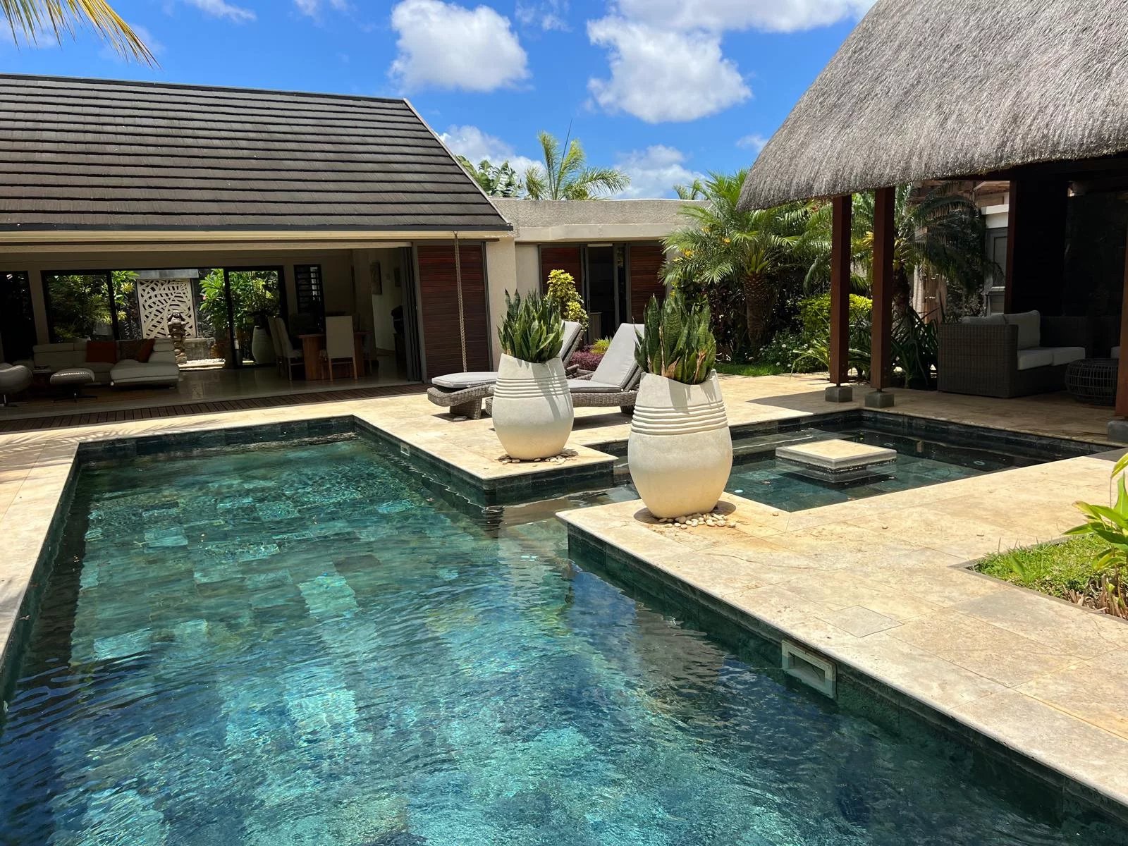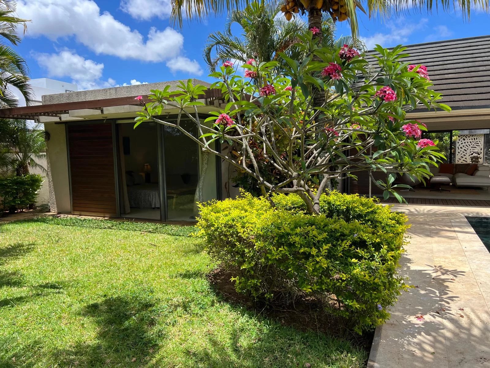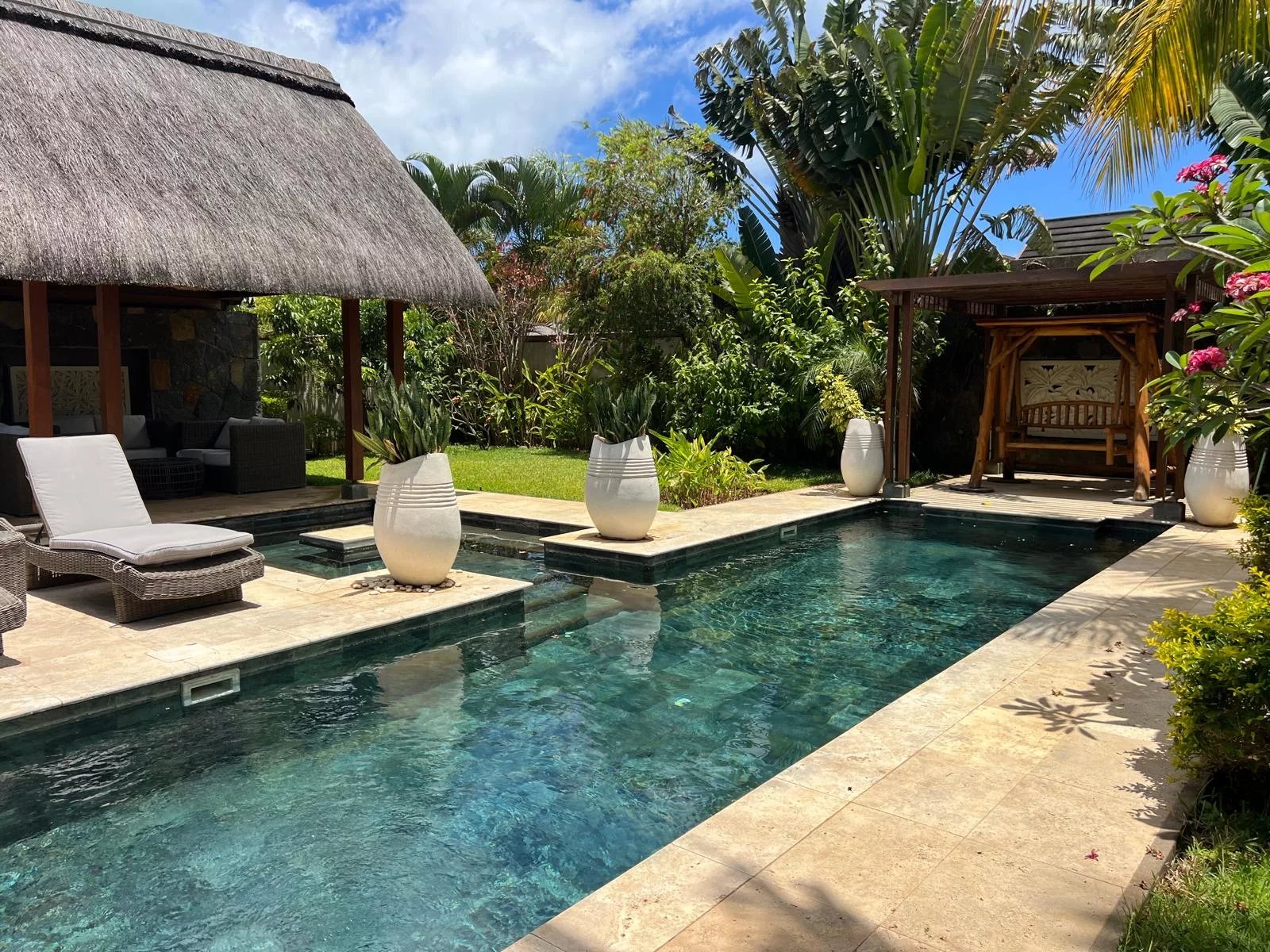 Discover this modern and elegant villa situated within a secure residential complex in Grand Bay. Enjoy an exceptional living environment with a large pool surrounded by a meticulously maintained garden, featuring two pavilions for your relaxation.
