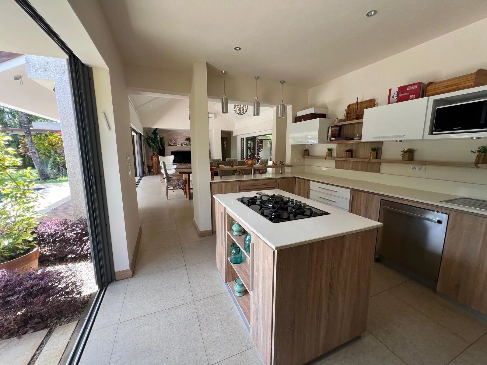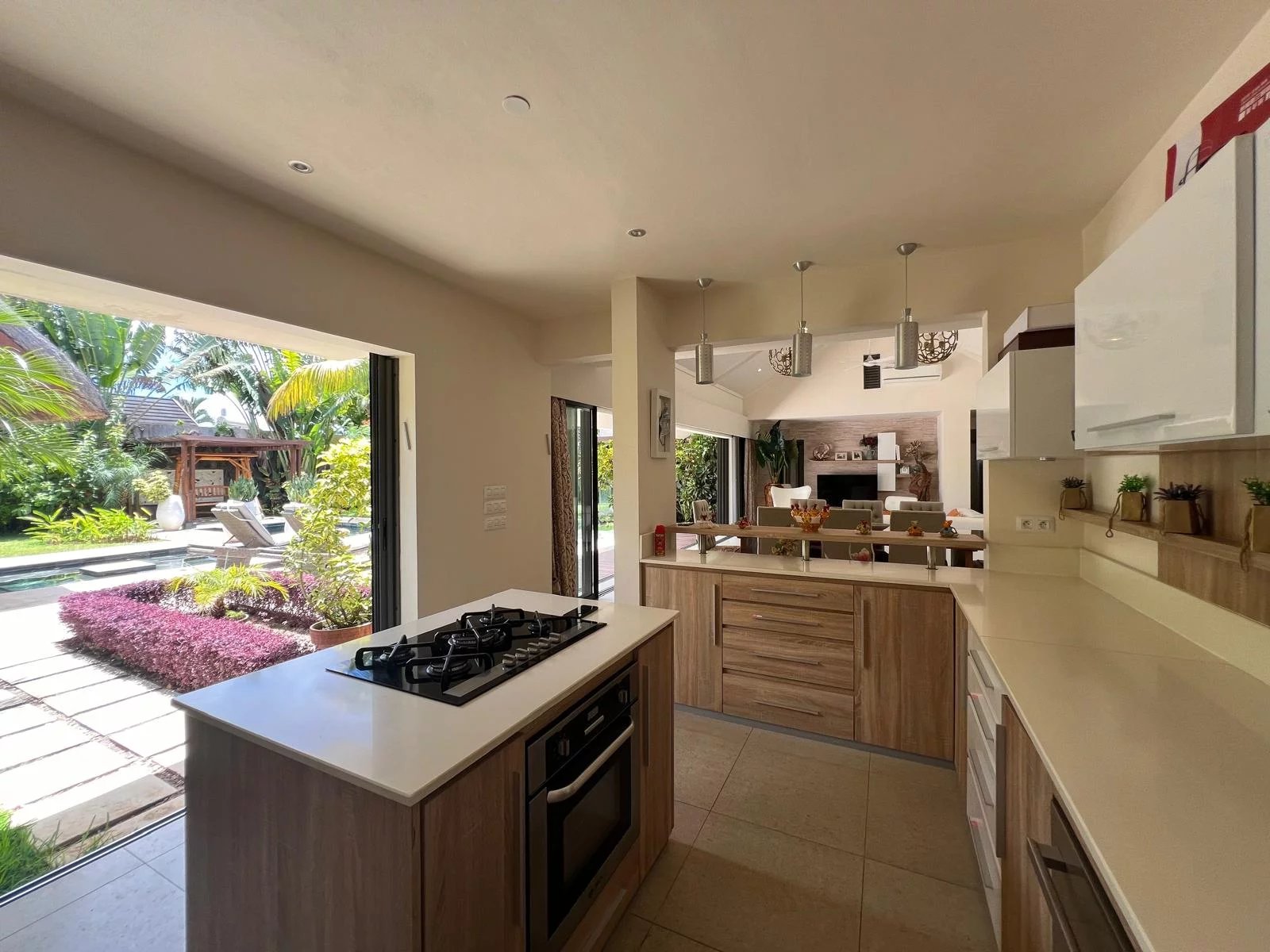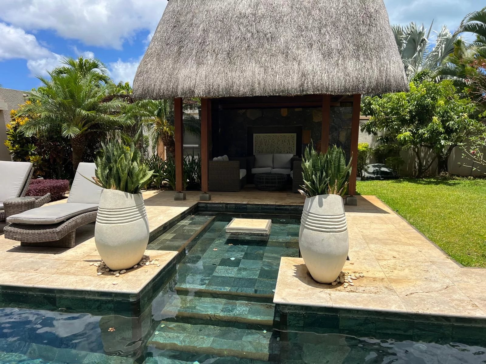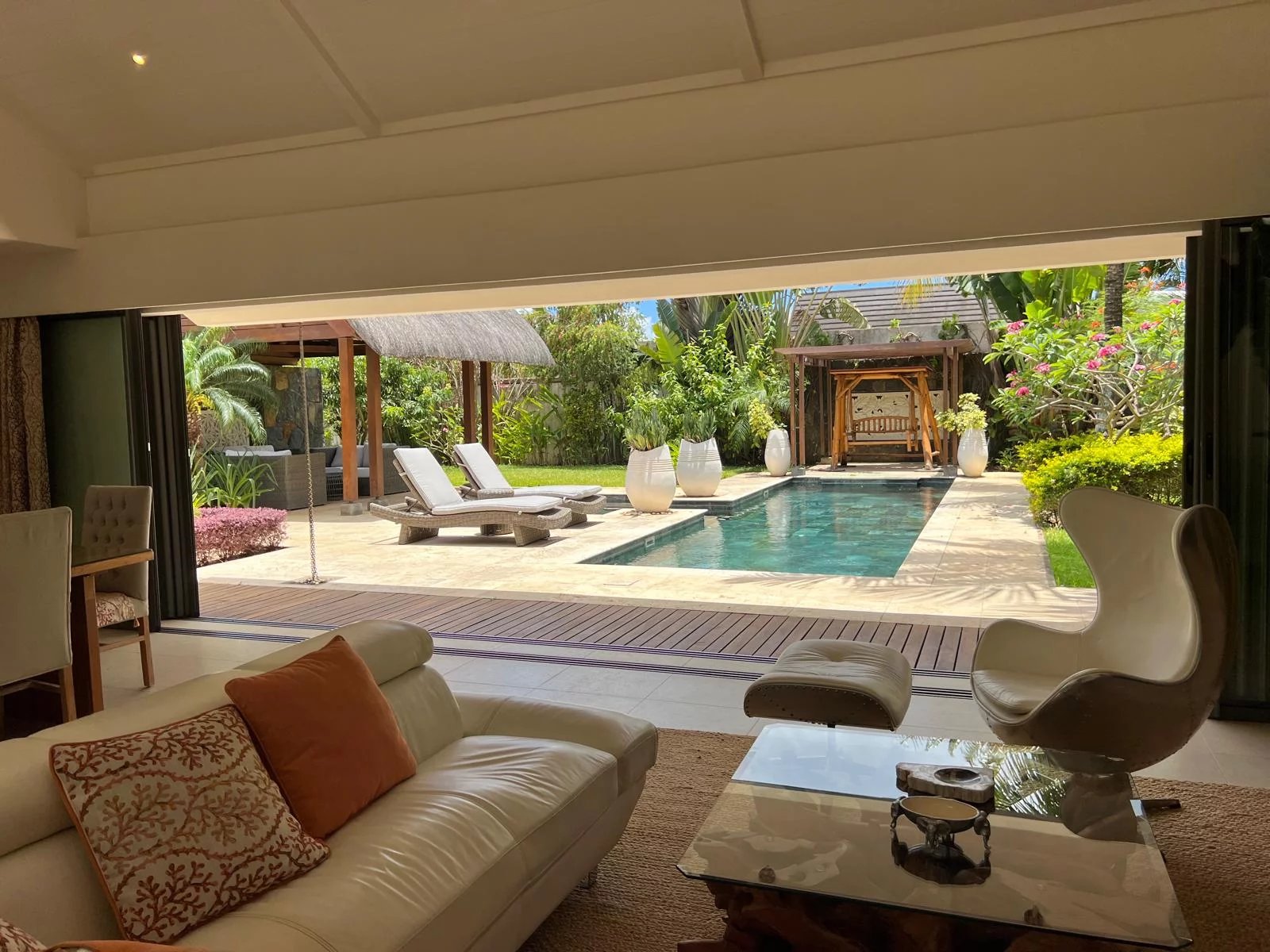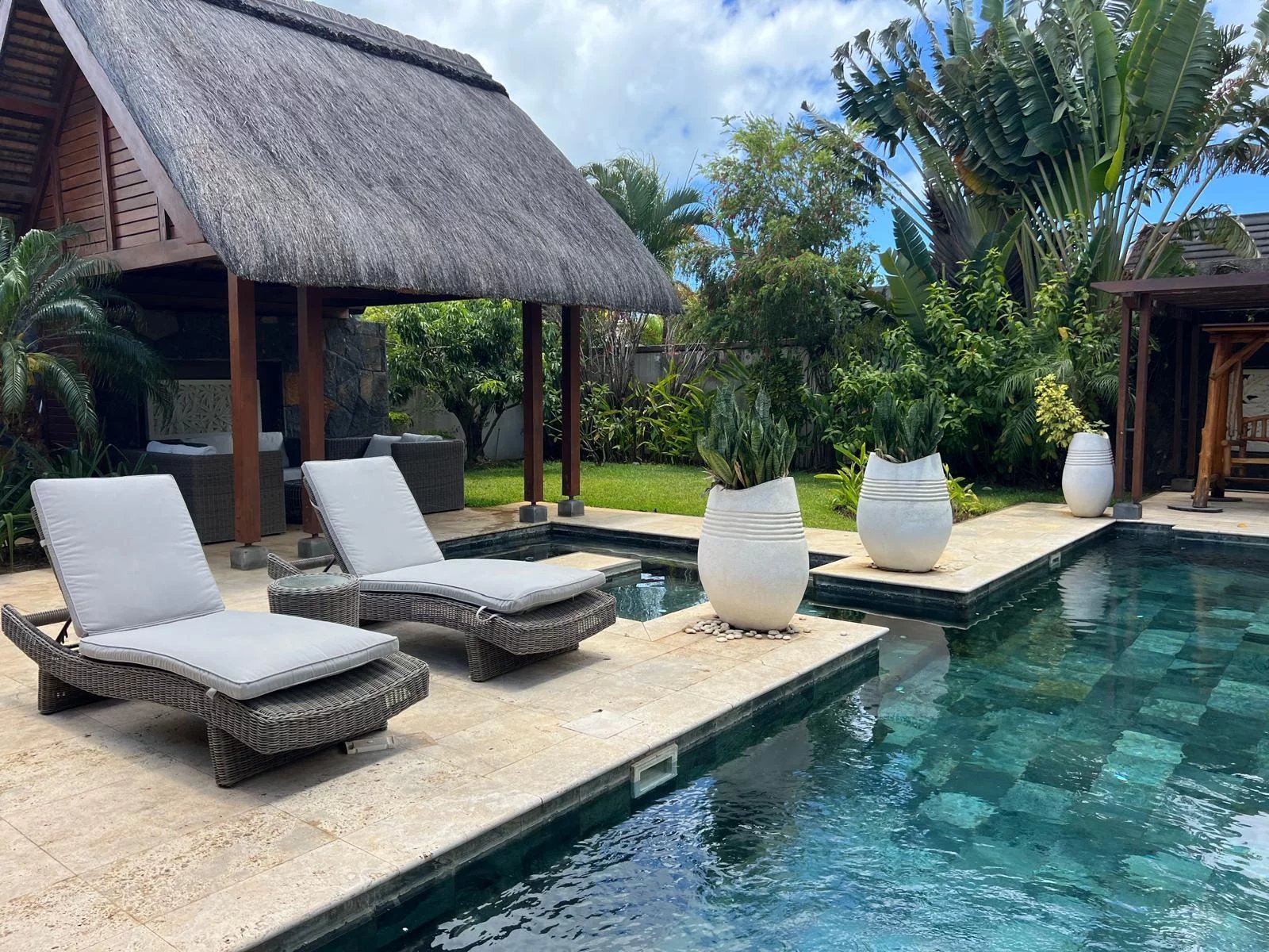 Discover this modern and elegant villa situated within a secure residential complex in Grand Bay. Enjoy an exceptional living environment with a large pool surrounded by a meticulously maintained garden, featuring two pavilions for your relaxation.