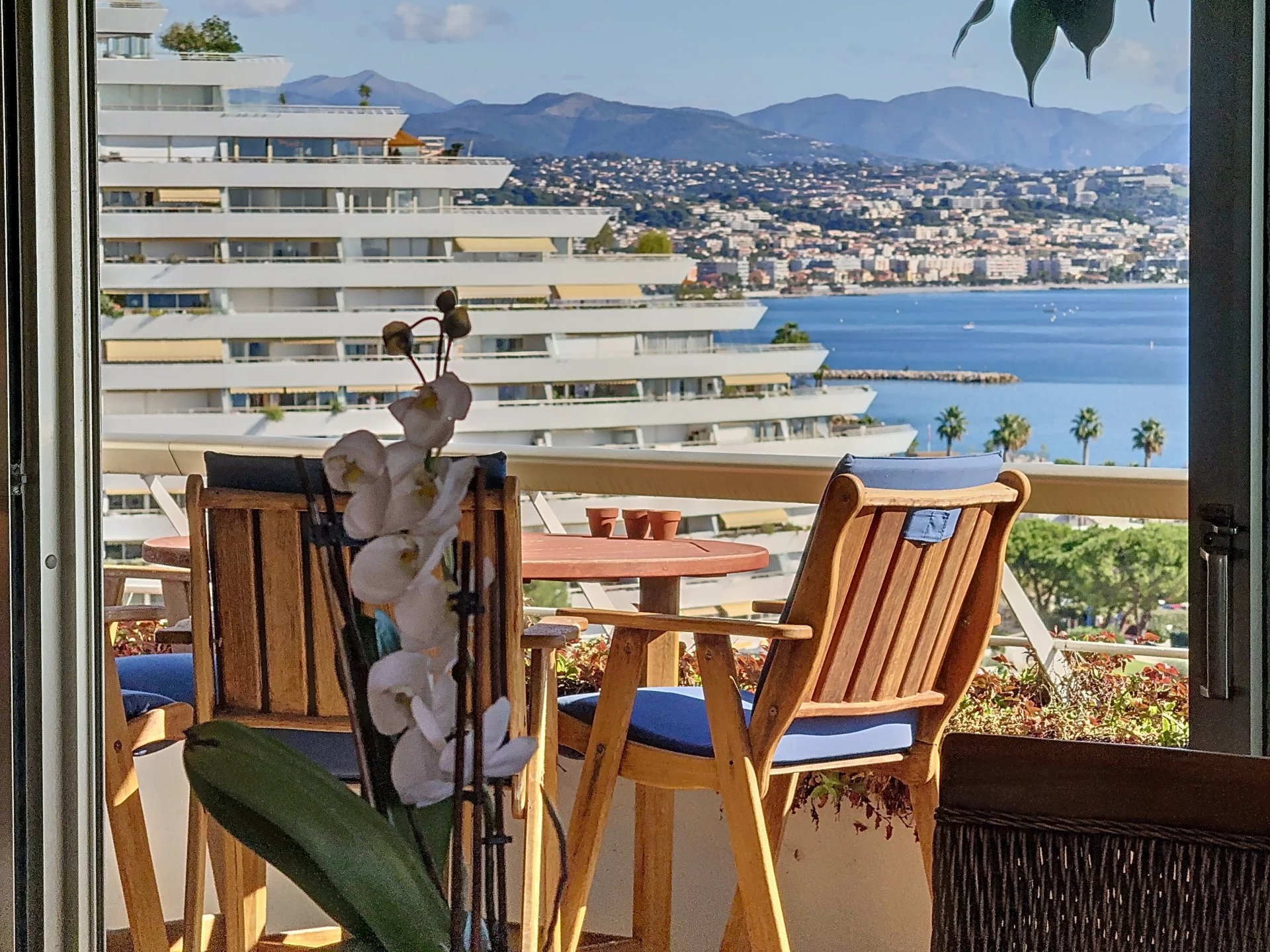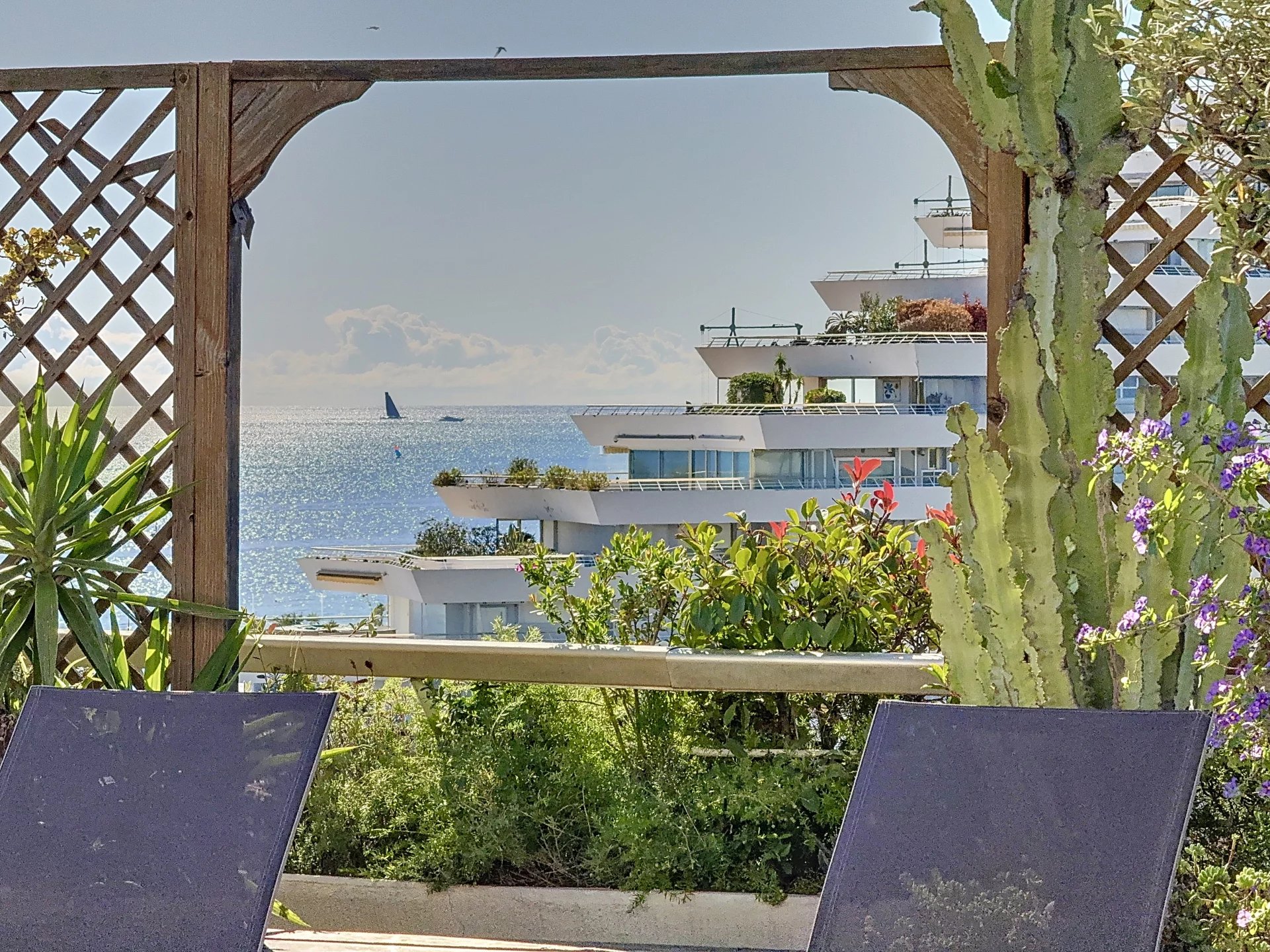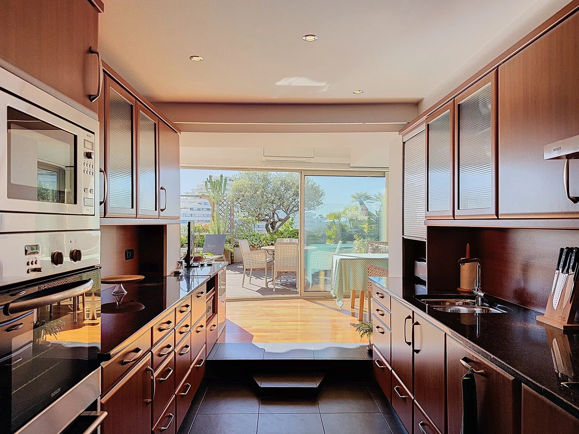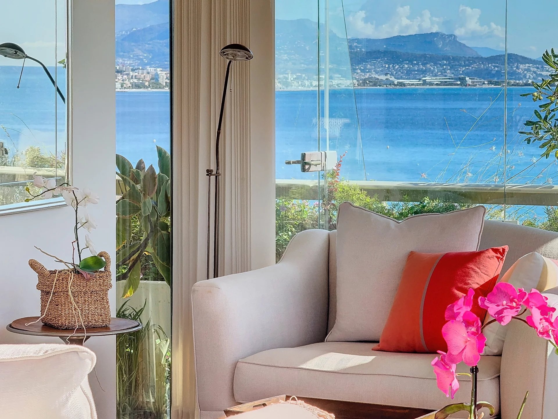 The bright entrance hall, living room and kitchen open onto a huge rectangular terrace with a breathtaking view of the Mediterranean, the Marina and Cap d'Antibes!