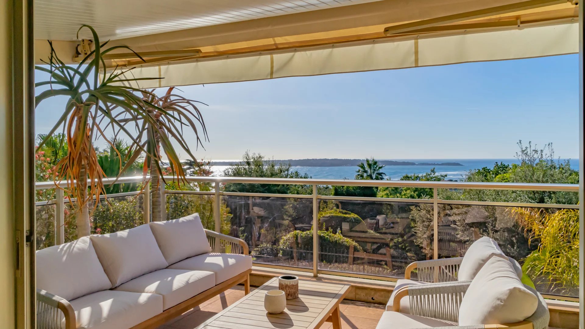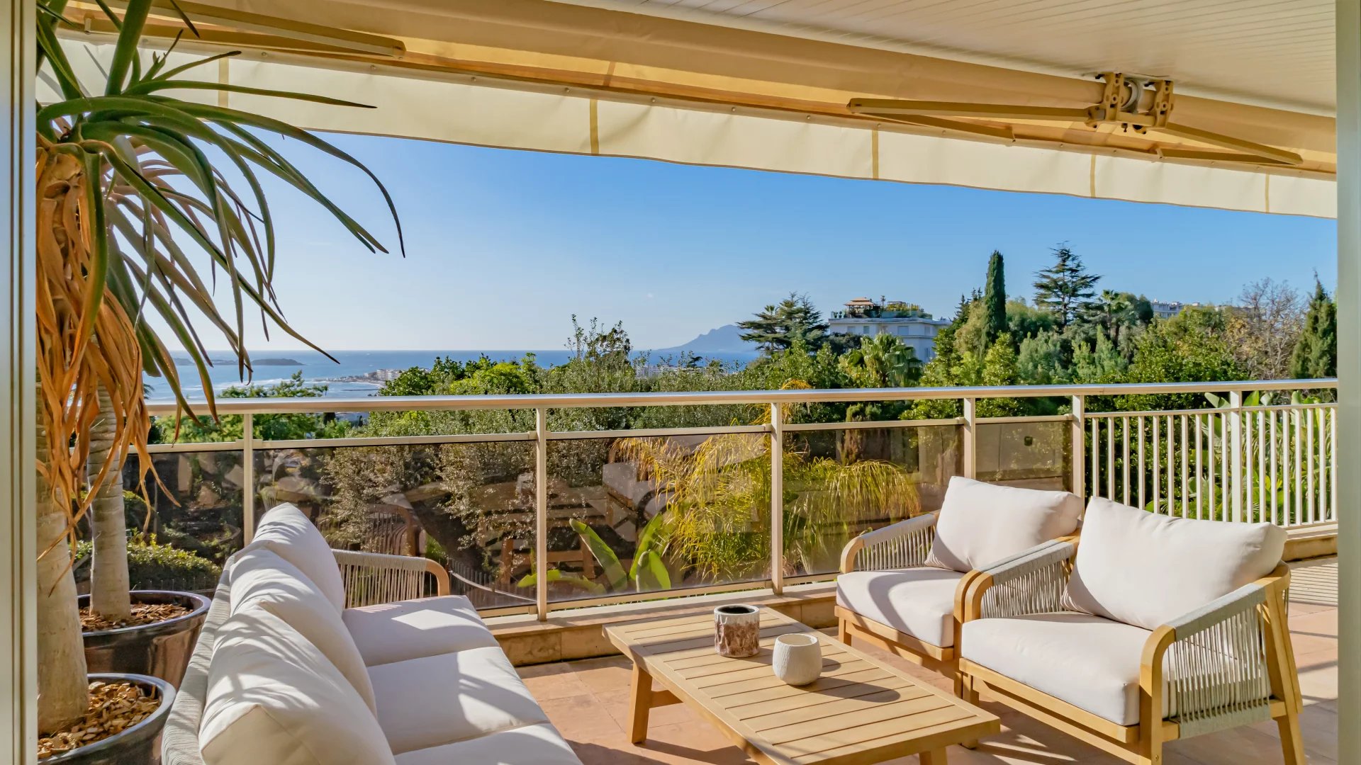 It boasts spacious interiors that open out onto large, wide terraces on each level, 4 en-suite bedrooms and a private garden overlooking the sea, the Lérins islands and Palm Beach.