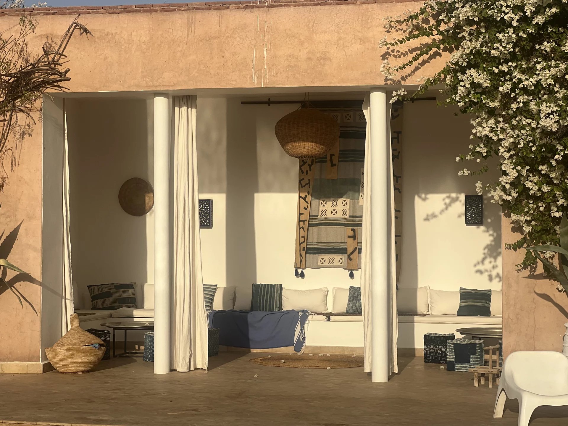 Articulated around a central patio with fountain in the spirit of a traditional Riad, it comprises on 2 levels: a living room and dining room each with fireplace, a library, an office, a fully equipped kitchen and 9 en suite bedrooms with fireplace and private terrace.