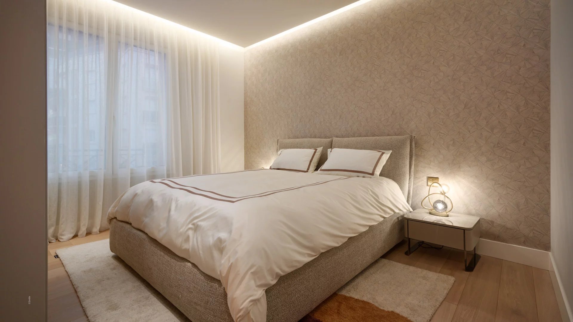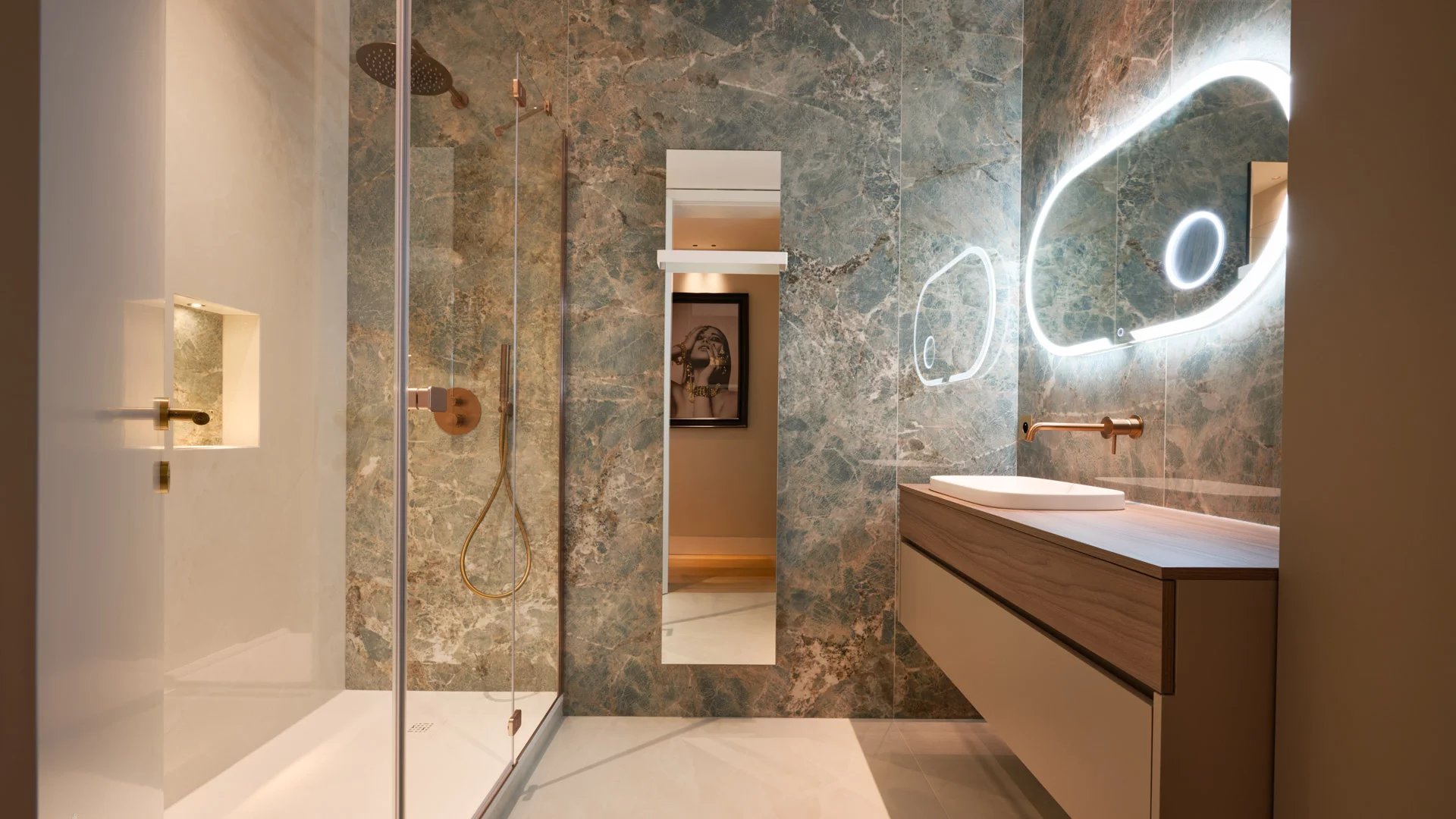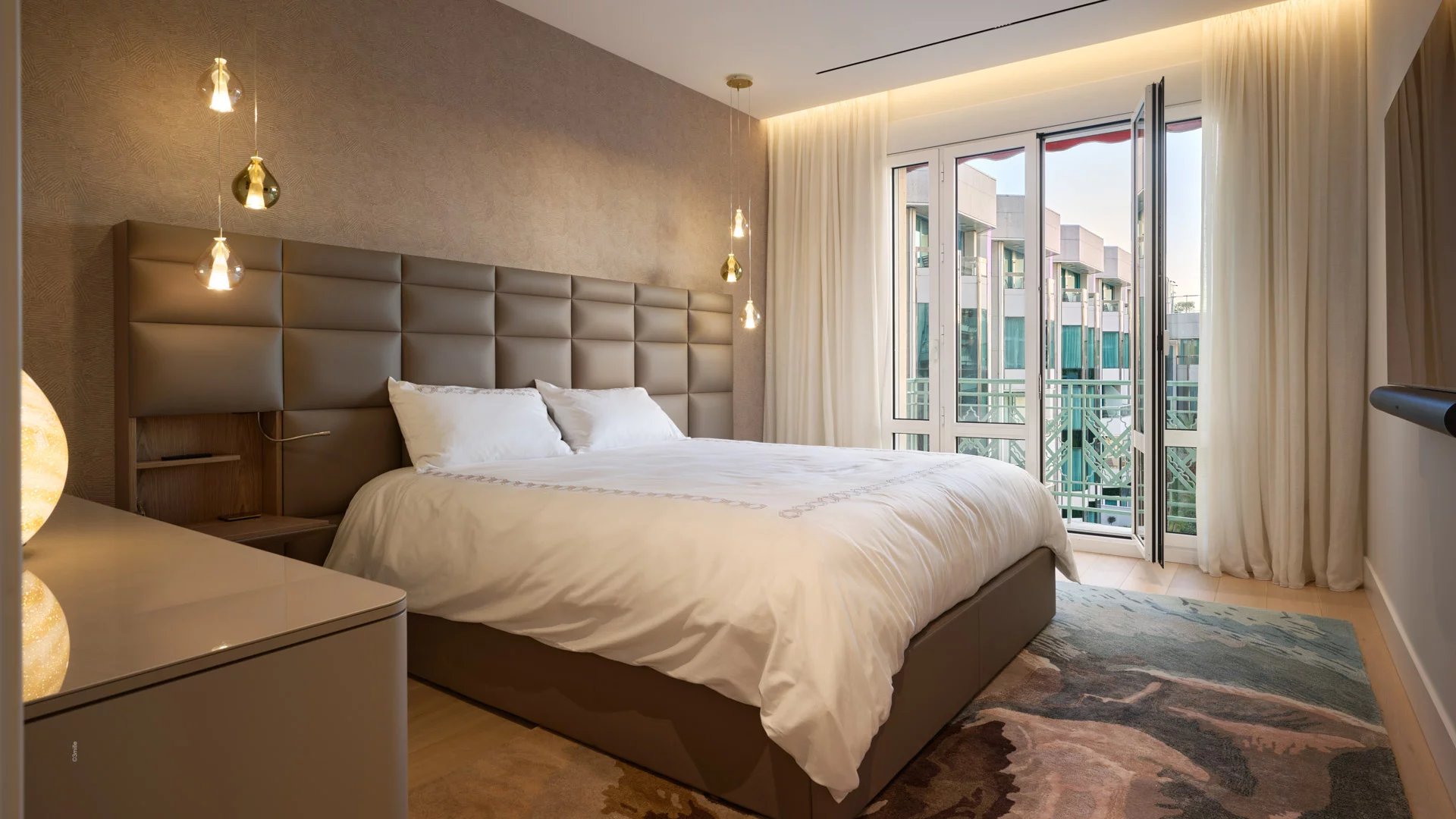 The apartment comprises an entrance hall, an open-plan kitchen opening onto a spacious living room and a bright dining room. It has two en suite bedrooms, each with its own shower room, a master bedroom with dressing room, shower and bath, as well as a guest toilet and laundry room.