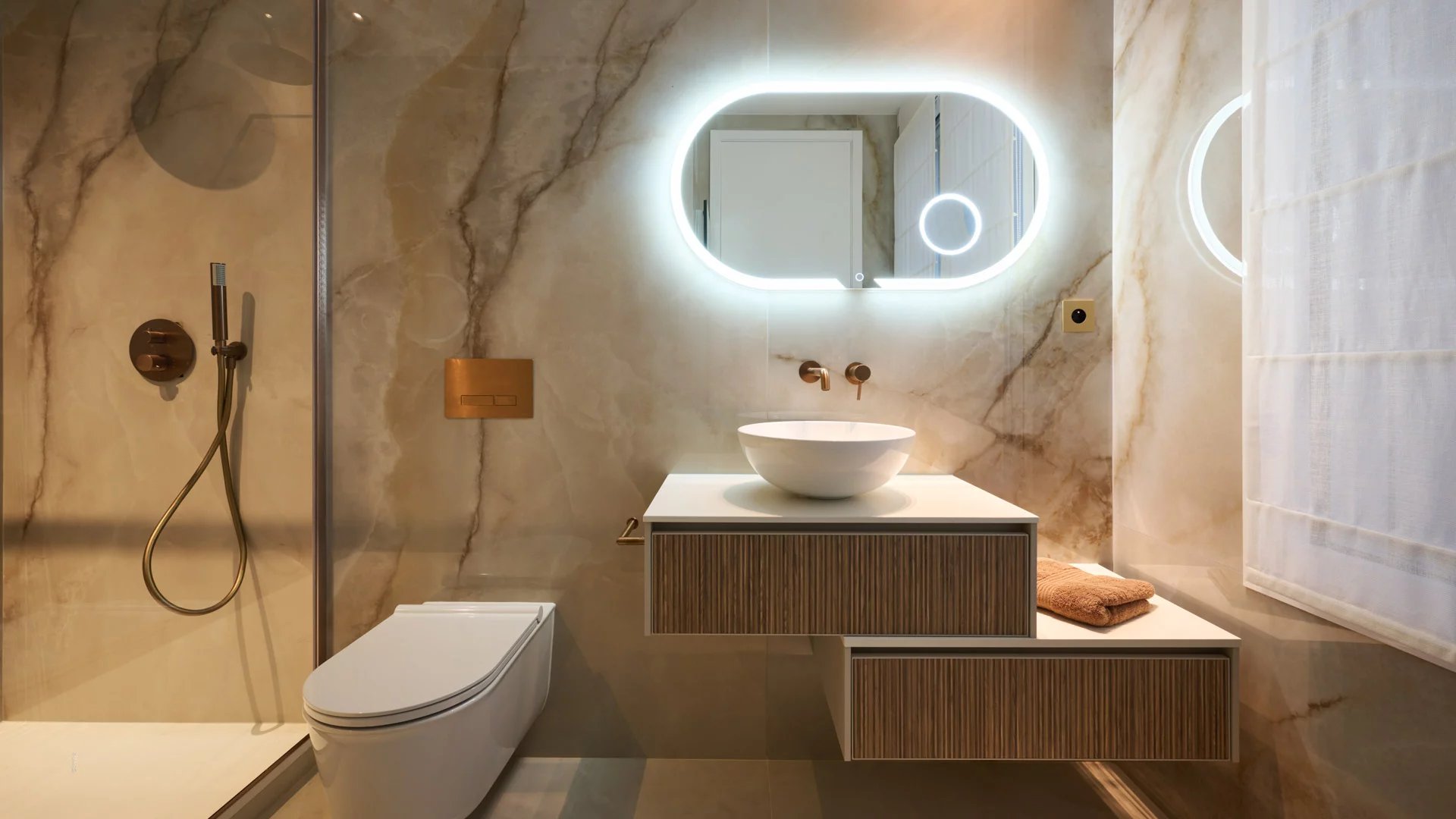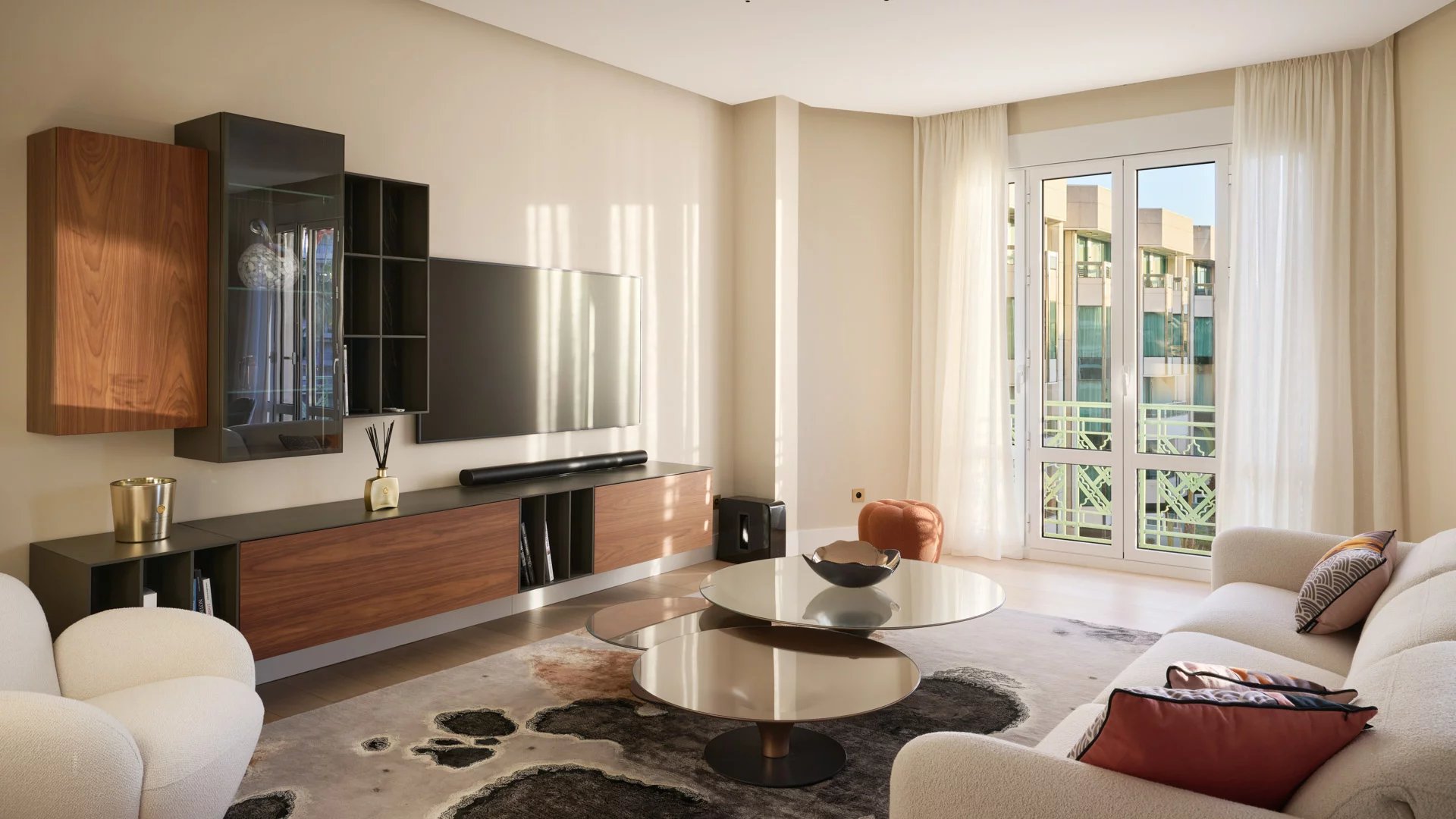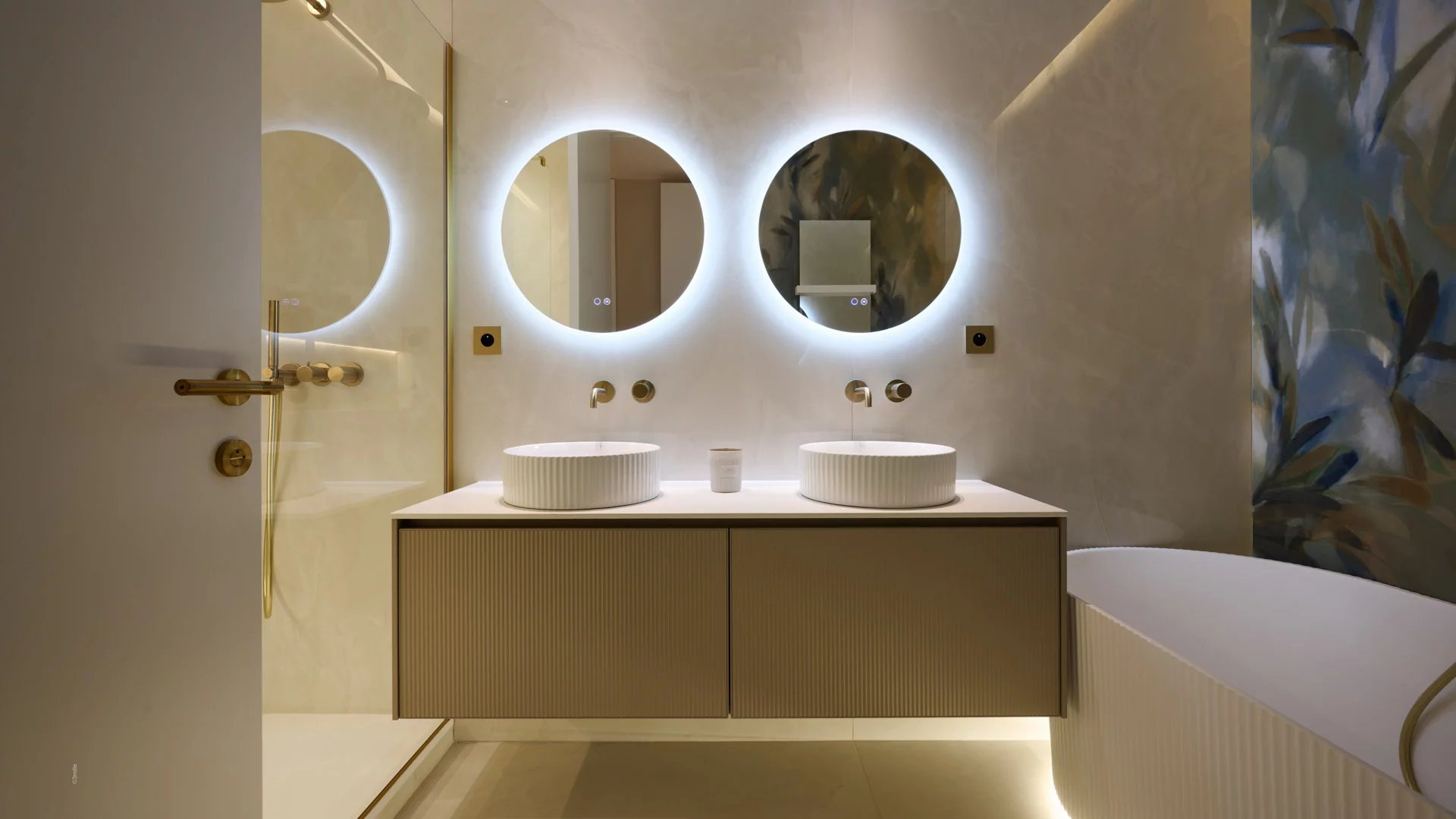 The apartment comprises an entrance hall, an open-plan kitchen opening onto a spacious living room and a bright dining room. It has two en suite bedrooms, each with its own shower room, a master bedroom with dressing room, shower and bath, as well as a guest toilet and laundry room.