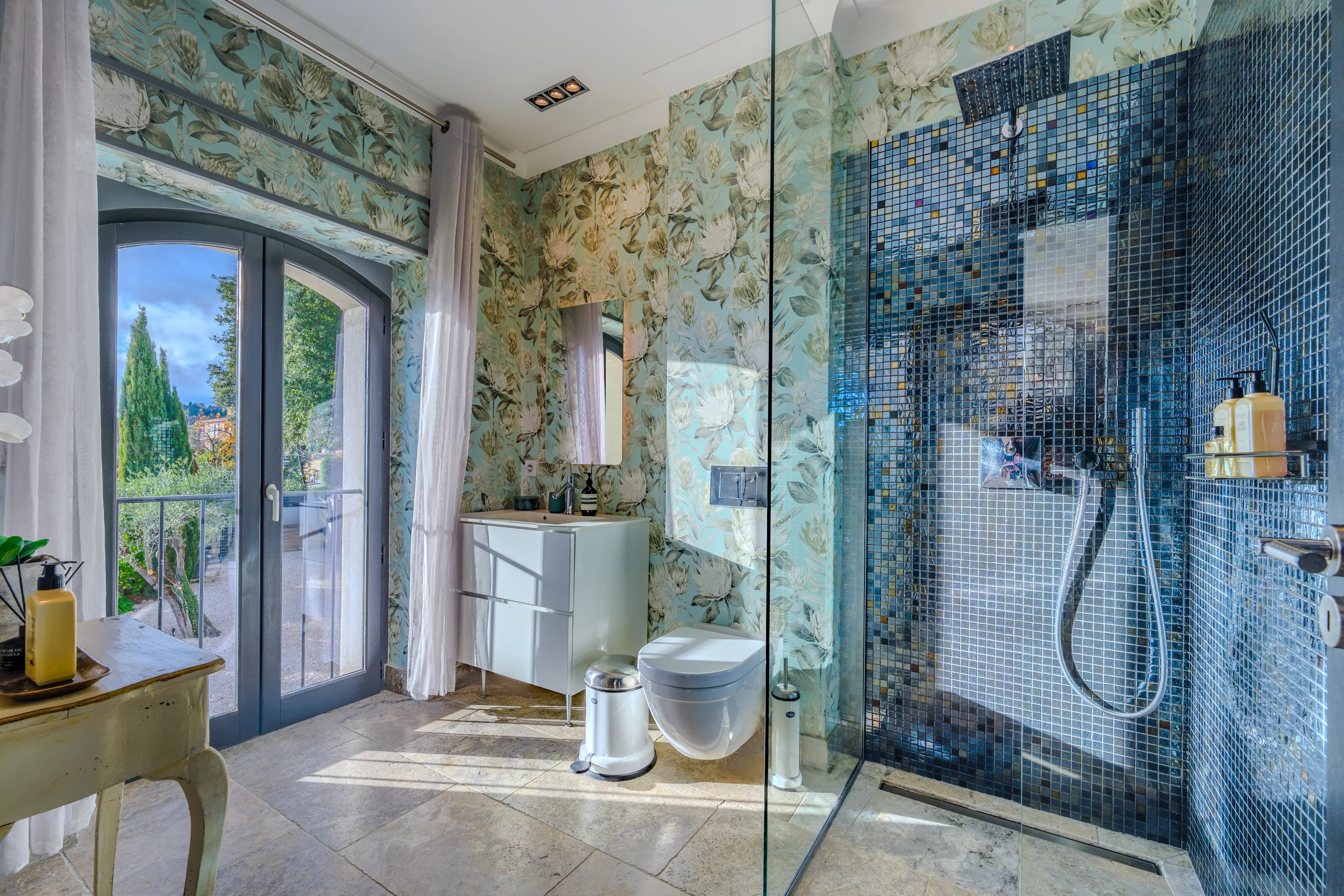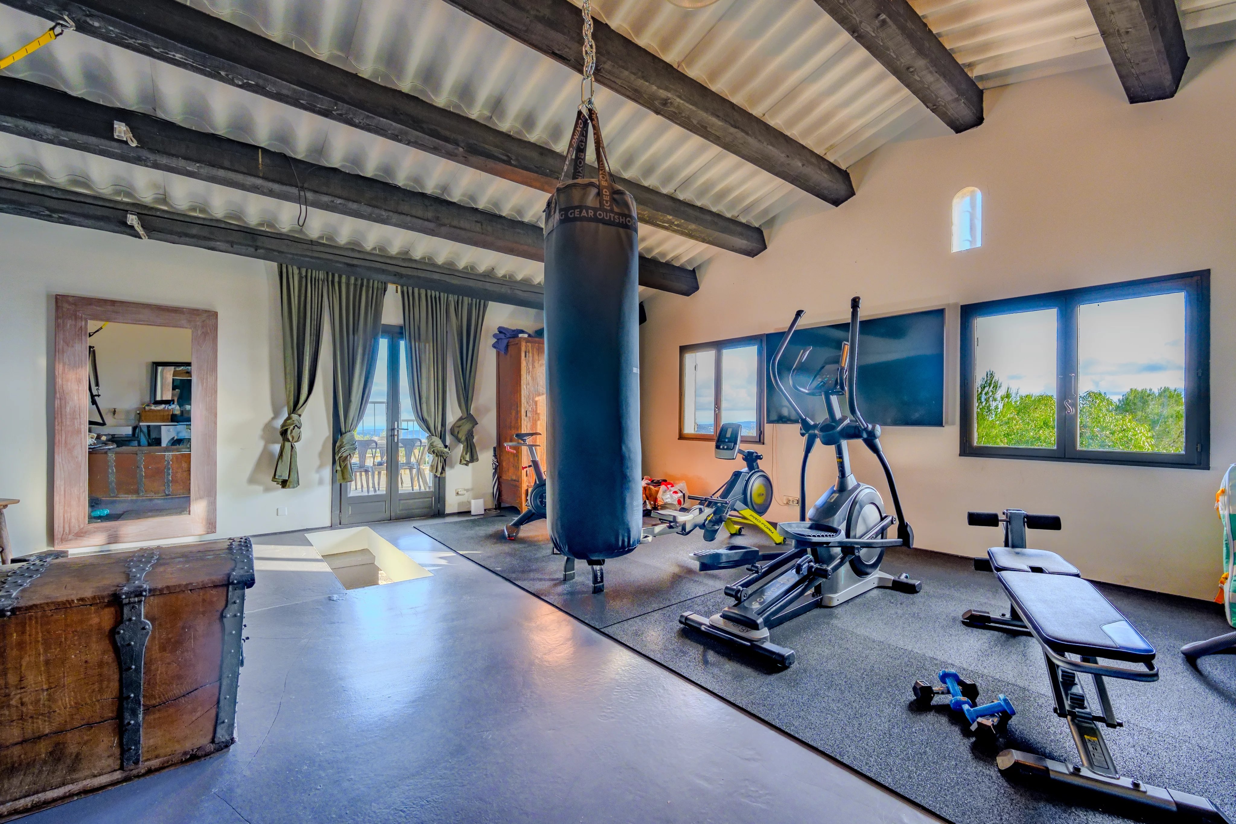 A fully independent guest house includes, on the garden level, a charming living room, bedroom, kitchen, and bathroom, with its own terrace and private garden. Upstairs, the former double garage has been transformed into a fully equipped gym.