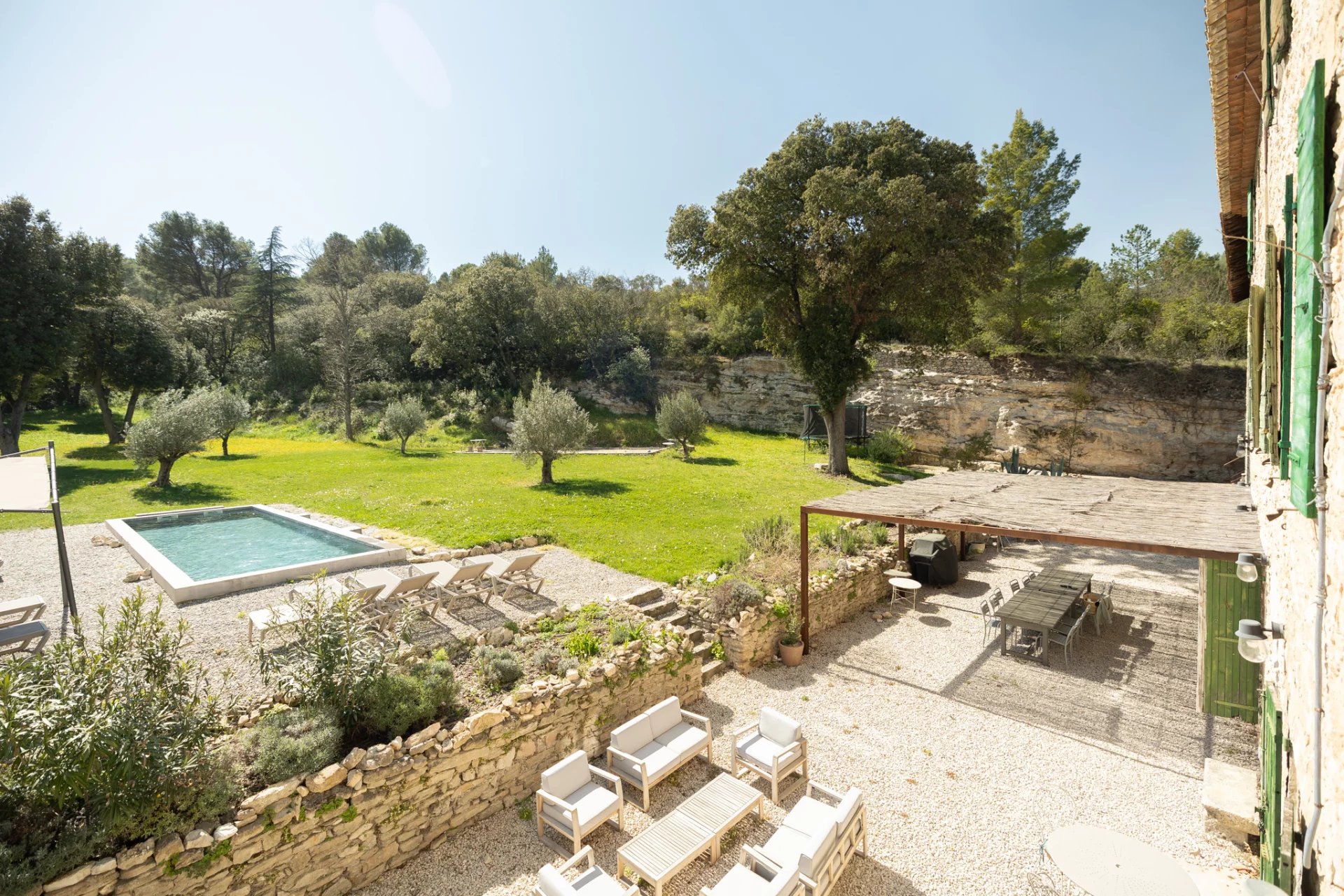 The fully landscaped grounds feature several shaded terraces, relaxation areas, a sleekly designed swimming pool, and a pétanque court. The setting is peaceful, private, and offers open views of the surrounding vegetation and natural reliefs.
