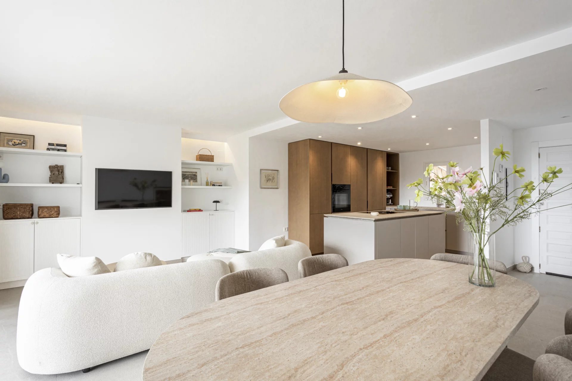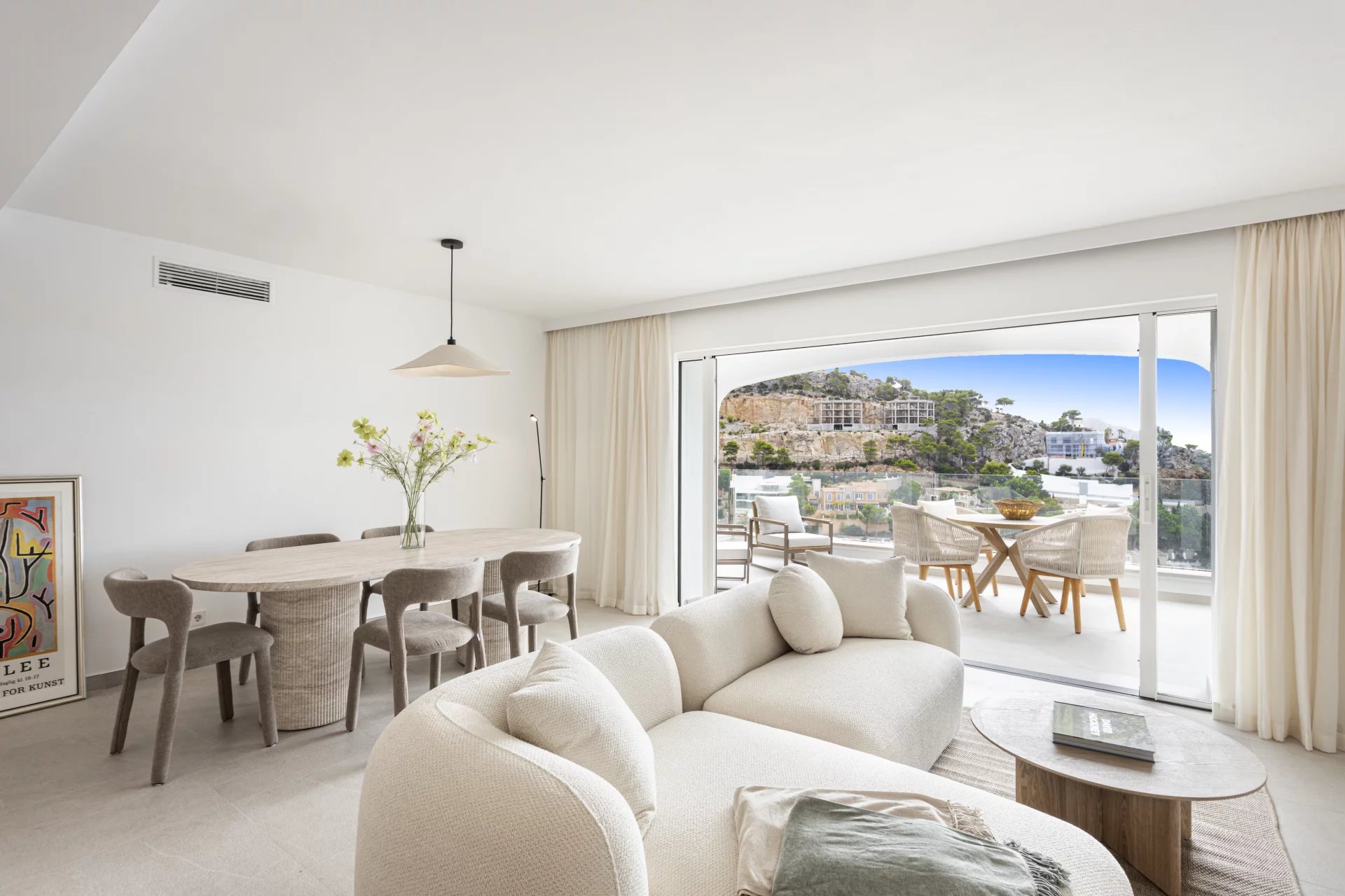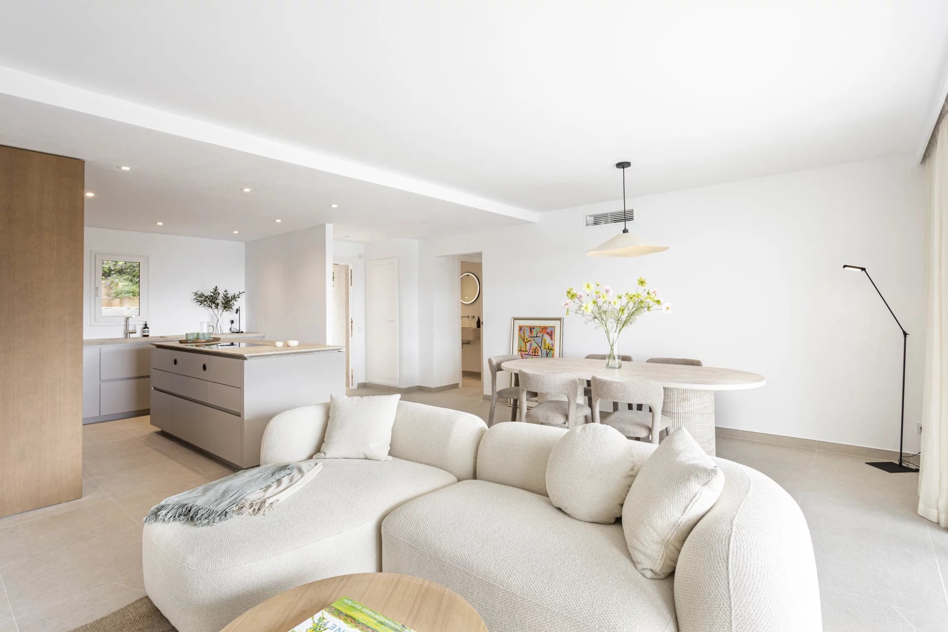 The large open living-dining area and kitchen are bathed in natural light and connect effortlessly to the terrace, creating the perfect setting for entertaining or relaxing while enjoying panoramic coastal vistas.