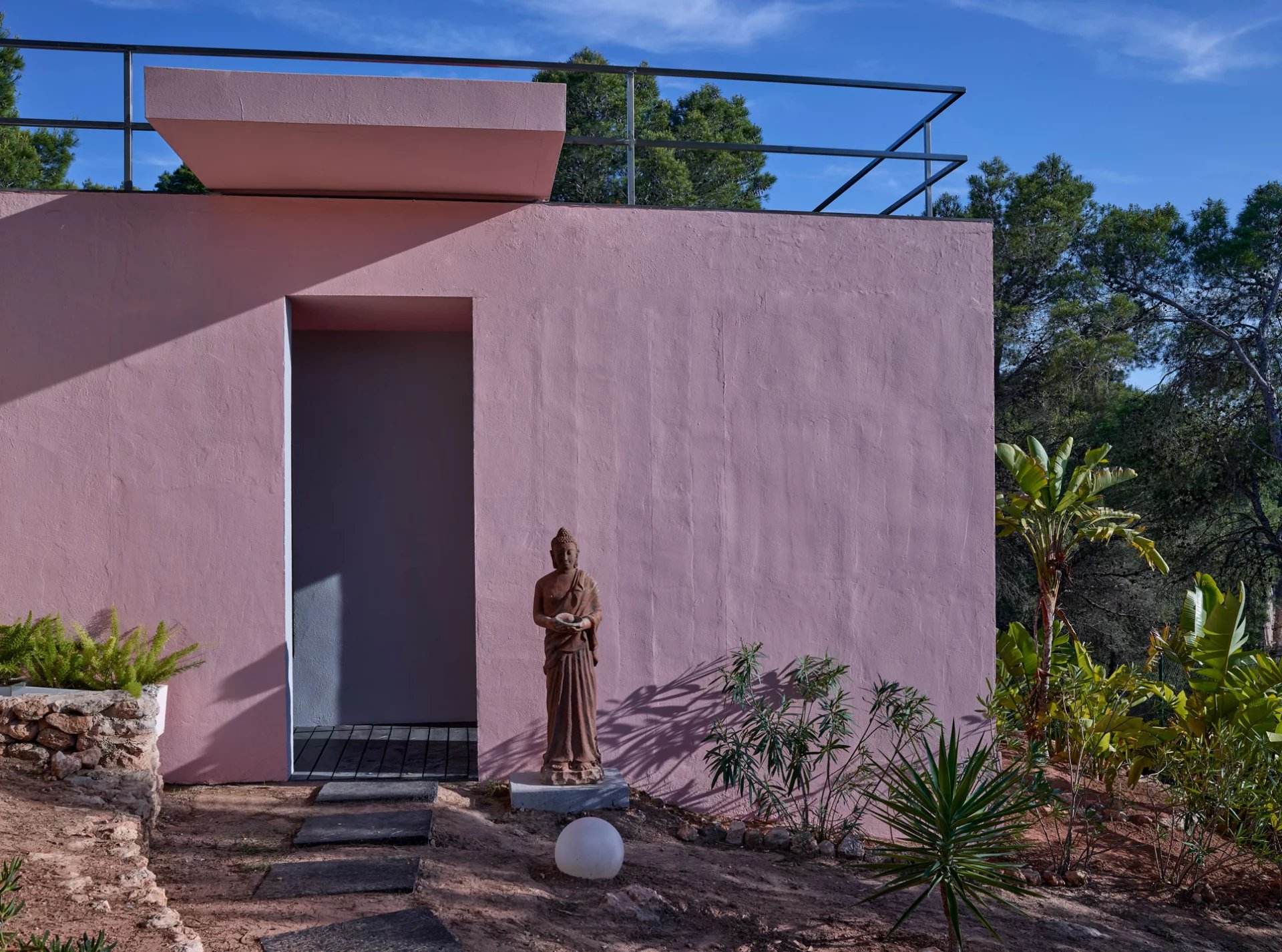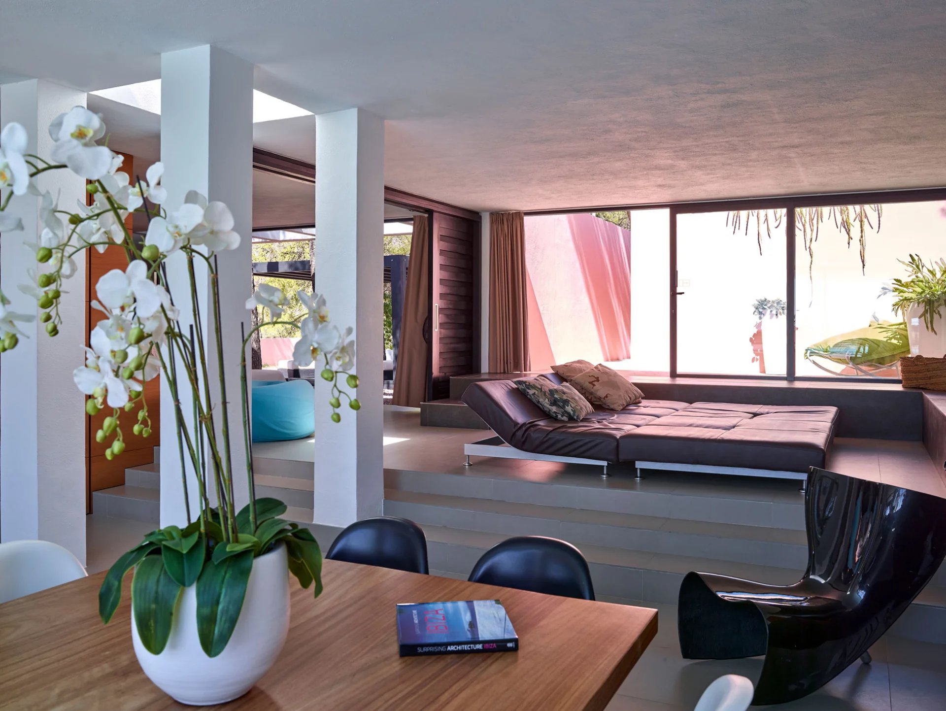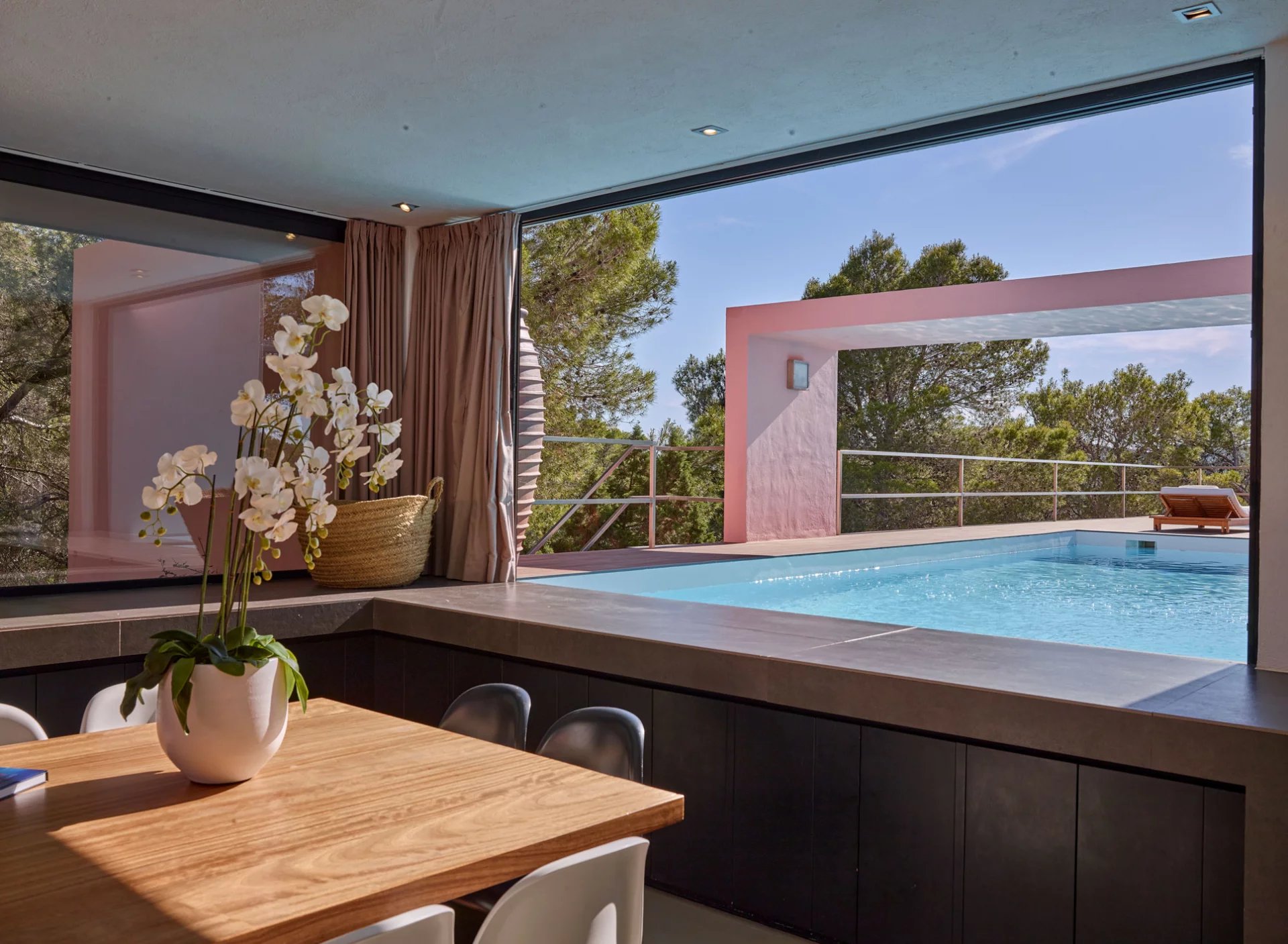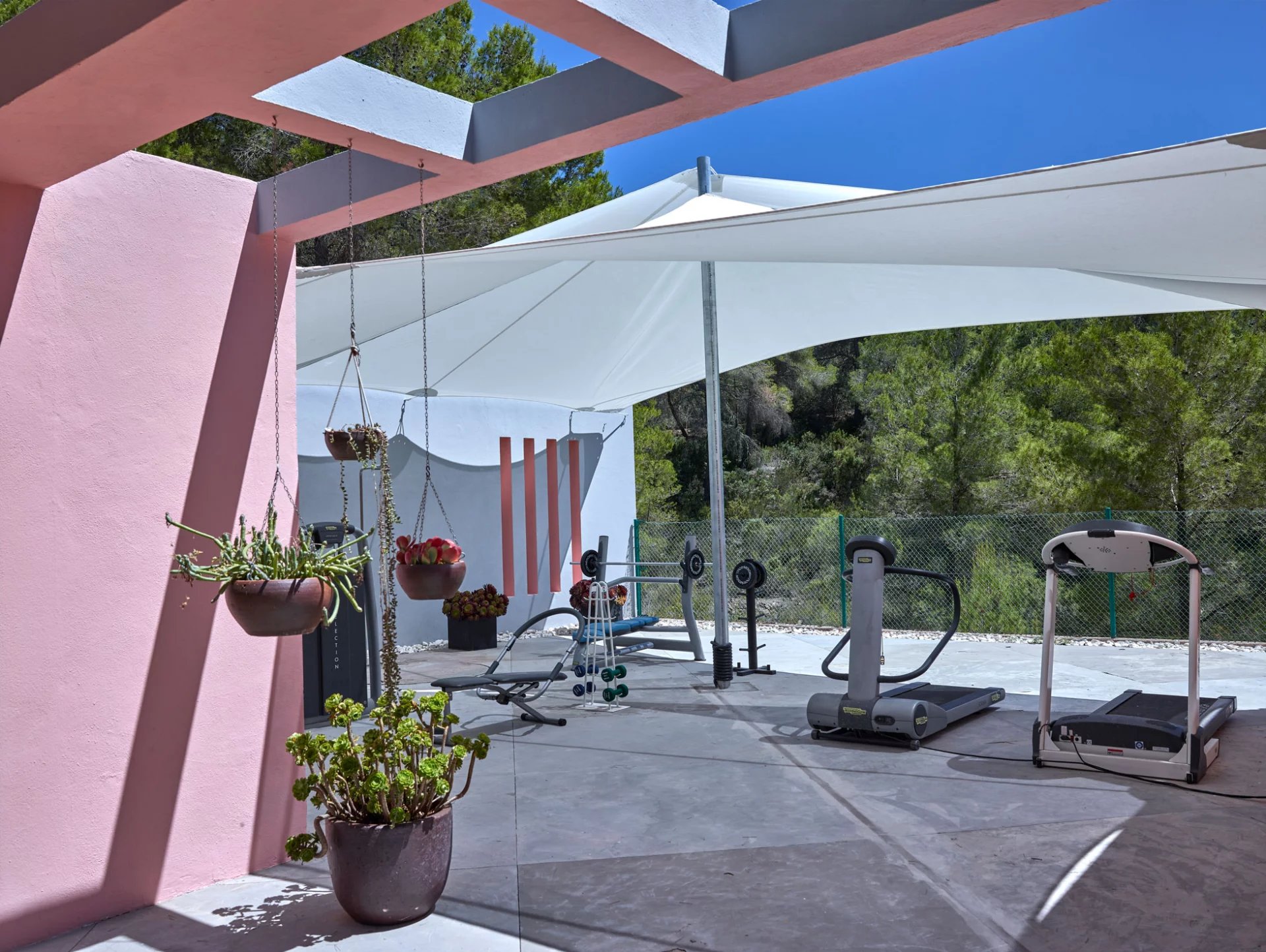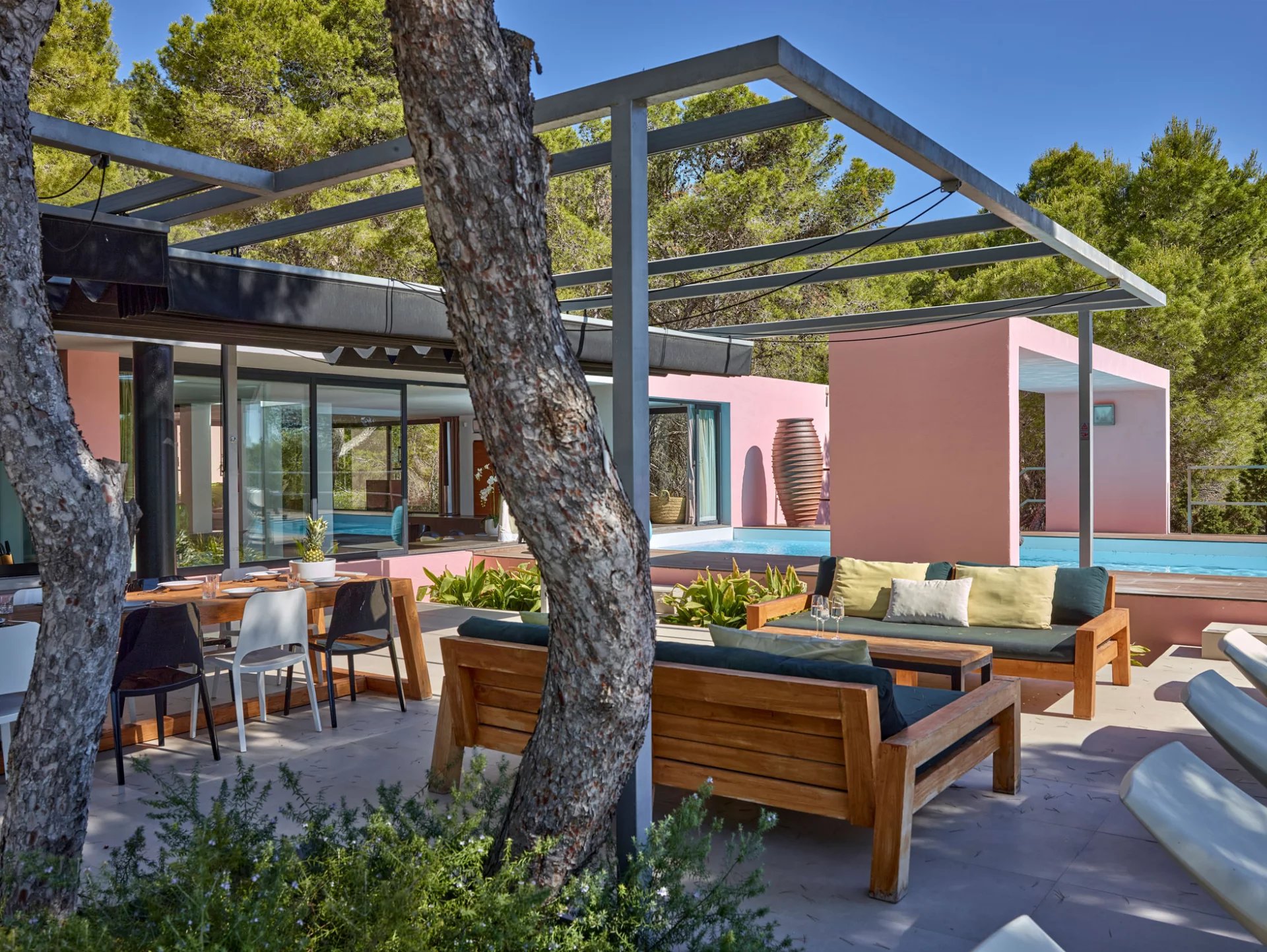The exterior area features a large pool and jacuzzi, surrounded by sun loungers and umbrellas, as well as a barbecue area for outdoor dining. From the furnished terrace, you can enjoy the impressive sea view, making it the ideal spot to enjoy Ibiza's famous sunsets.