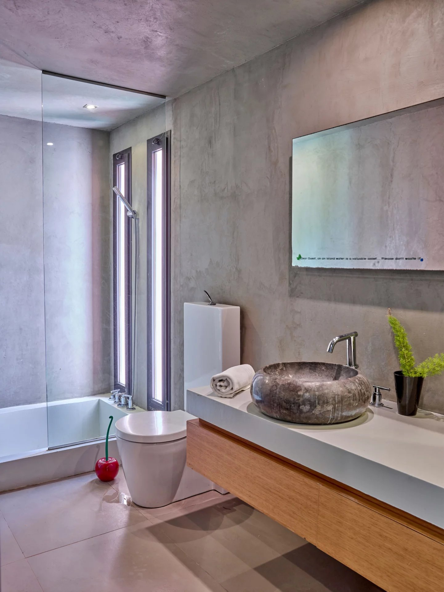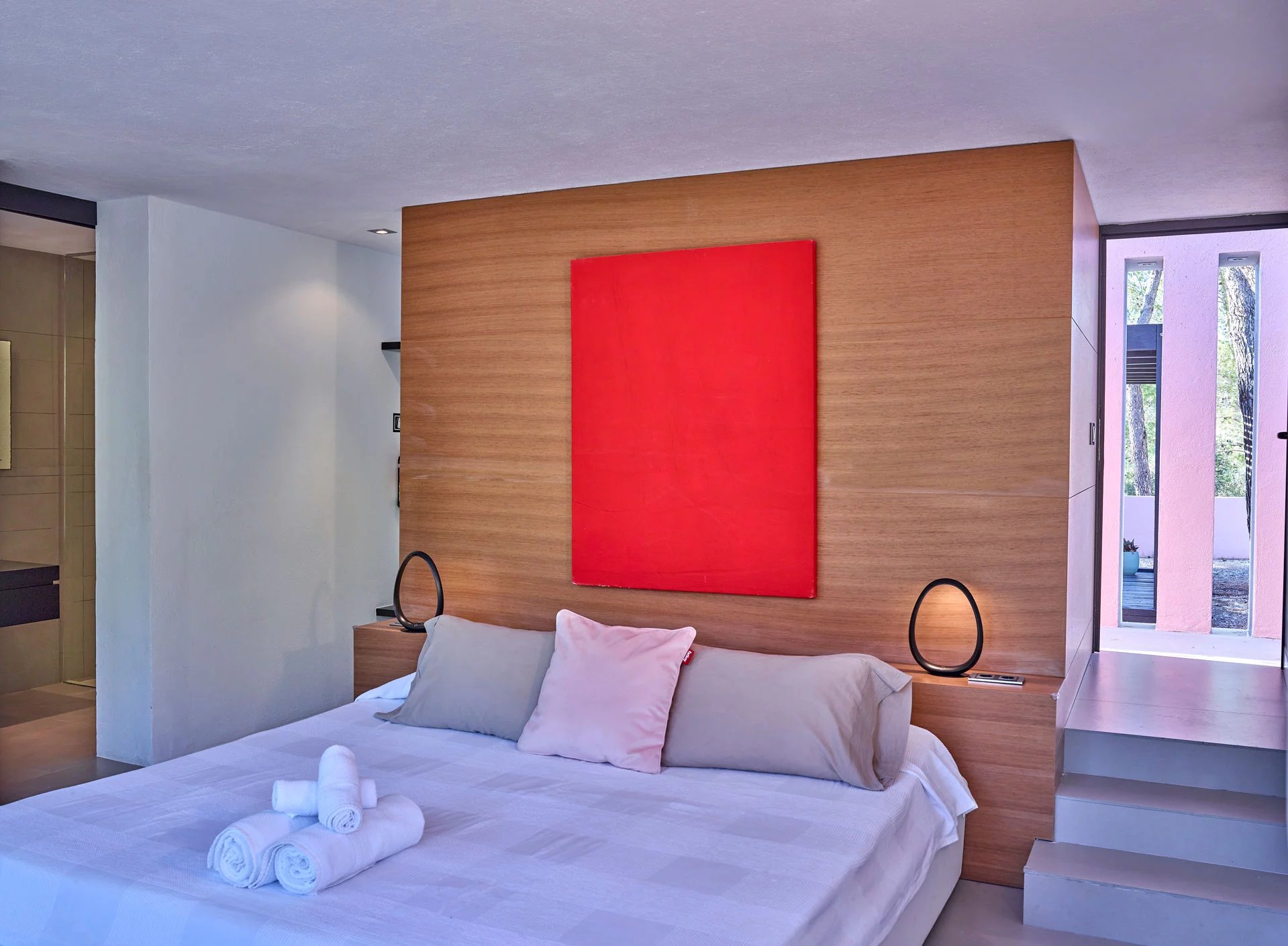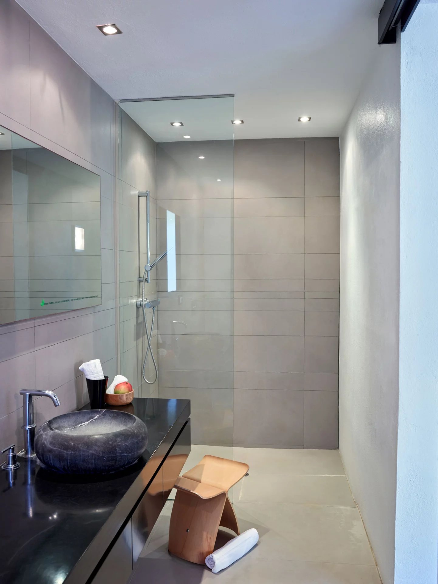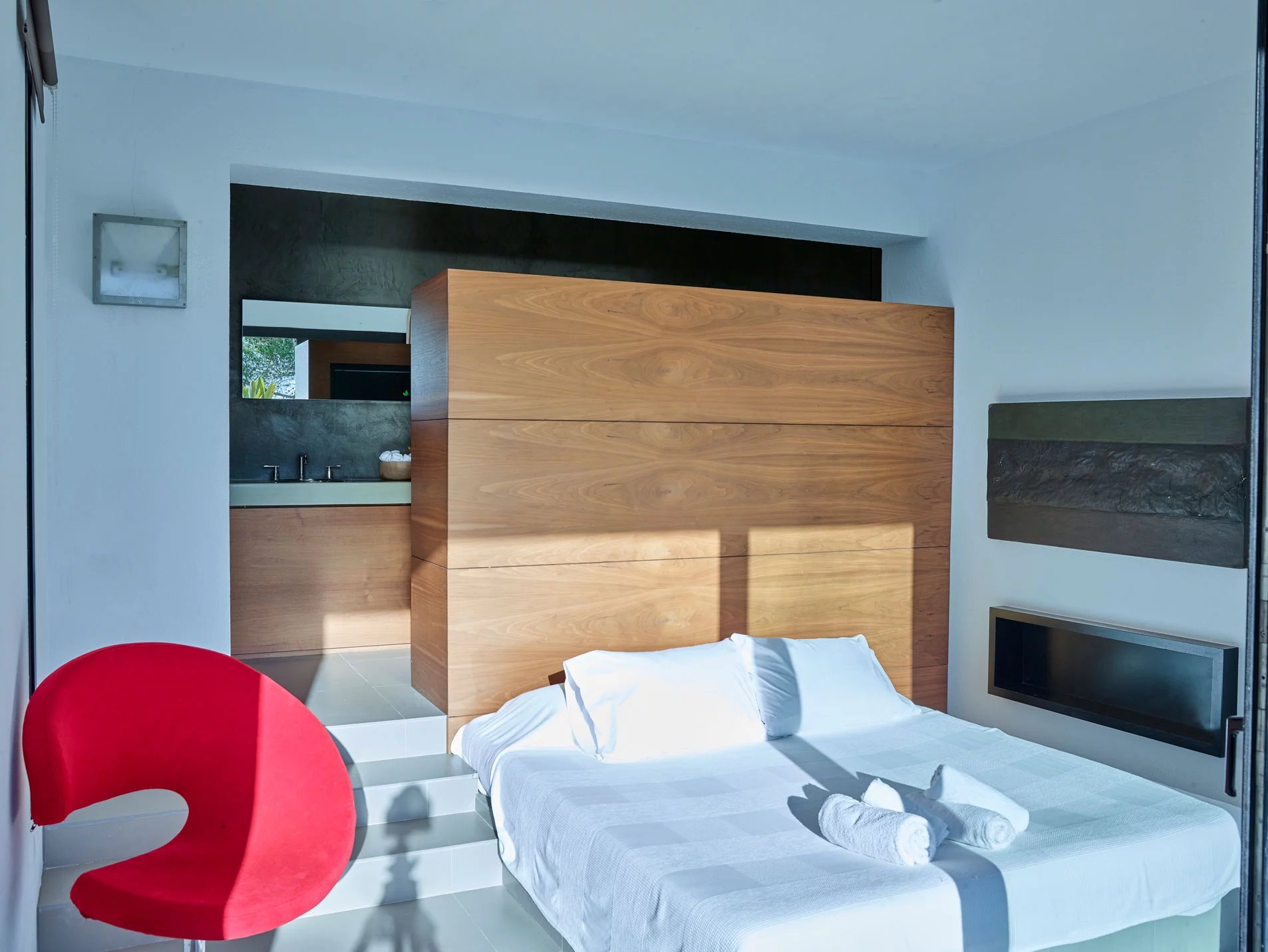 The villa offers several bedrooms with en-suite bathrooms, all with access to the outdoors through large sliding doors. The master bedroom, with an en-suite bathroom that includes a separate shower with side jets, is connected to the main living area but also offers privacy through sliding doors. Other bedrooms have direct access to the garden or a wooden terrace under the pool, creating a unique and relaxing atmosphere.