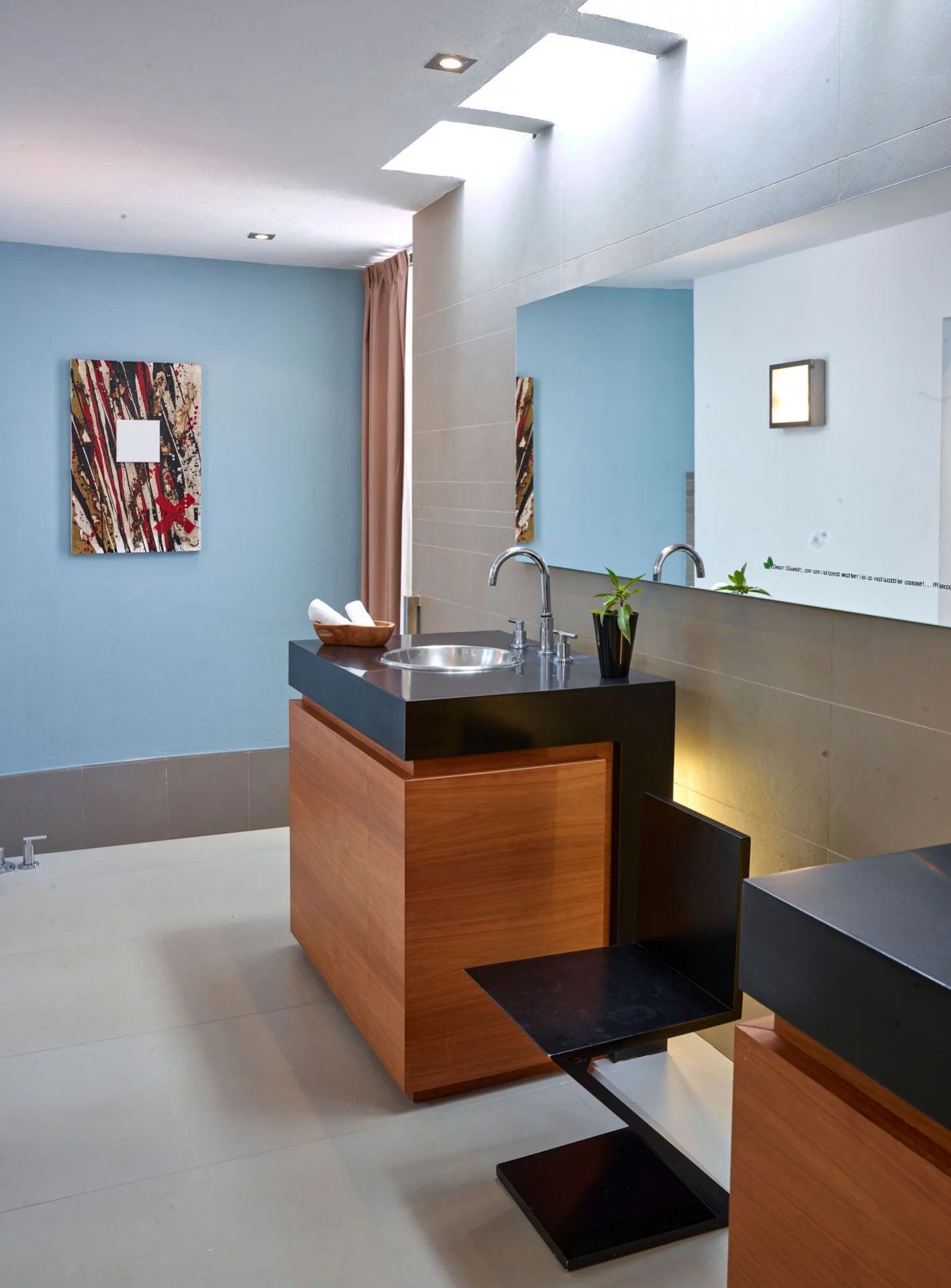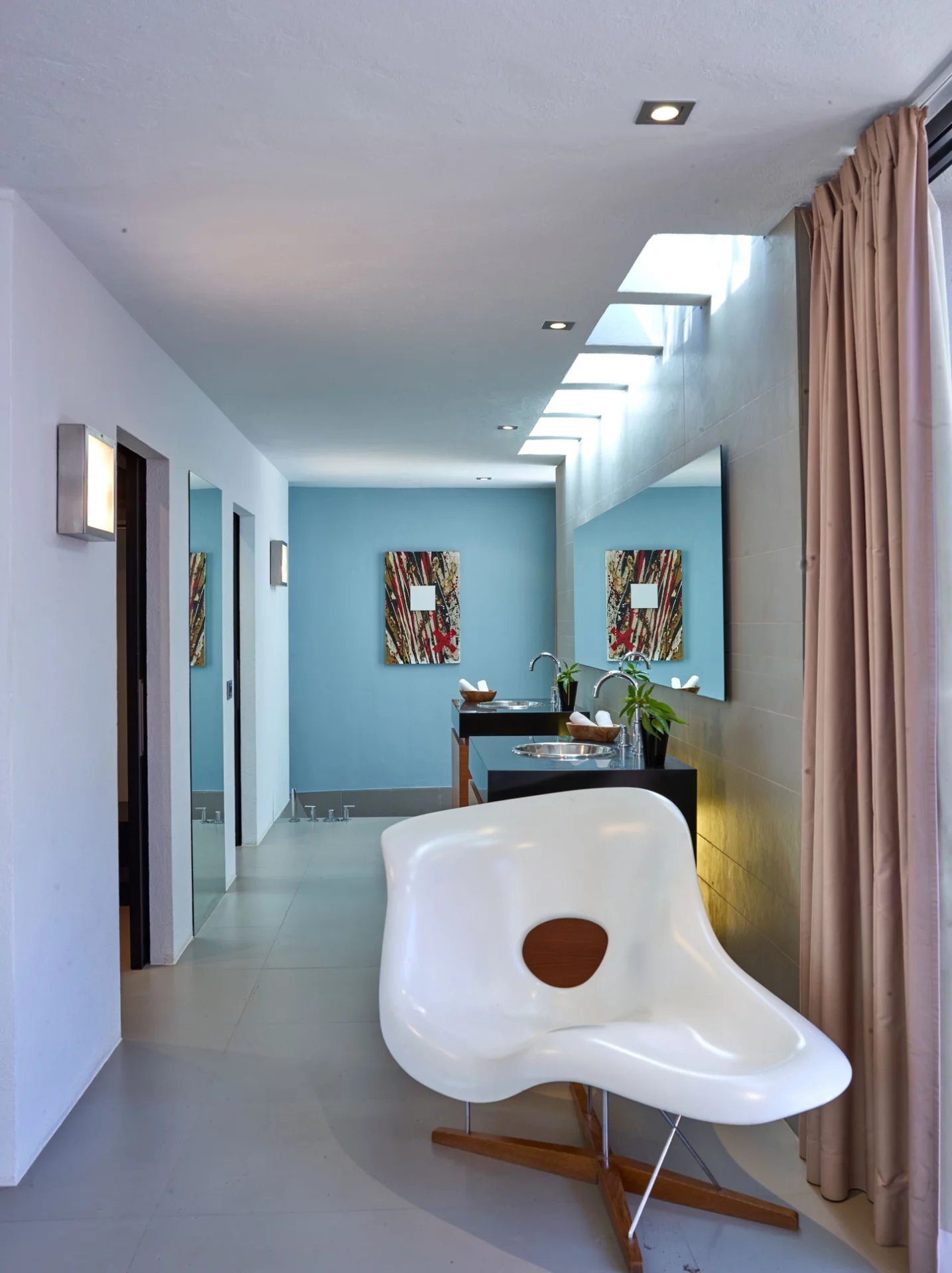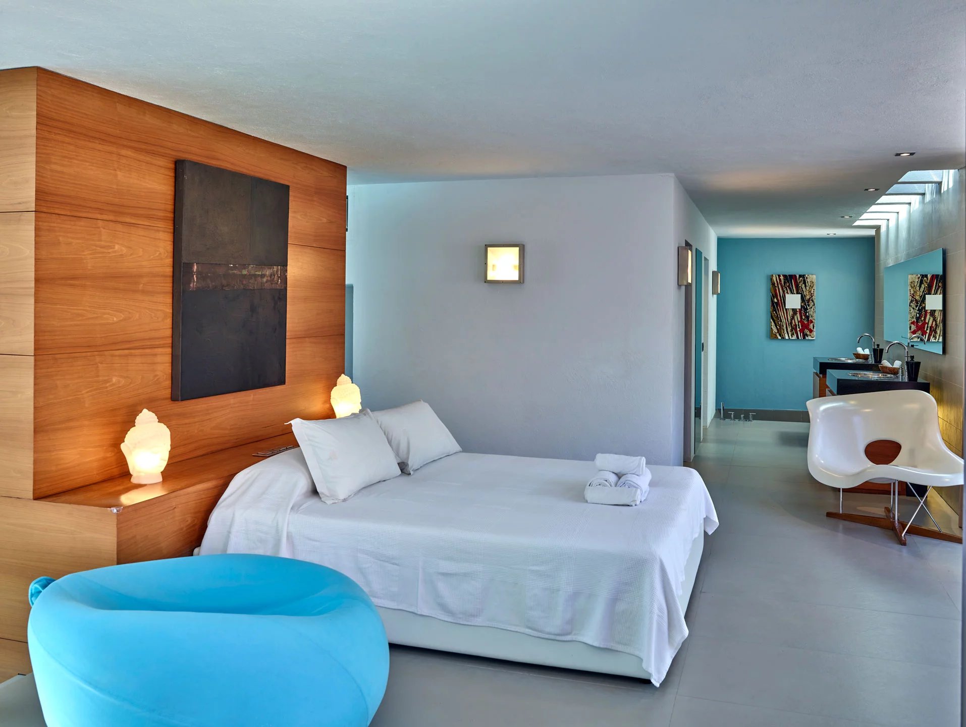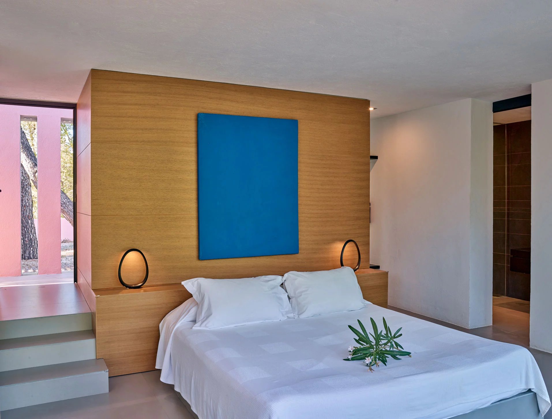 The villa offers several bedrooms with en-suite bathrooms, all with access to the outdoors through large sliding doors. The master bedroom, with an en-suite bathroom that includes a separate shower with side jets, is connected to the main living area but also offers privacy through sliding doors. Other bedrooms have direct access to the garden or a wooden terrace under the pool, creating a unique and relaxing atmosphere.