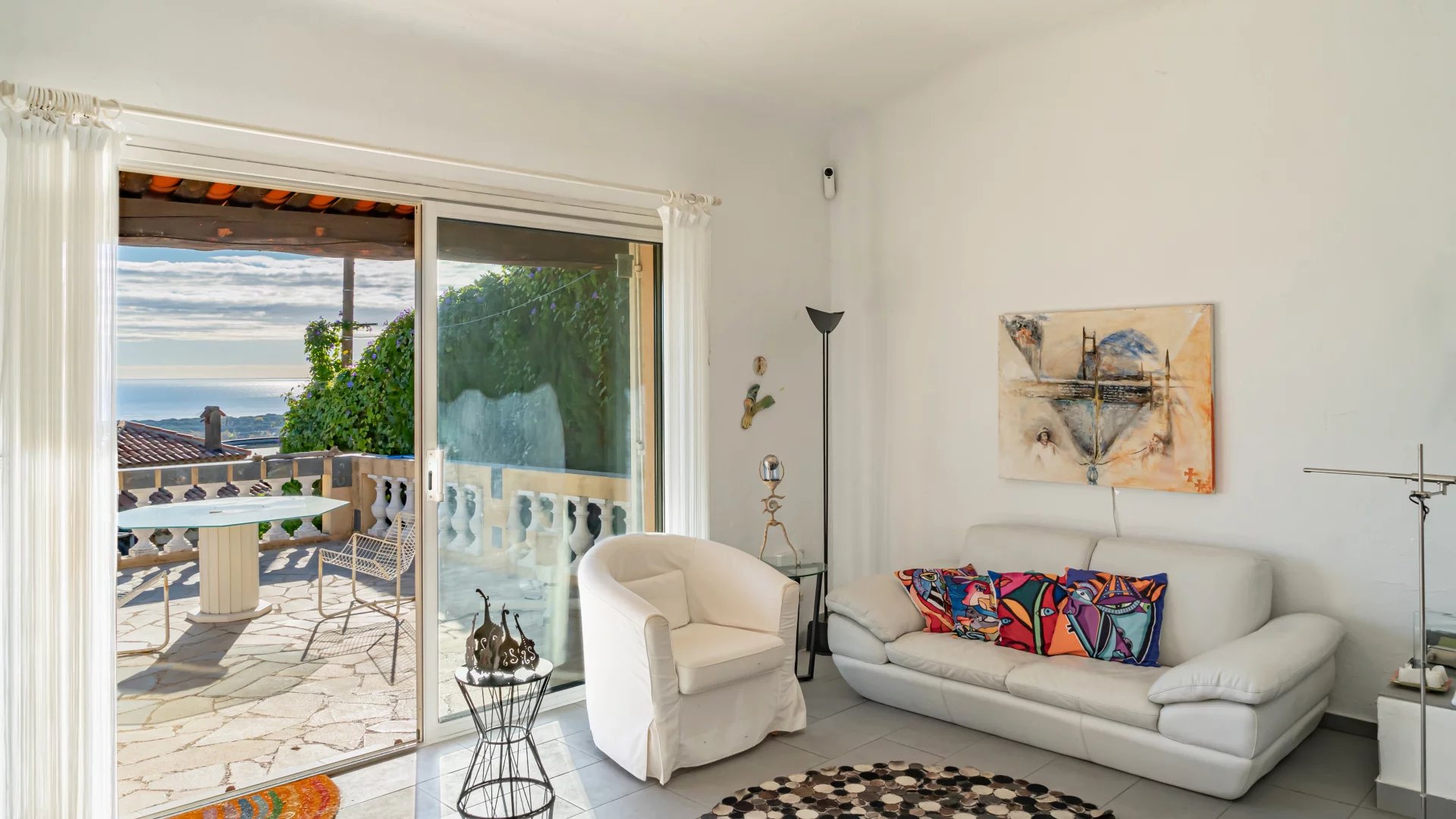- A bright living room with a fireplace, opening onto a large terrace facing the view ;