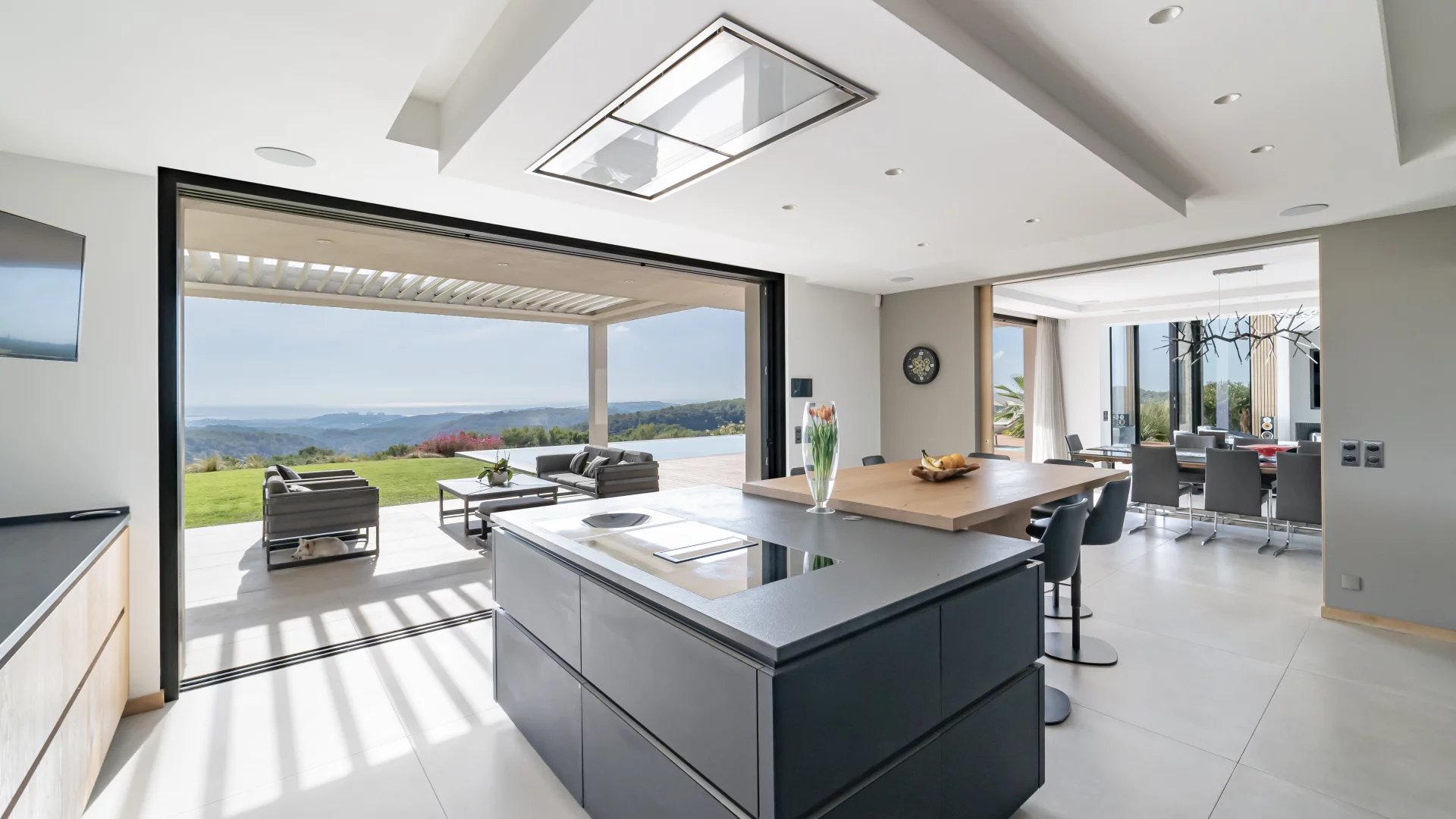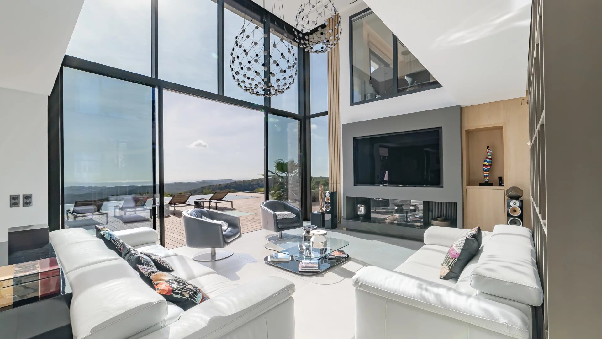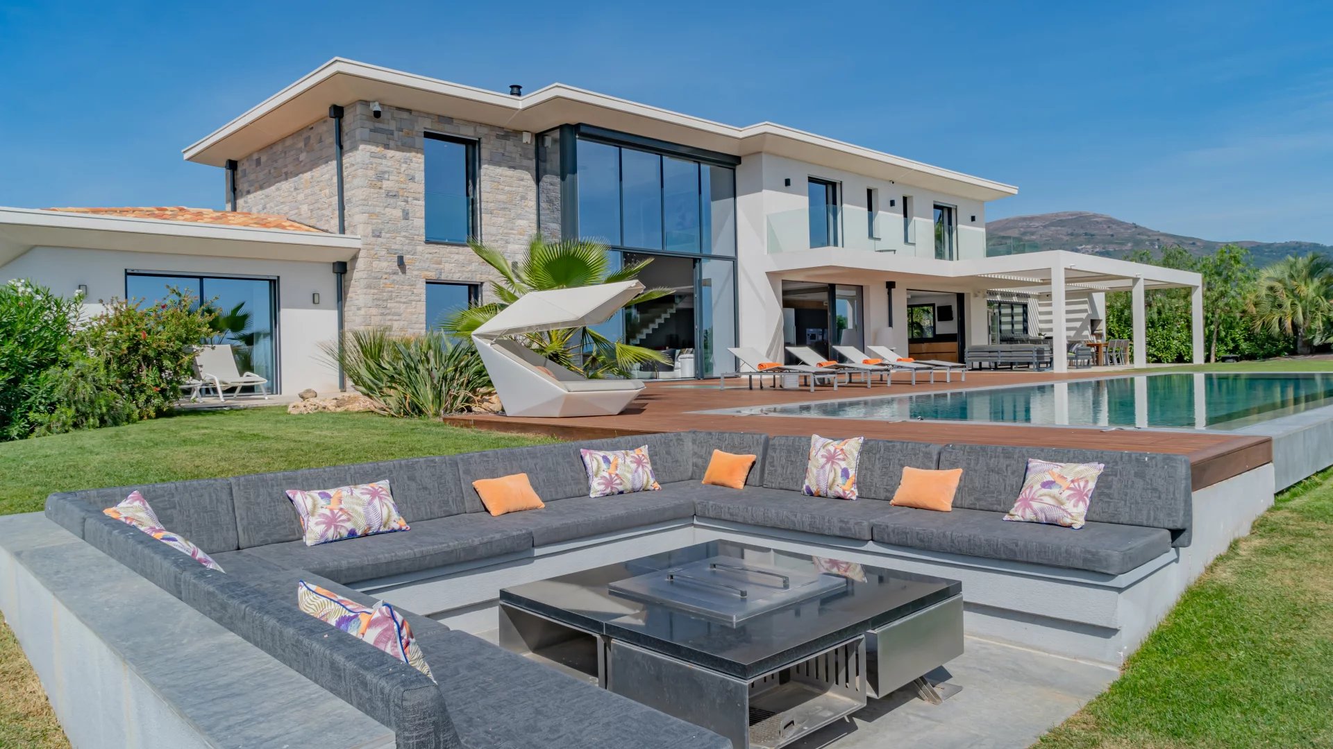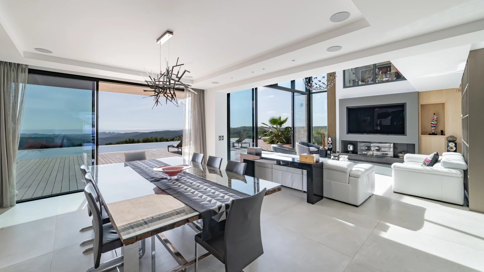 This stunning 2021 villa offers around 500 m² of sleek living space across three levels, with uninterrupted 180° views of the sea and surrounding mountains from every room.