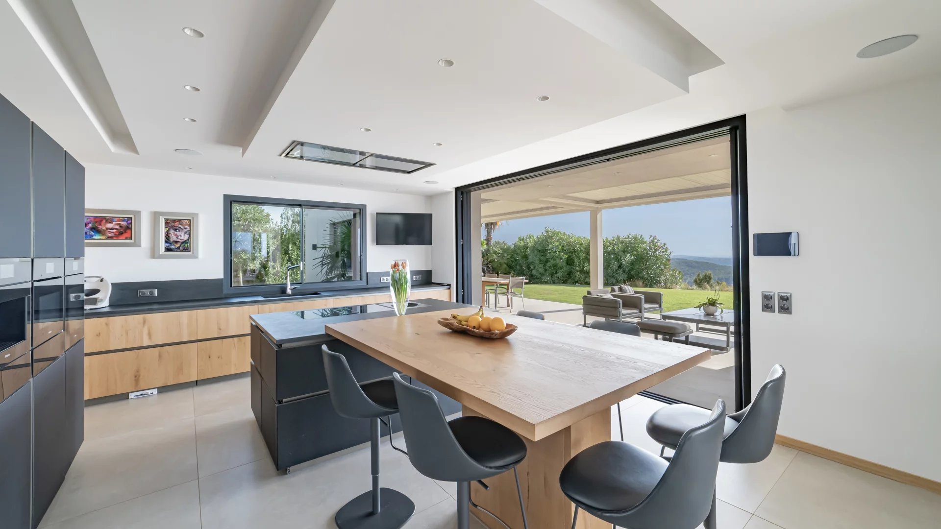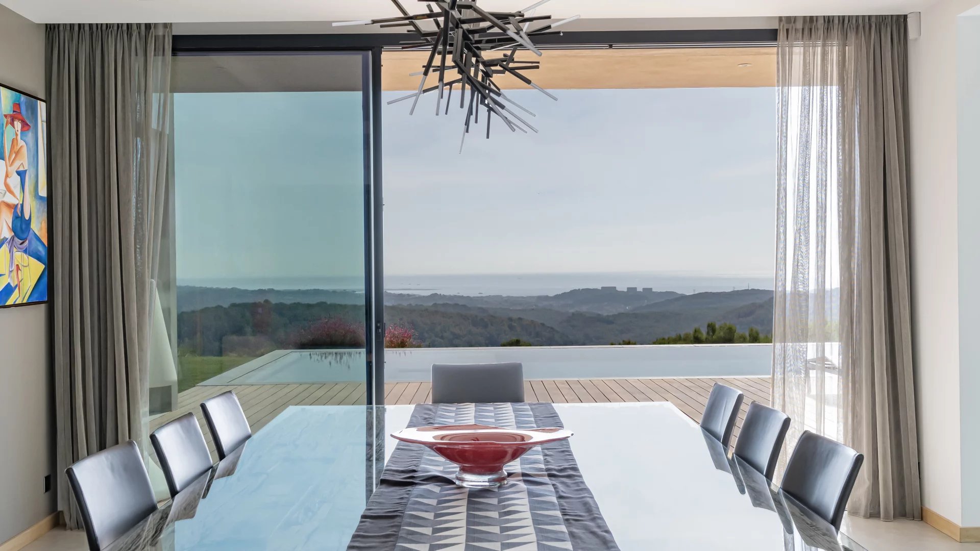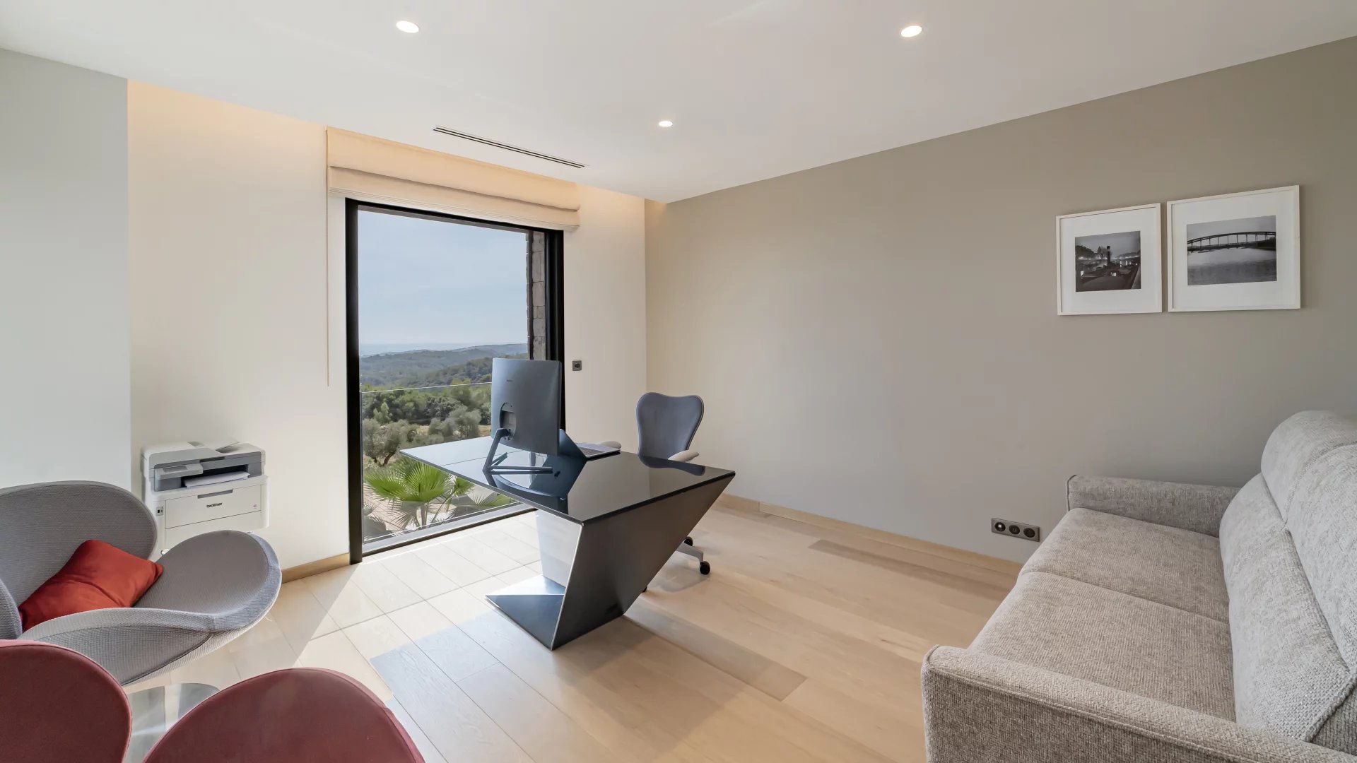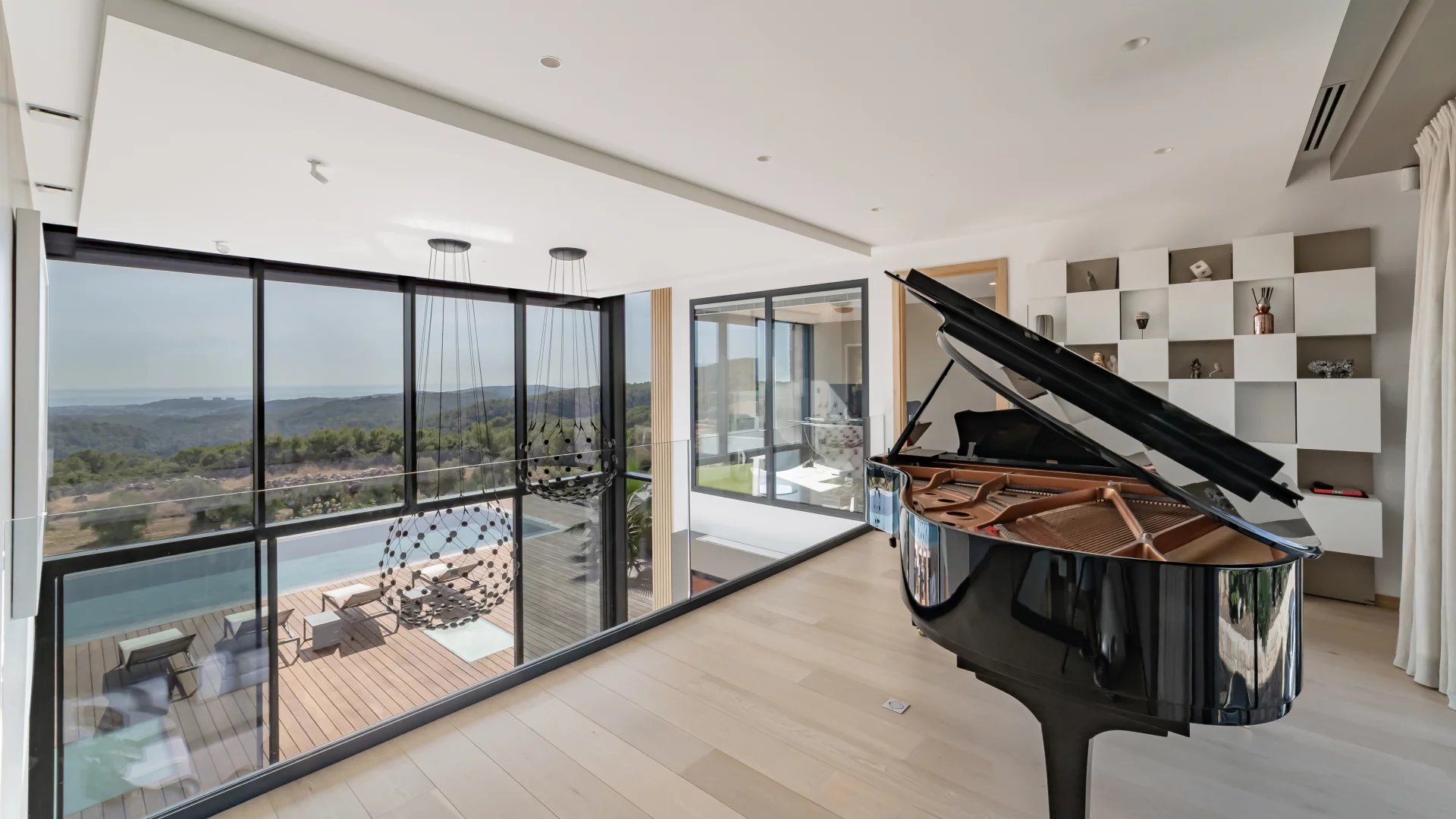 This stunning 2021 villa offers around 500 m² of sleek living space across three levels, with uninterrupted 180° views of the sea and surrounding mountains from every room.