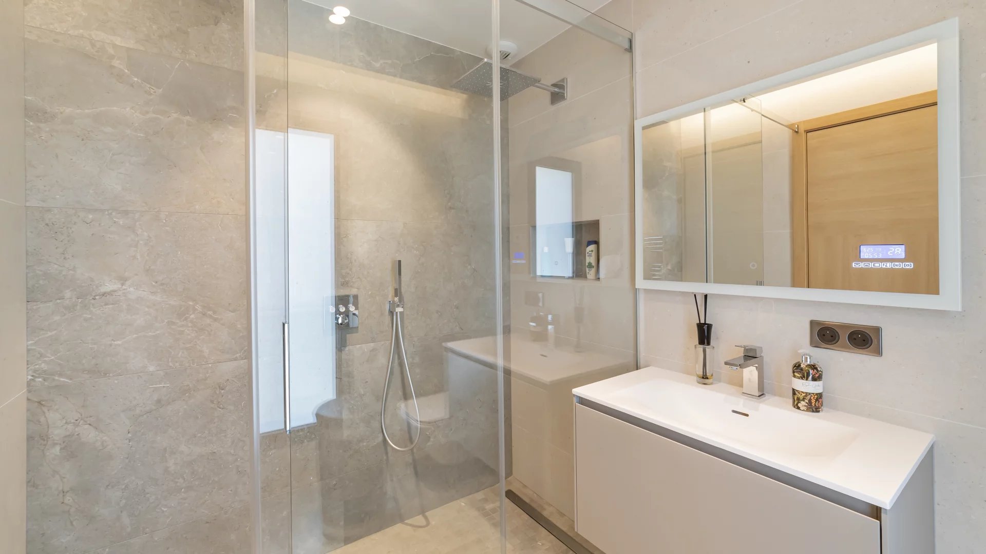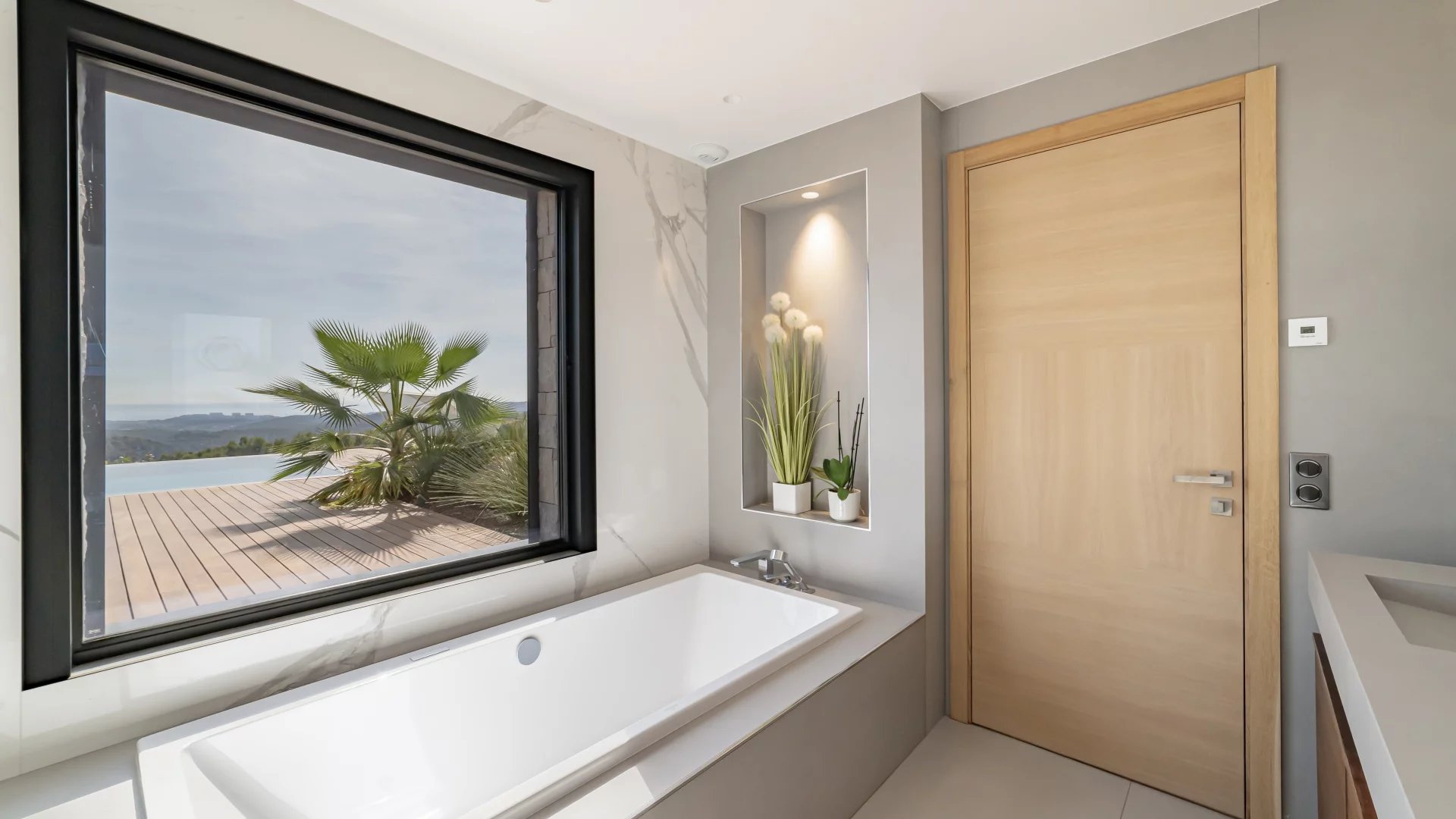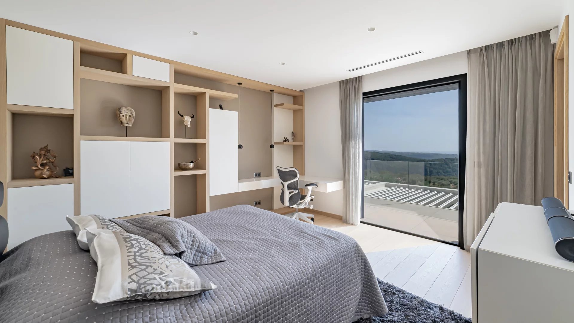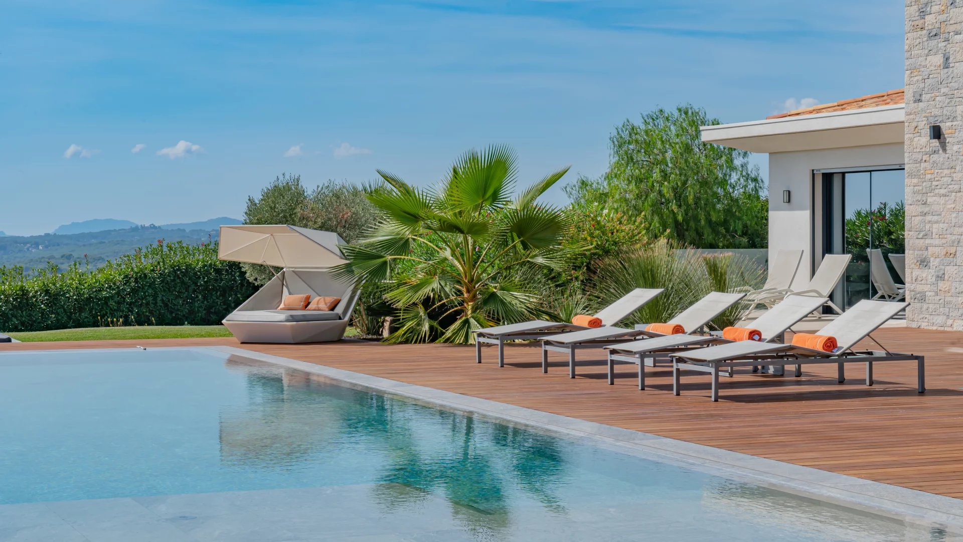 This stunning 2021 villa offers around 500 m² of sleek living space across three levels, with uninterrupted 180° views of the sea and surrounding mountains from every room.