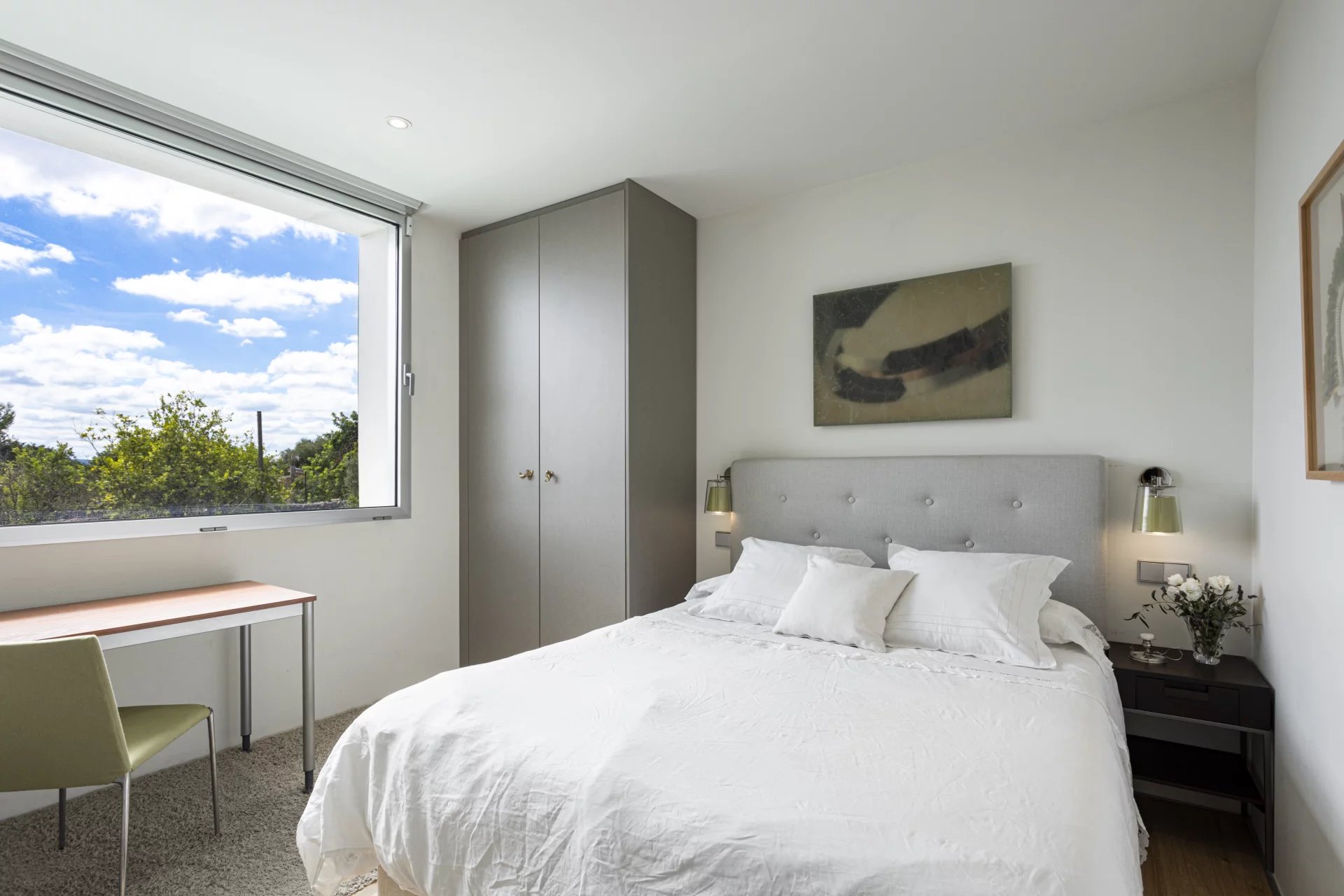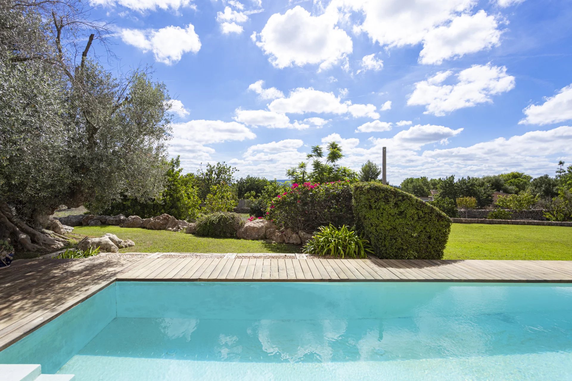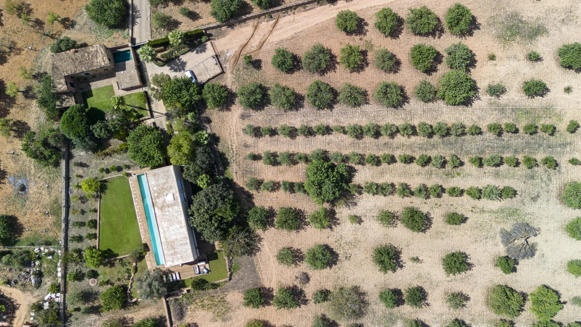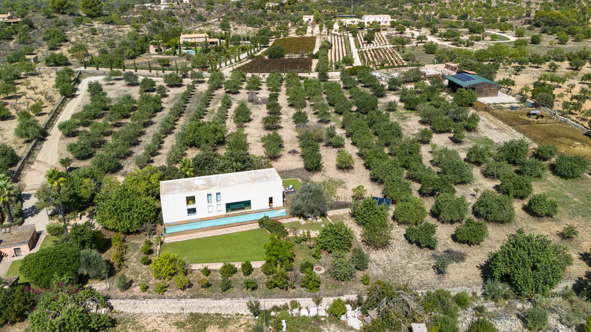 The estate comprises two independent residences. The main house, of modern architecture, stands out for its impressive floor-to-ceiling windows that flood every space with natural light and allow panoramic views of the Mallorcan countryside. It features two bedrooms, two bathrooms, and an extraordinary master suite located on the upper floor alongside an open-plan office with views to both sides of the villa. On the lower level, there is a laundry room, pantry, wine cellar, a spacious storage area with the potential to be converted into a private gym, and a garage with capacity for three vehicles and an electric charging station. Outdoors, a 25-meter heated swimming pool becomes the centerpiece, accompanied by a majestic thousand-year-old olive tree that enhances the Mediterranean essence of the property. The house is equipped with underfloor heating and ducted air conditioning, ensuring comfort throughout the year.