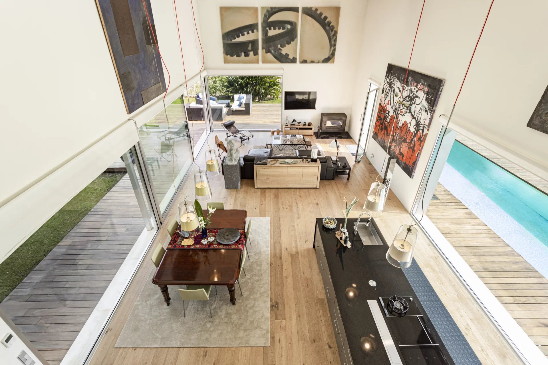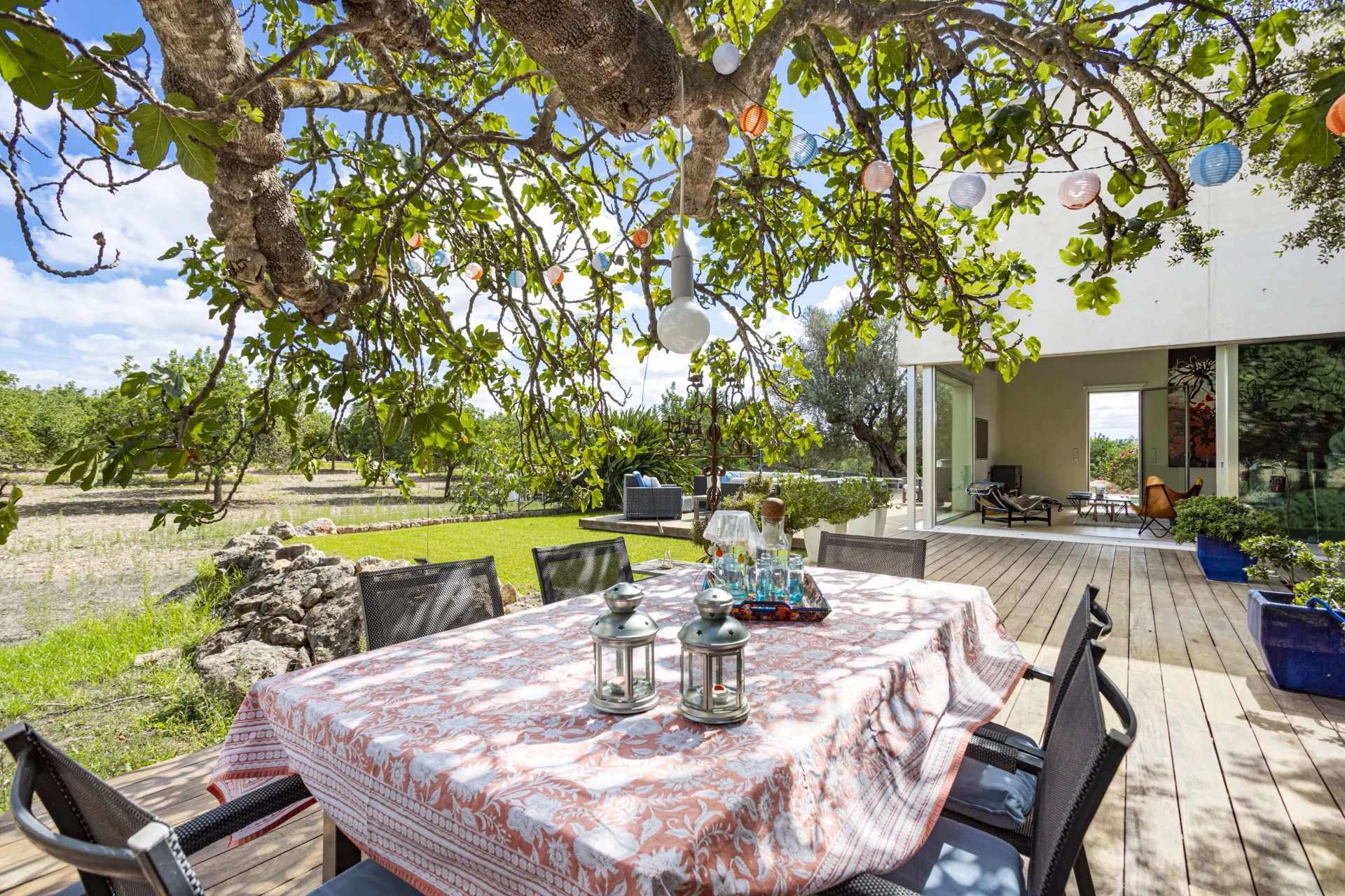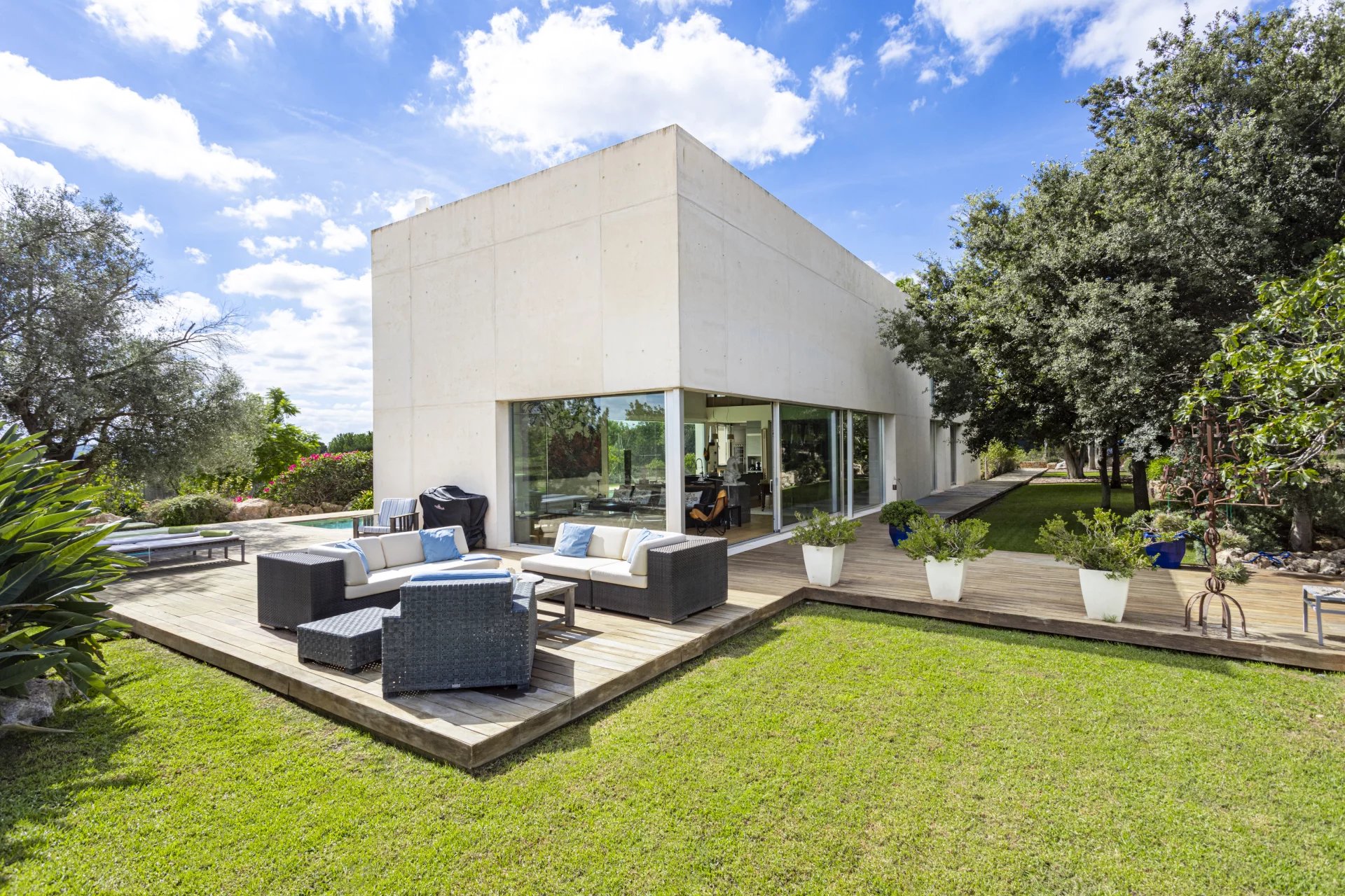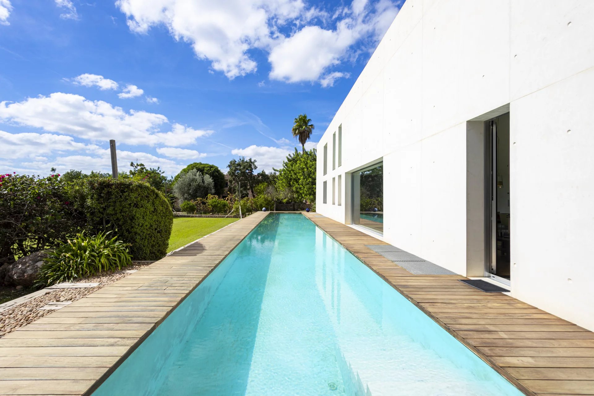 The estate comprises two independent residences. The main house, of modern architecture, stands out for its impressive floor-to-ceiling windows that flood every space with natural light and allow panoramic views of the Mallorcan countryside. It features two bedrooms, two bathrooms, and an extraordinary master suite located on the upper floor alongside an open-plan office with views to both sides of the villa. On the lower level, there is a laundry room, pantry, wine cellar, a spacious storage area with the potential to be converted into a private gym, and a garage with capacity for three vehicles and an electric charging station. Outdoors, a 25-meter heated swimming pool becomes the centerpiece, accompanied by a majestic thousand-year-old olive tree that enhances the Mediterranean essence of the property. The house is equipped with underfloor heating and ducted air conditioning, ensuring comfort throughout the year.