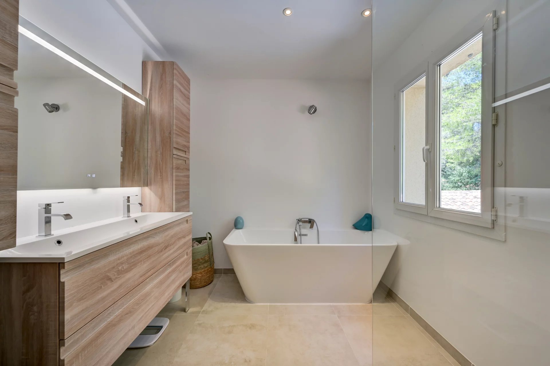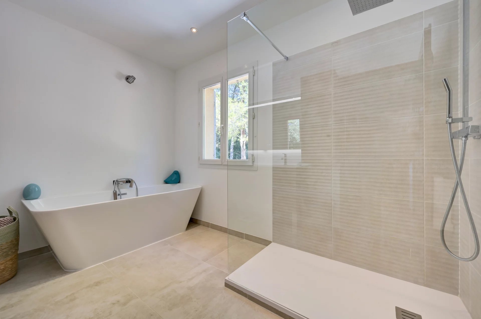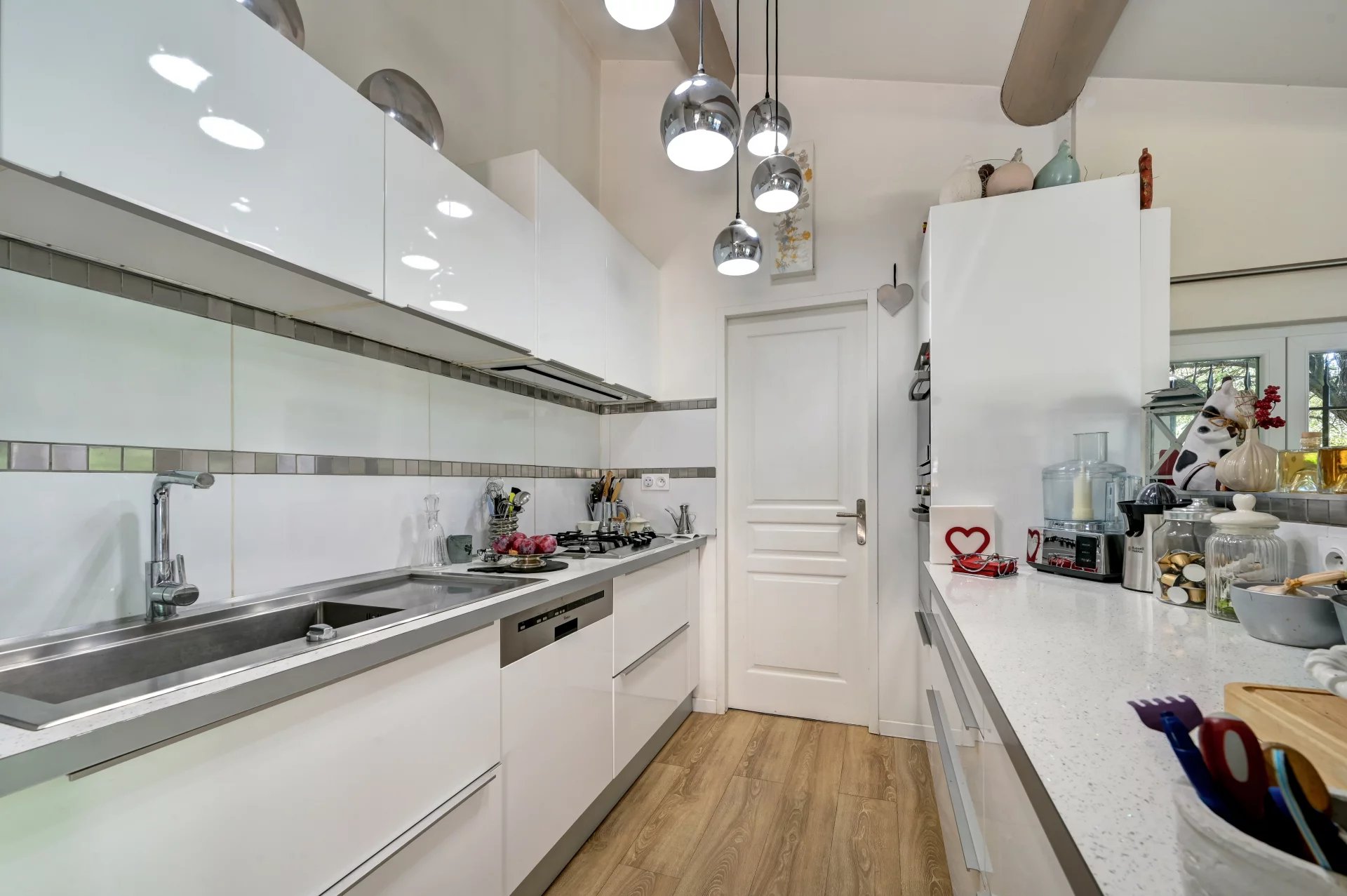The main house features generous volumes. On the first floor, a vast, light-filled living room opens onto a south-facing terrace and landscaped garden. The modern kitchen, extended by a laundry room and storeroom, is accompanied by an office and a ground-level suite, ideal for everyday comfort. Upstairs, a master suite with dressing room is complemented by two additional bedrooms sharing a bathroom.