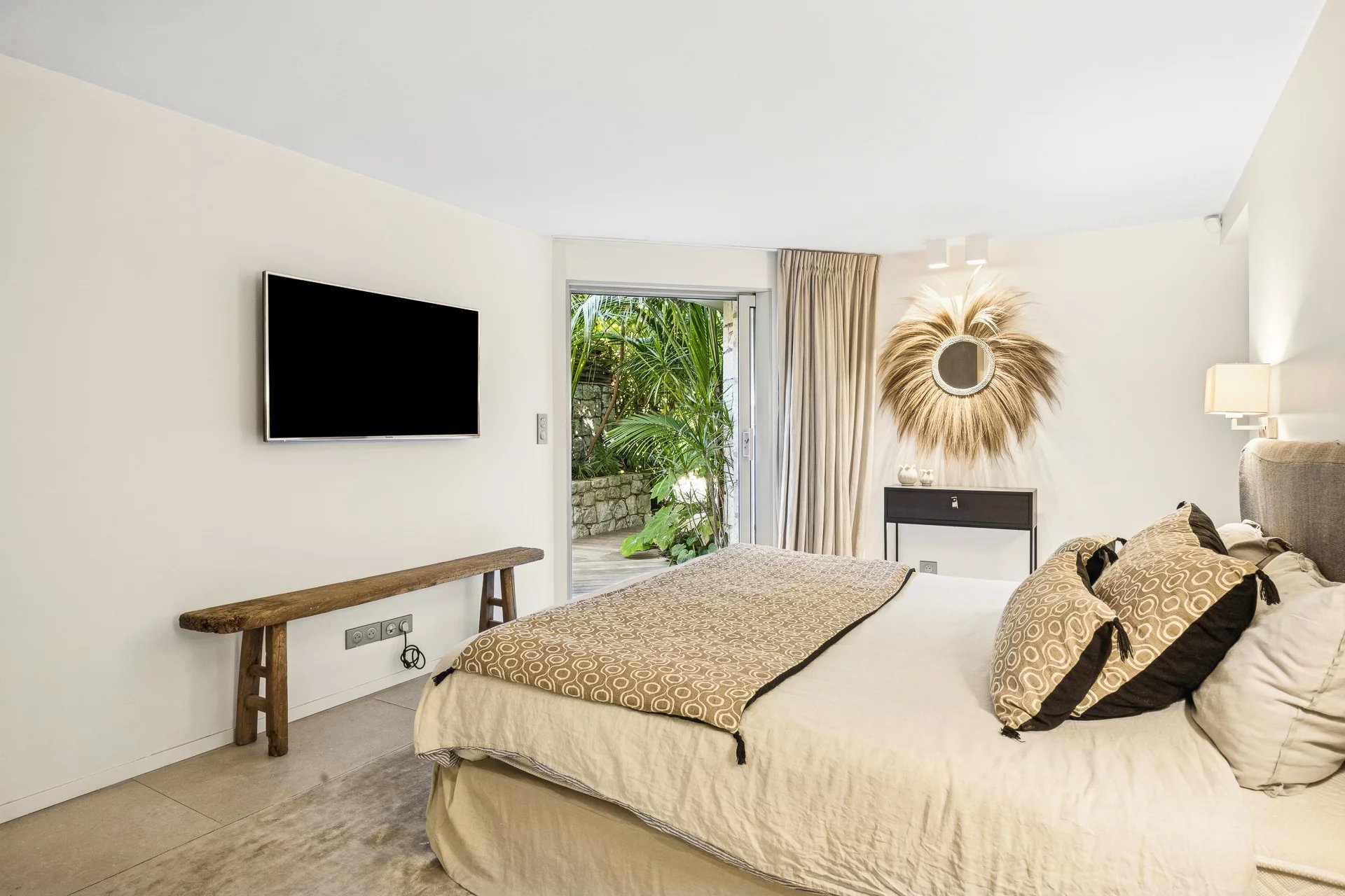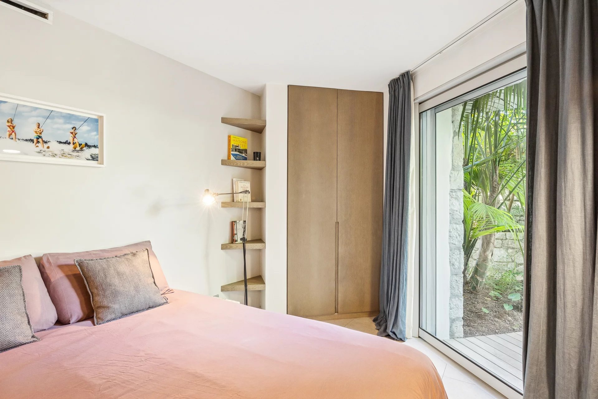 Upon entering, you will be charmed by the large bright living room, which opens onto a fully equipped modern kitchen. The living space has direct access to a magnificent Tropezian terrace of approximately 25 sqm, offering breathtaking views of the sea and the bay of Cannes.
