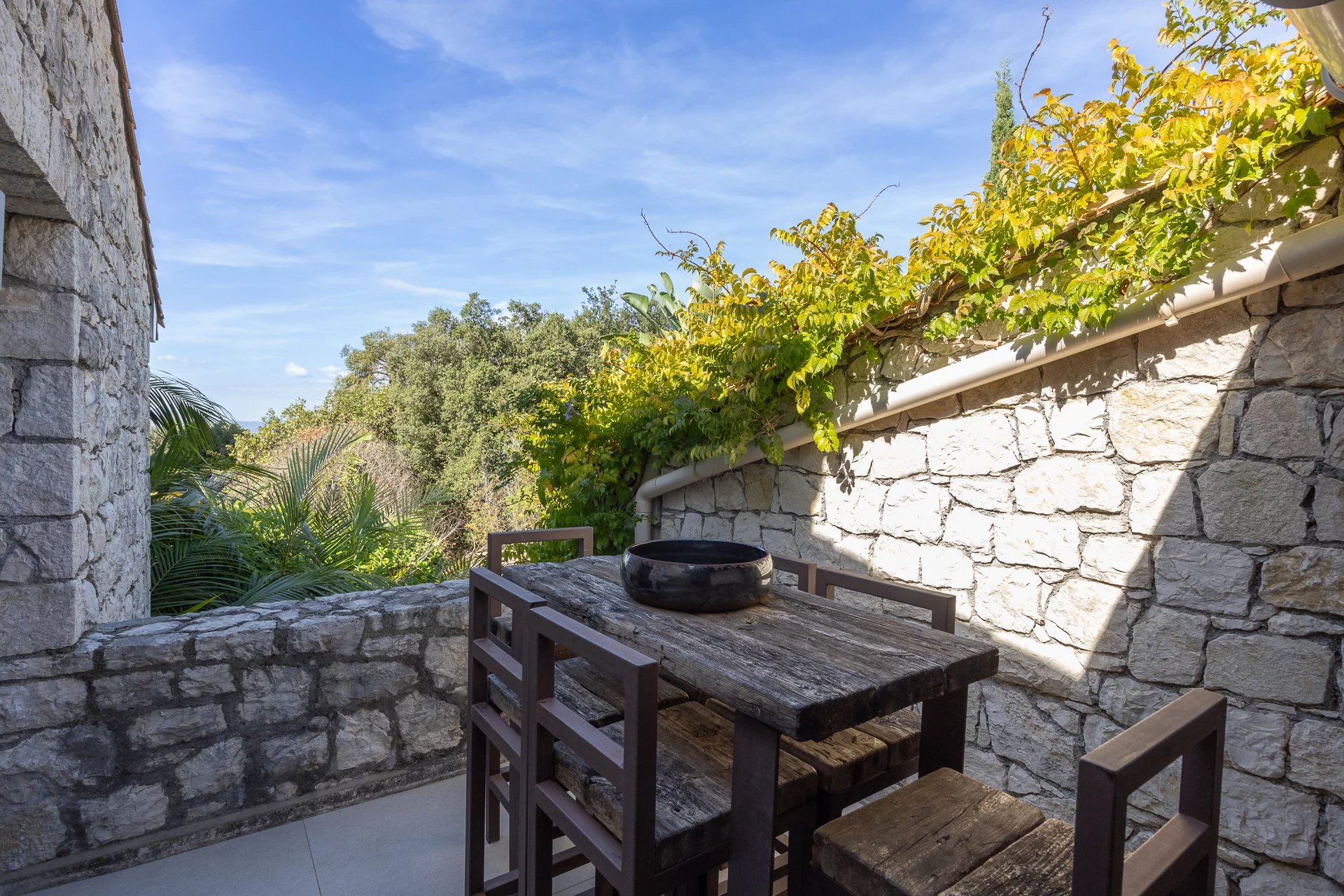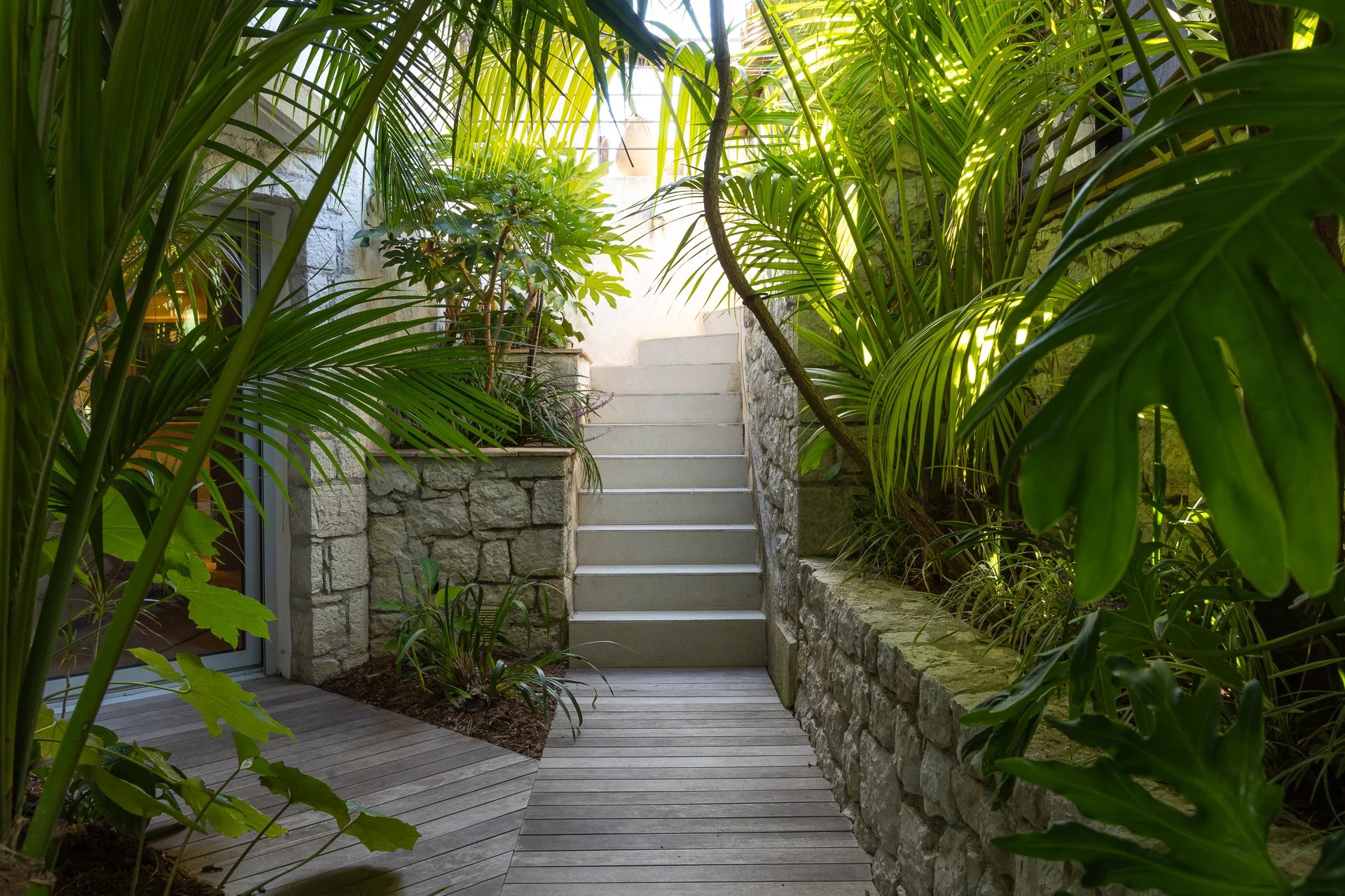 The private garden, a true tropical oasis, features a heated saltwater pool surrounded by lush vegetation reminiscent of Bali landscapes. The exterior stone walls bring an authentic touch and intimacy to this exceptional outdoor space.