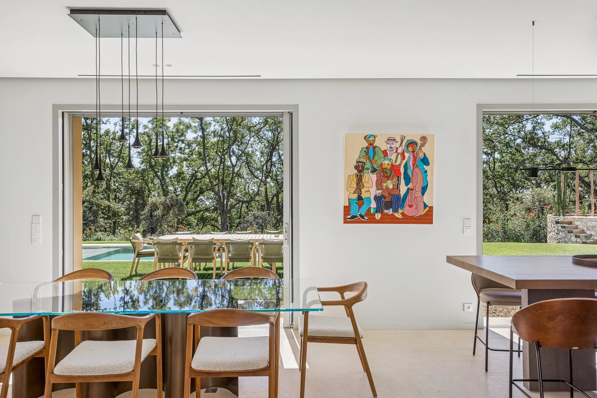 The villa impresses with its high-quality finishes and authentic materials, including genuine local stone. It offers generous living spaces, with a spacious living room opening onto the terrace and the 12-meter swimming pool, as well as a fully equipped modern kitchen.