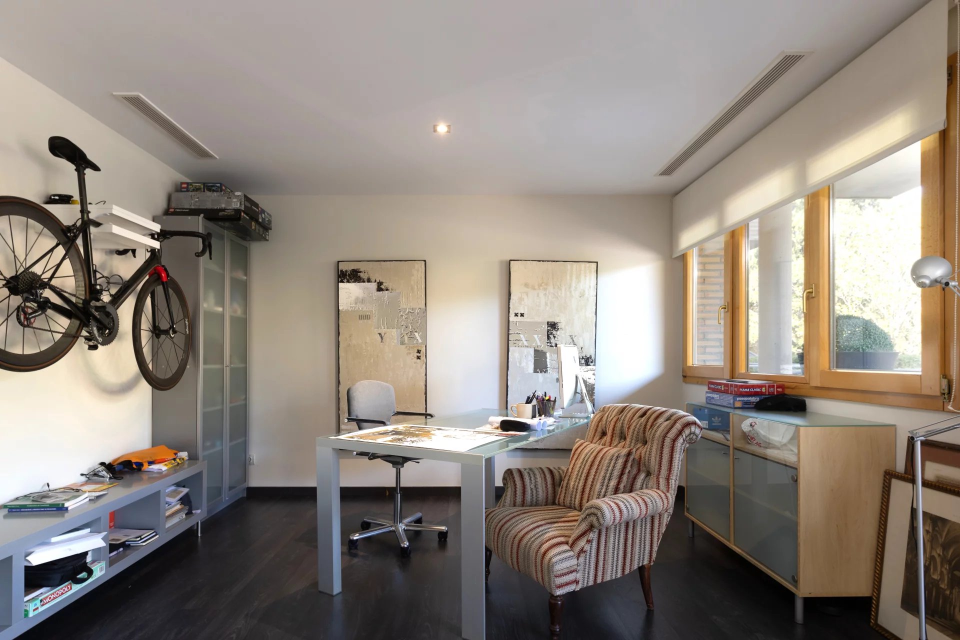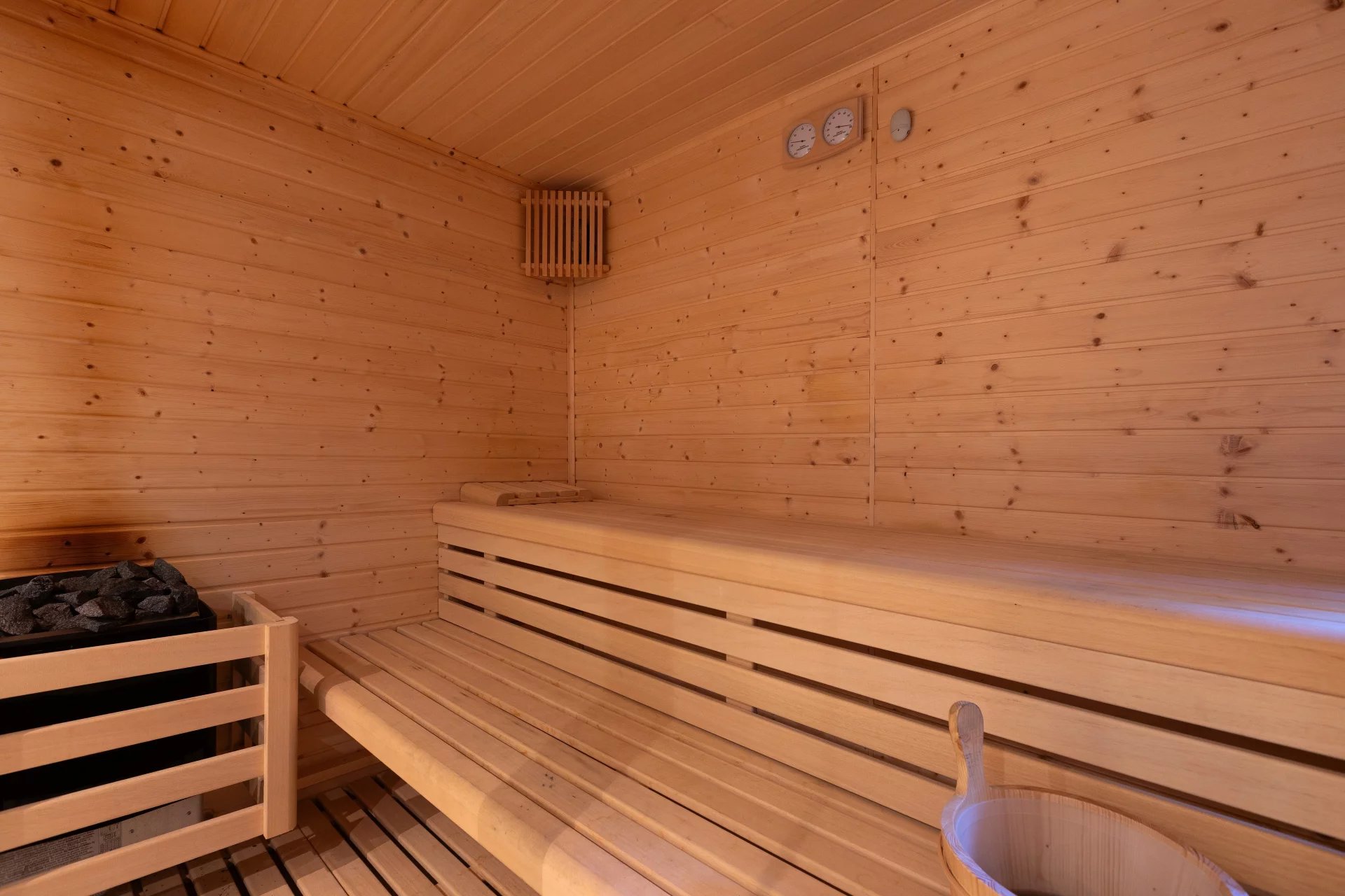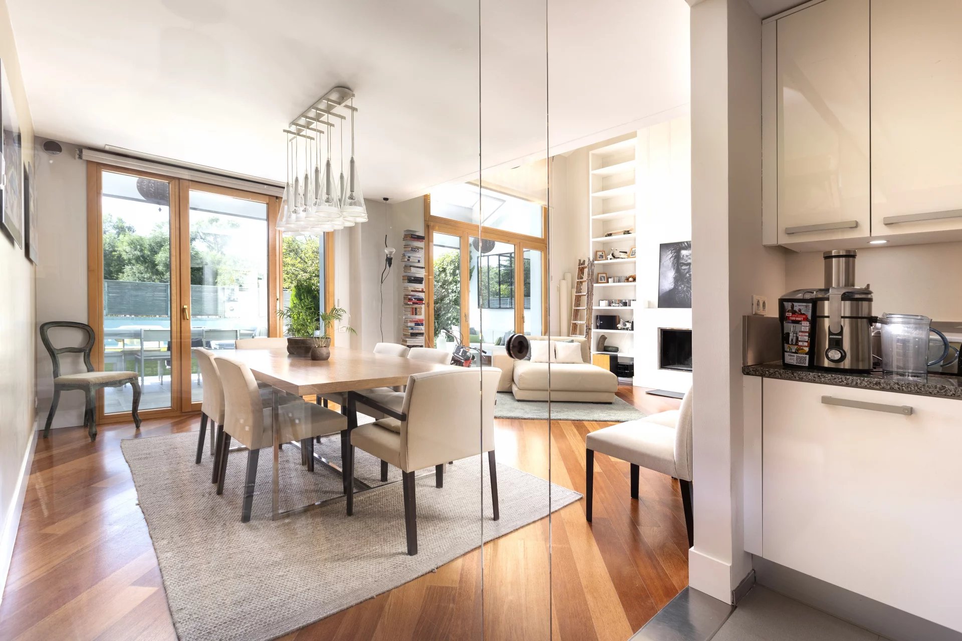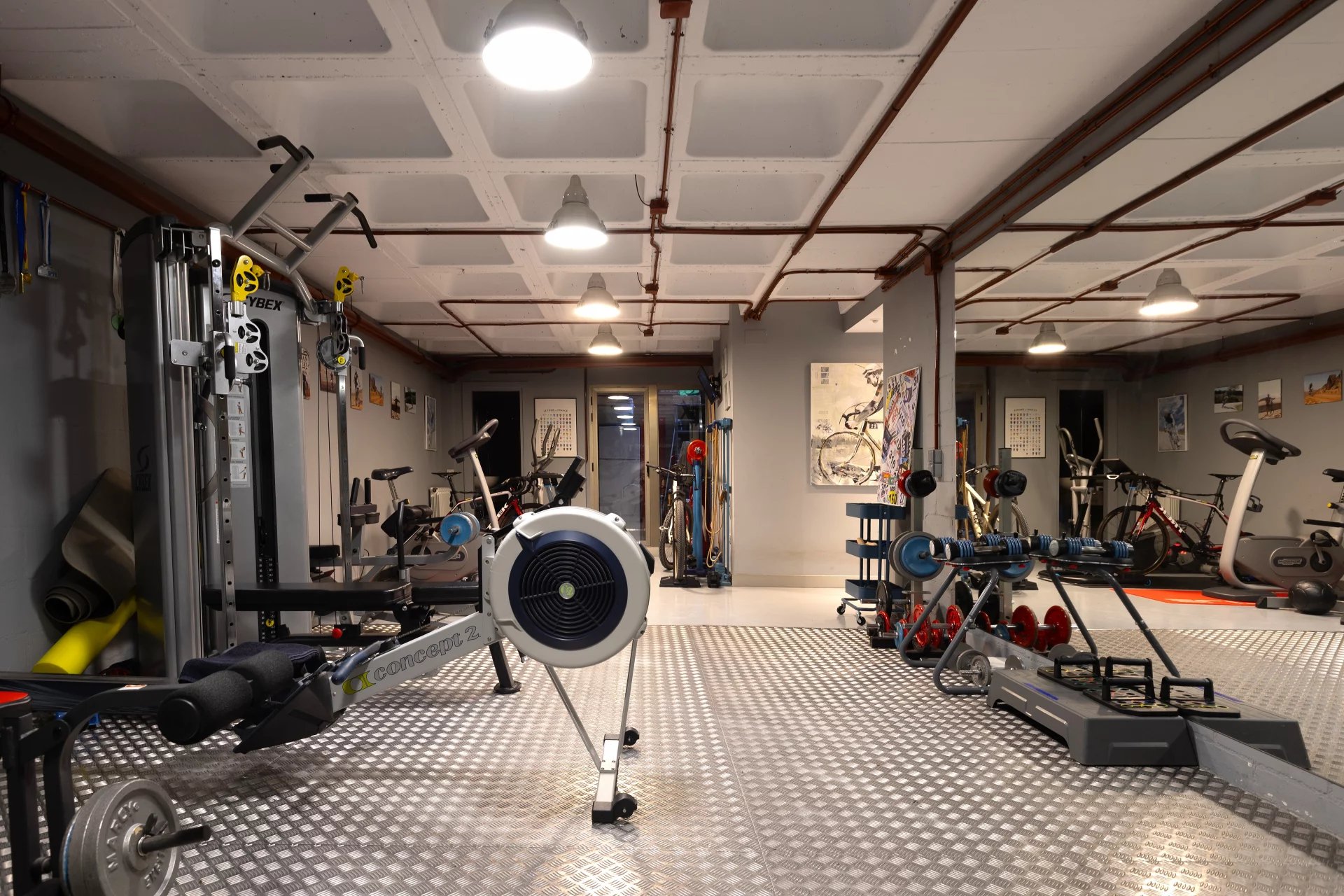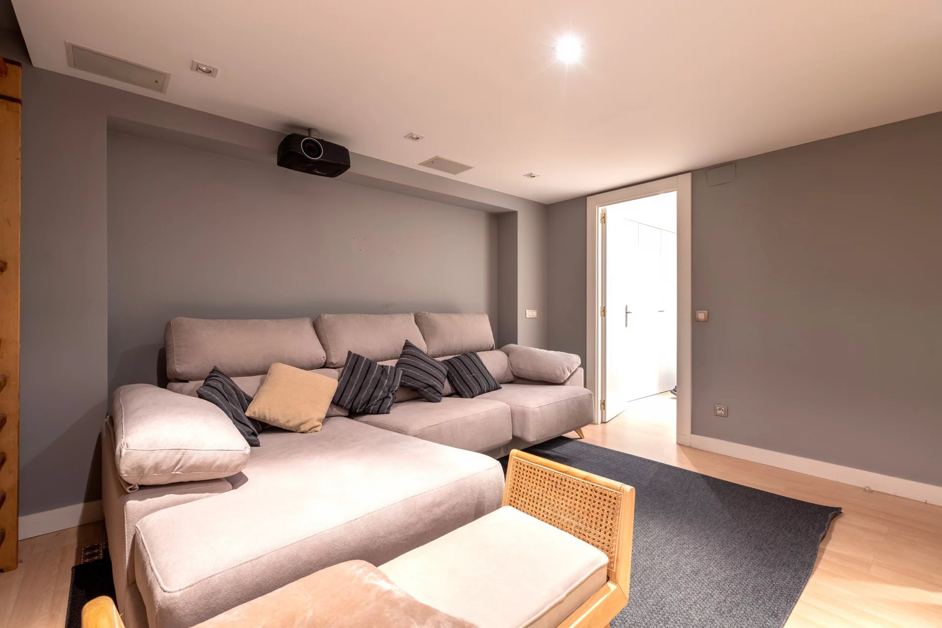 In the basement, we find a living room, a sauna, a gym, a storage room, a pantry, a hallway with fitted closets and the garage with four spaces, including electric charger.