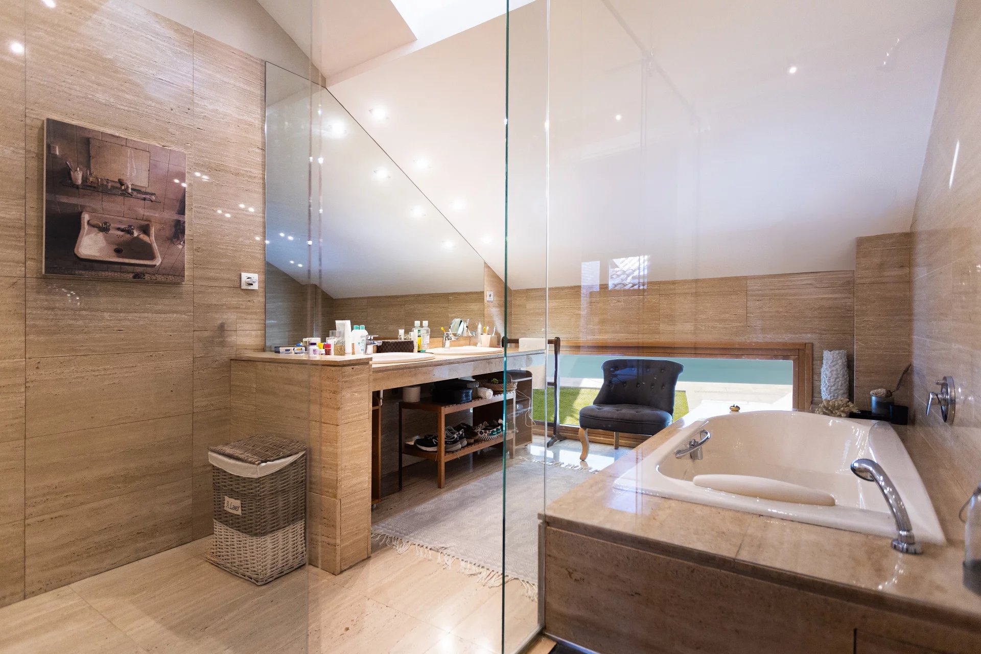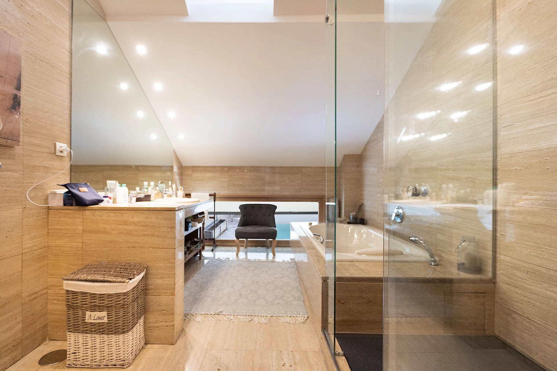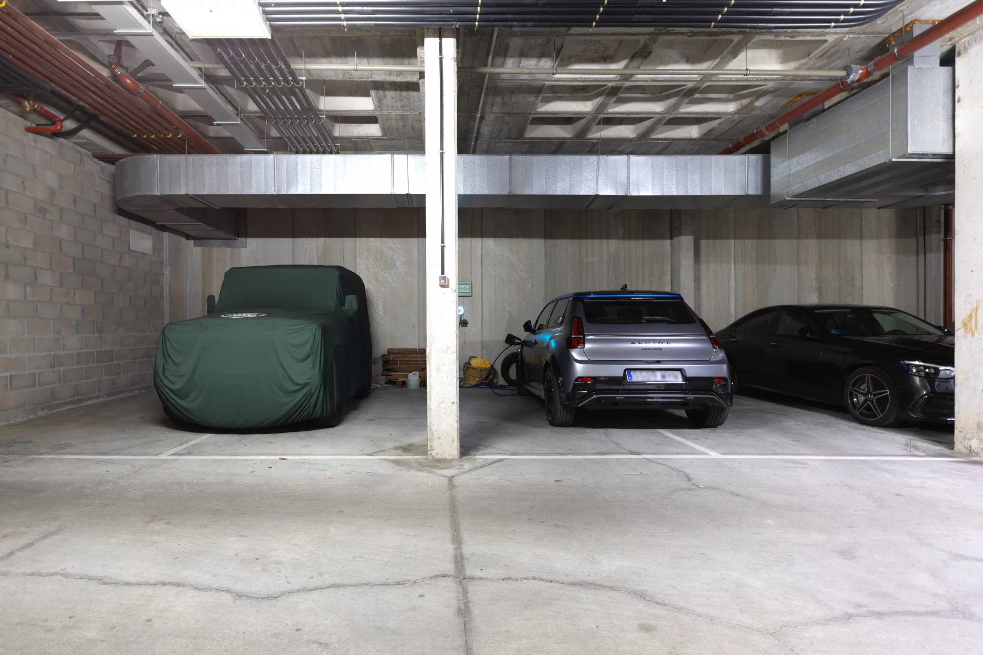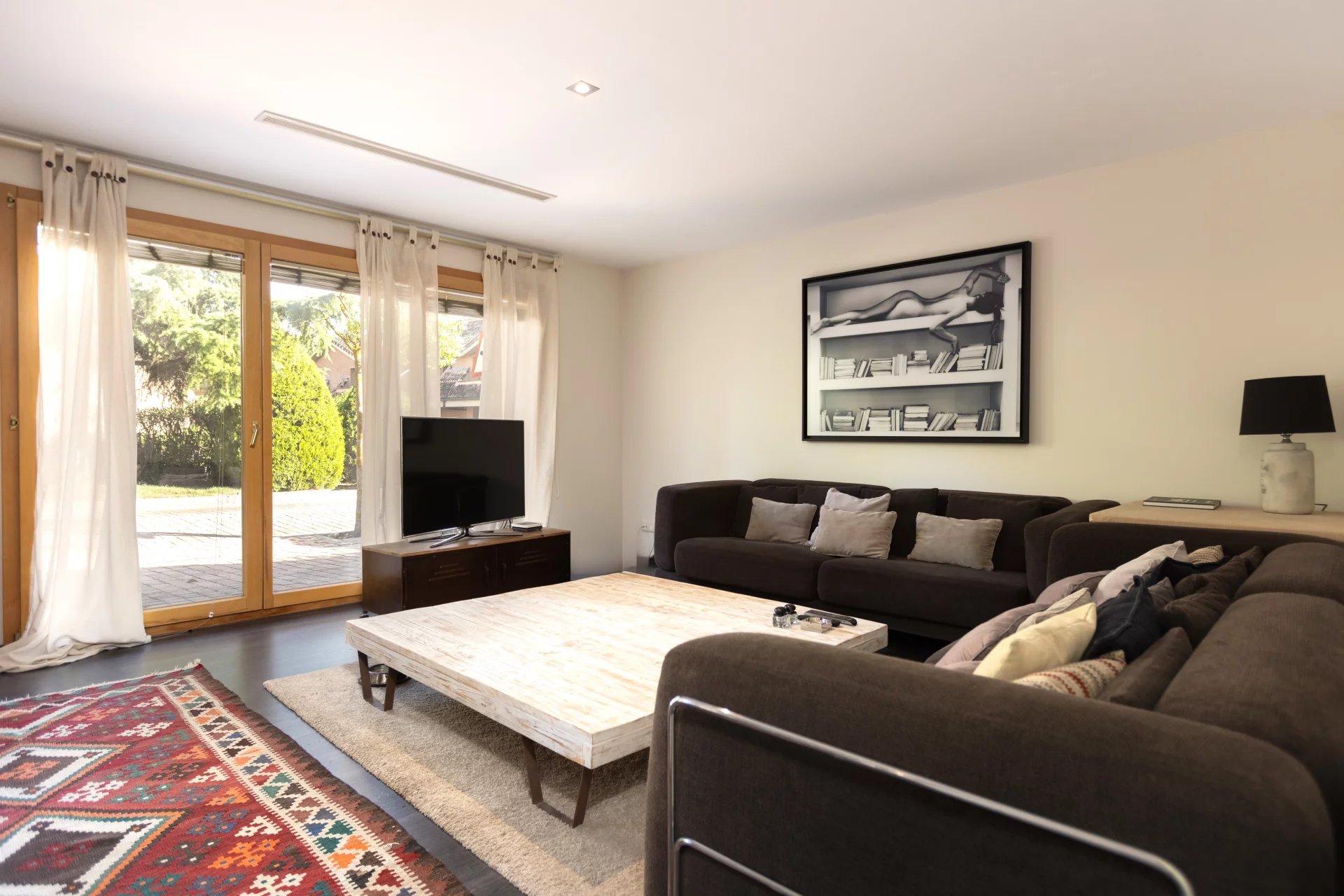 In the basement, we find a living room, a sauna, a gym, a storage room, a pantry, a hallway with fitted closets and the garage with four spaces, including electric charger.