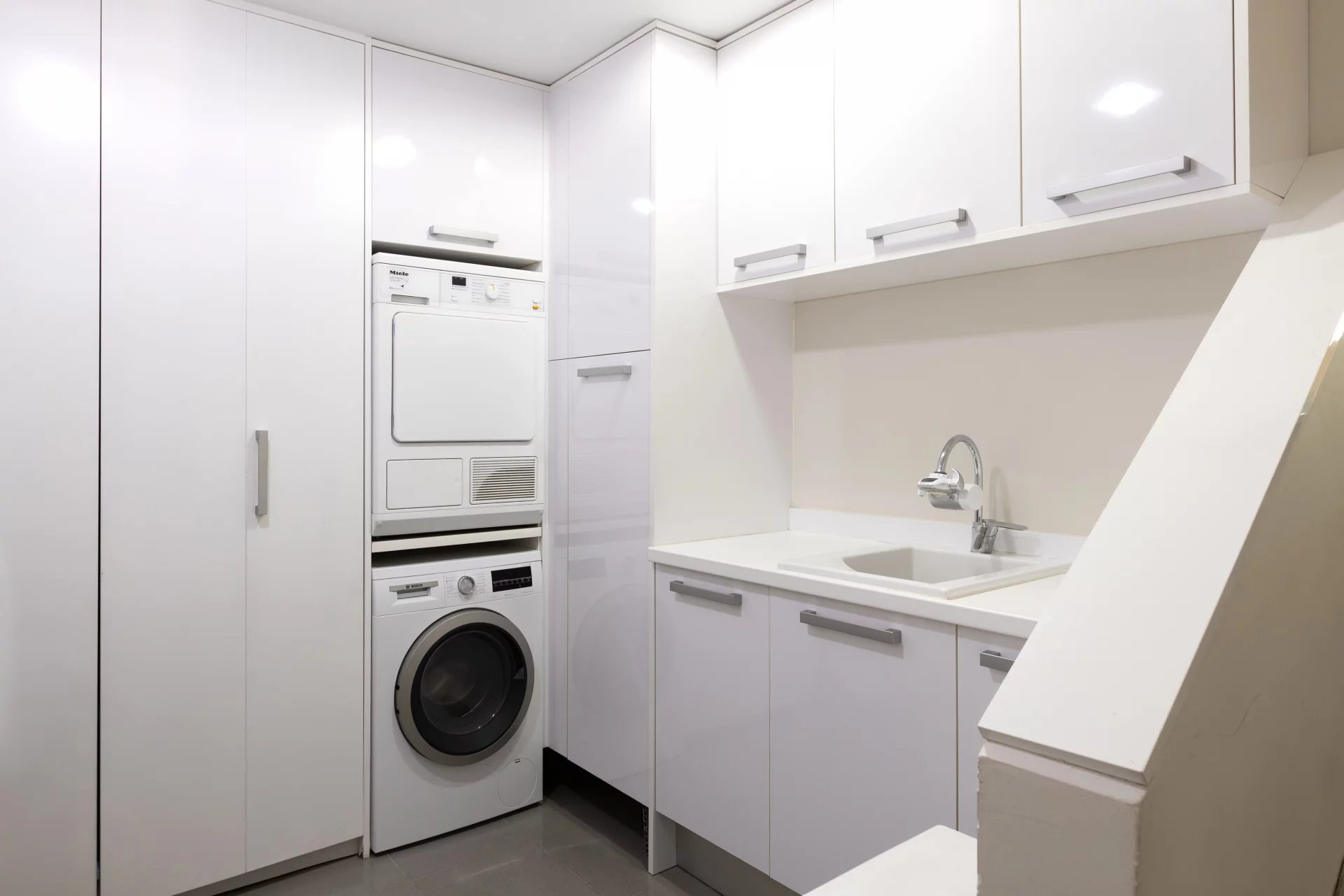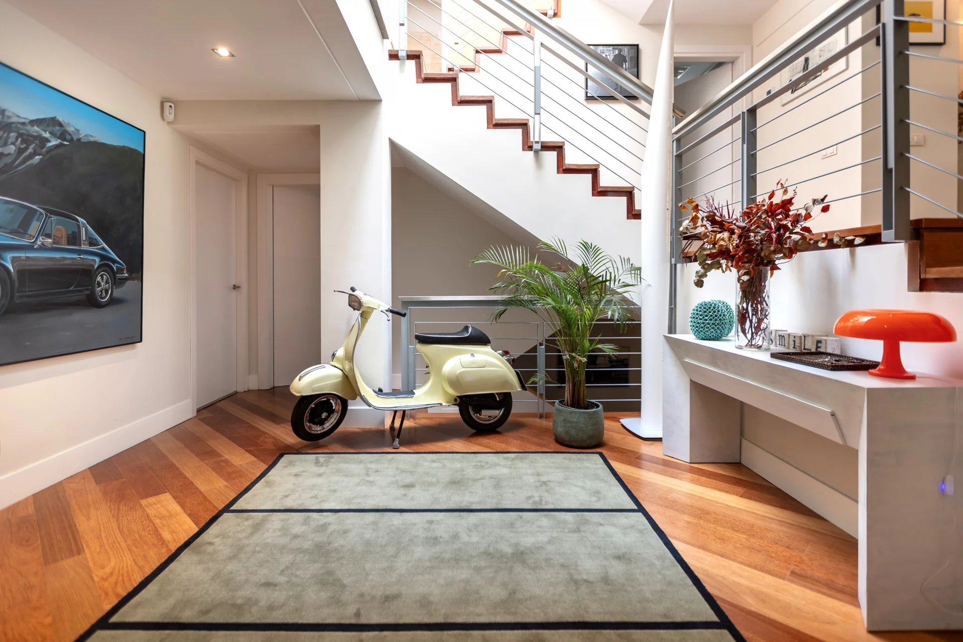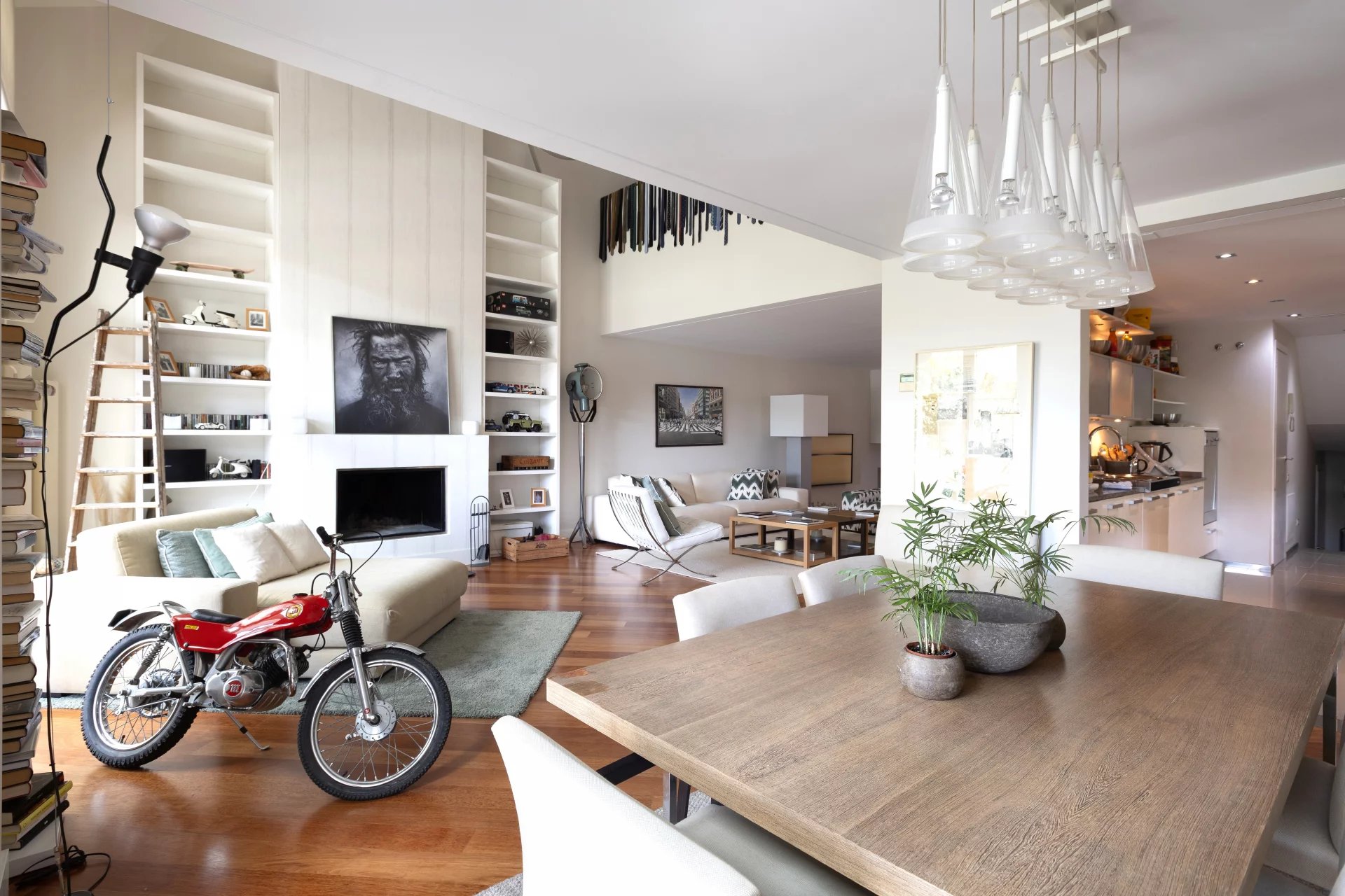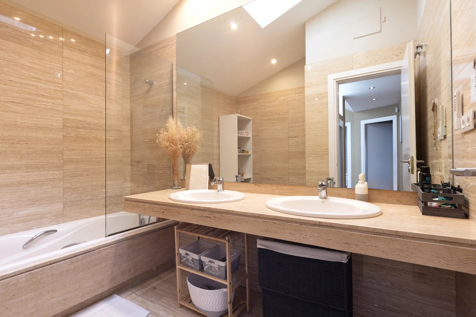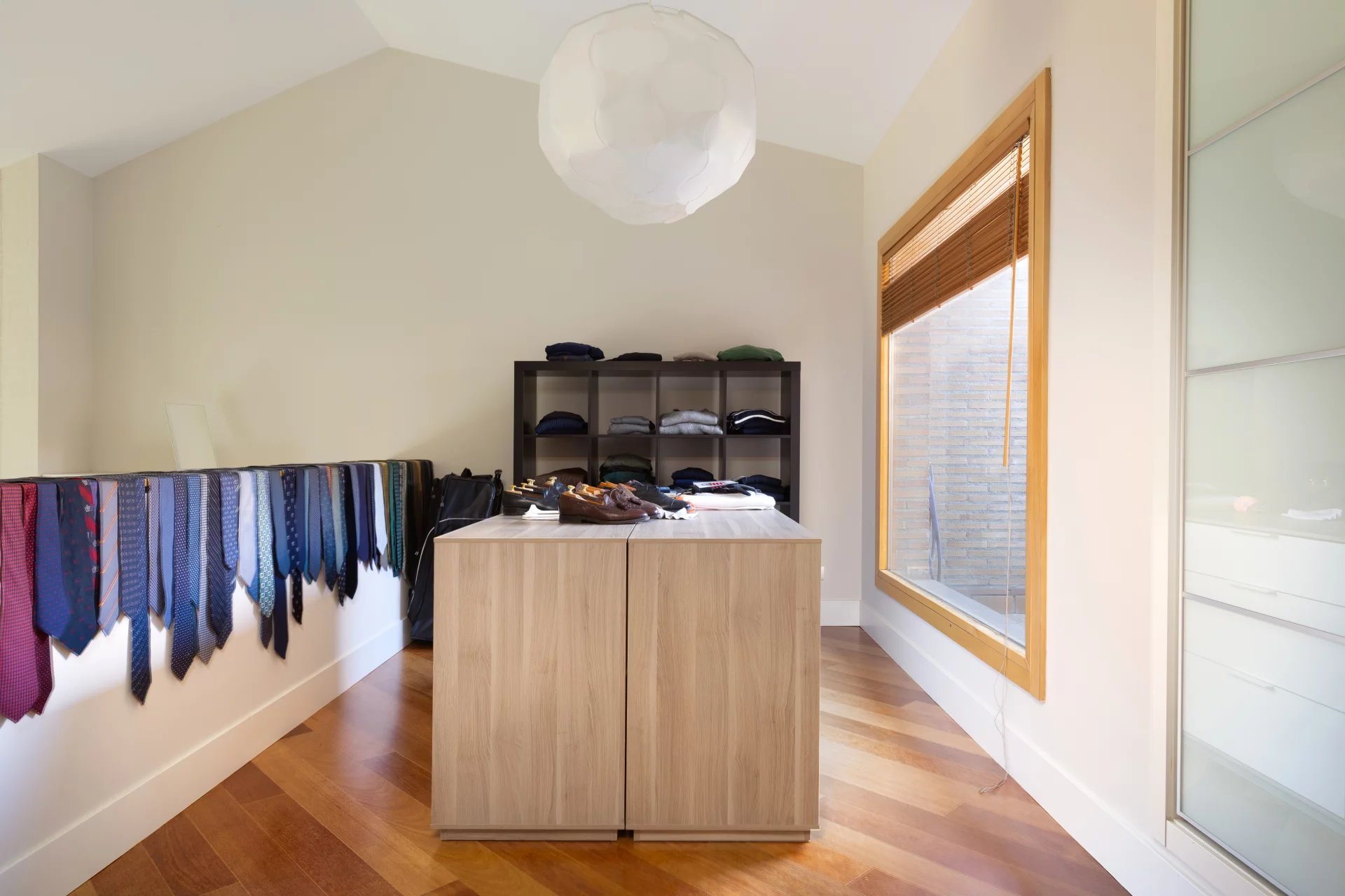 In the basement, we find a living room, a sauna, a gym, a storage room, a pantry, a hallway with fitted closets and the garage with four spaces, including electric charger.