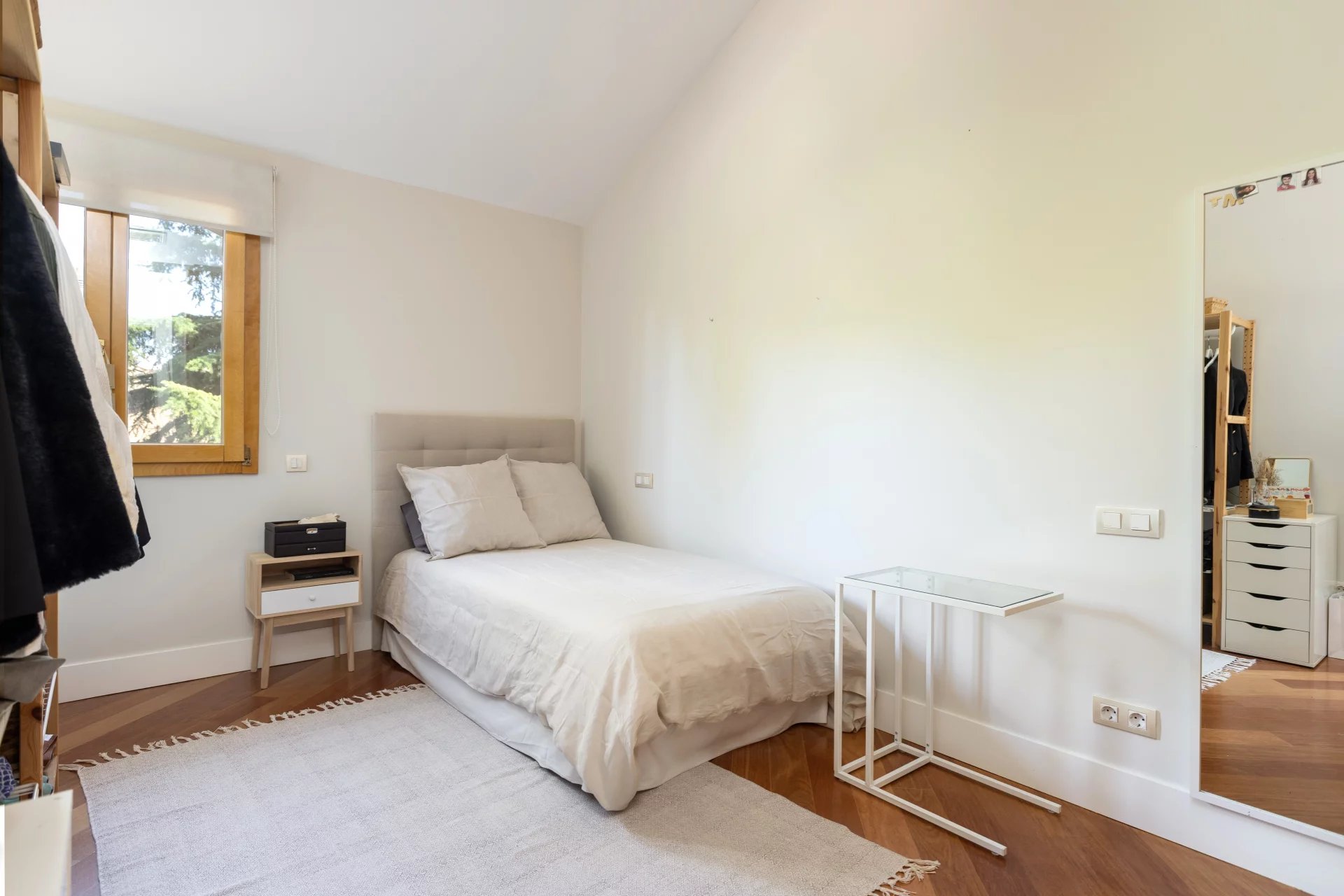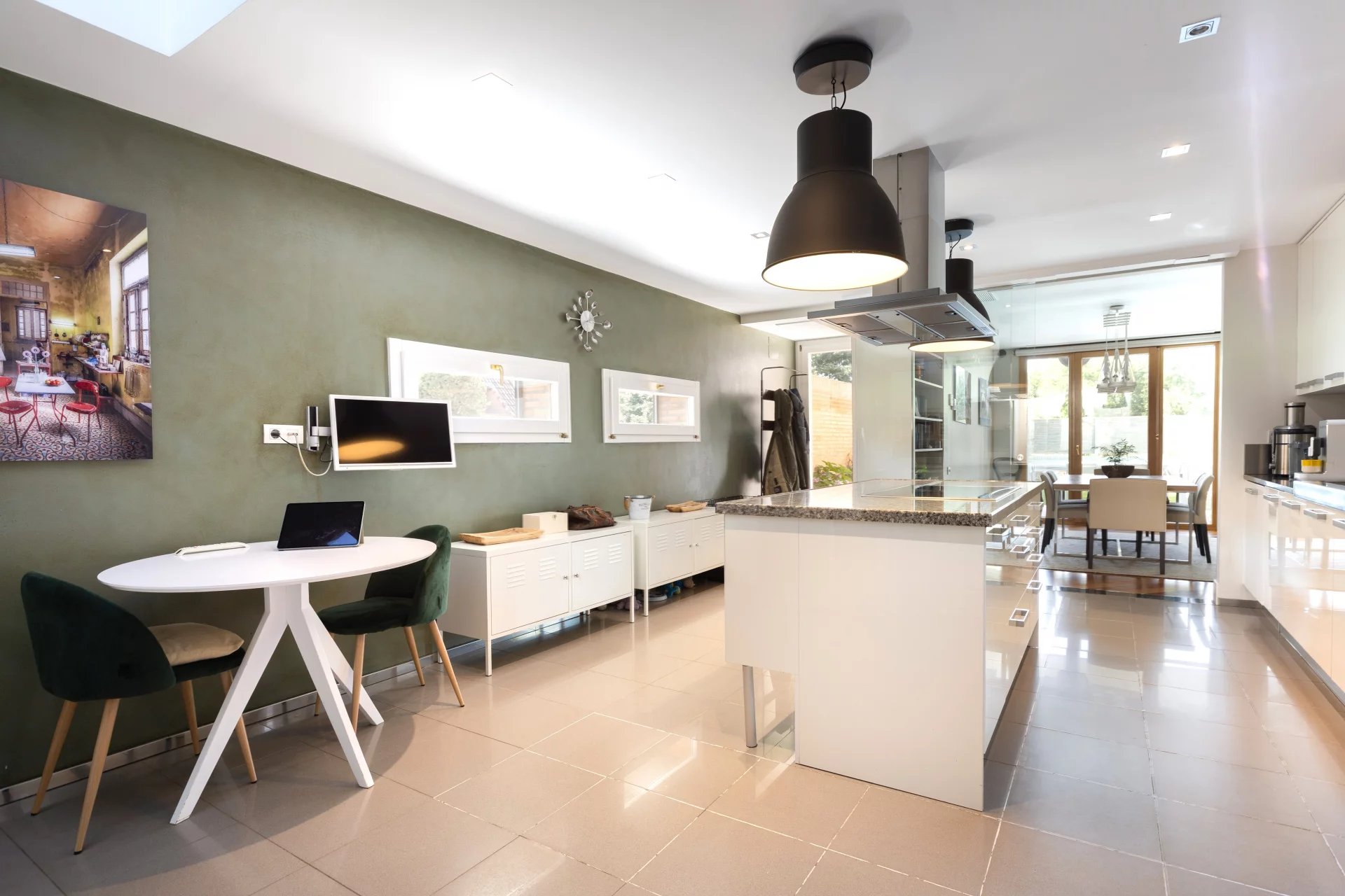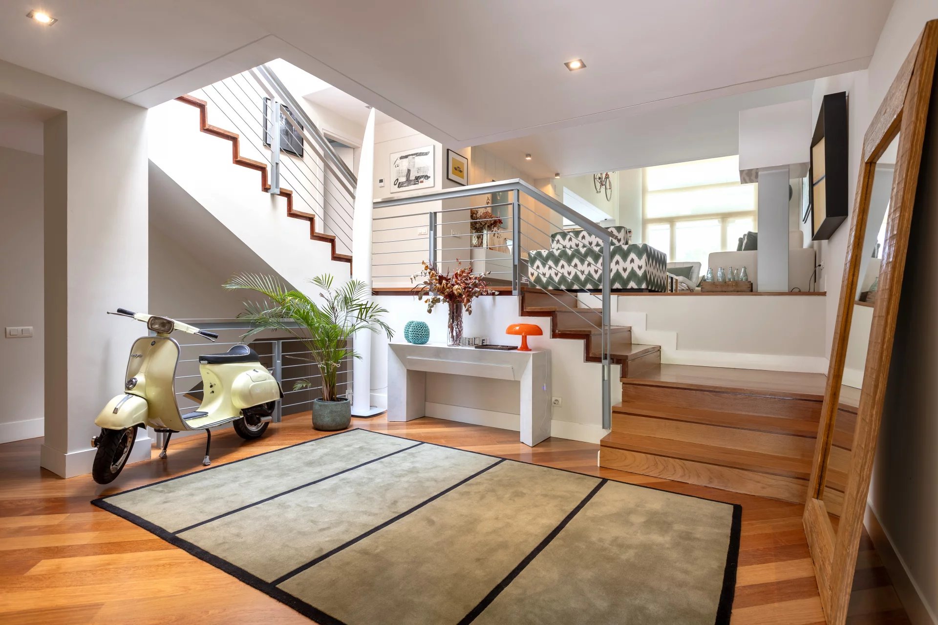 Upon entering the house we find a spacious hall with access to a large living room and office. Continuing upstairs we have a second bright living-dining room overlooking the pool and private garden; and a large kitchen. On the next floor we find three light-filled bedrooms and two bathrooms that serve them. And further up we reach the master bedroom, which has an en suite bathroom, dressing room adjoining it and balcony.