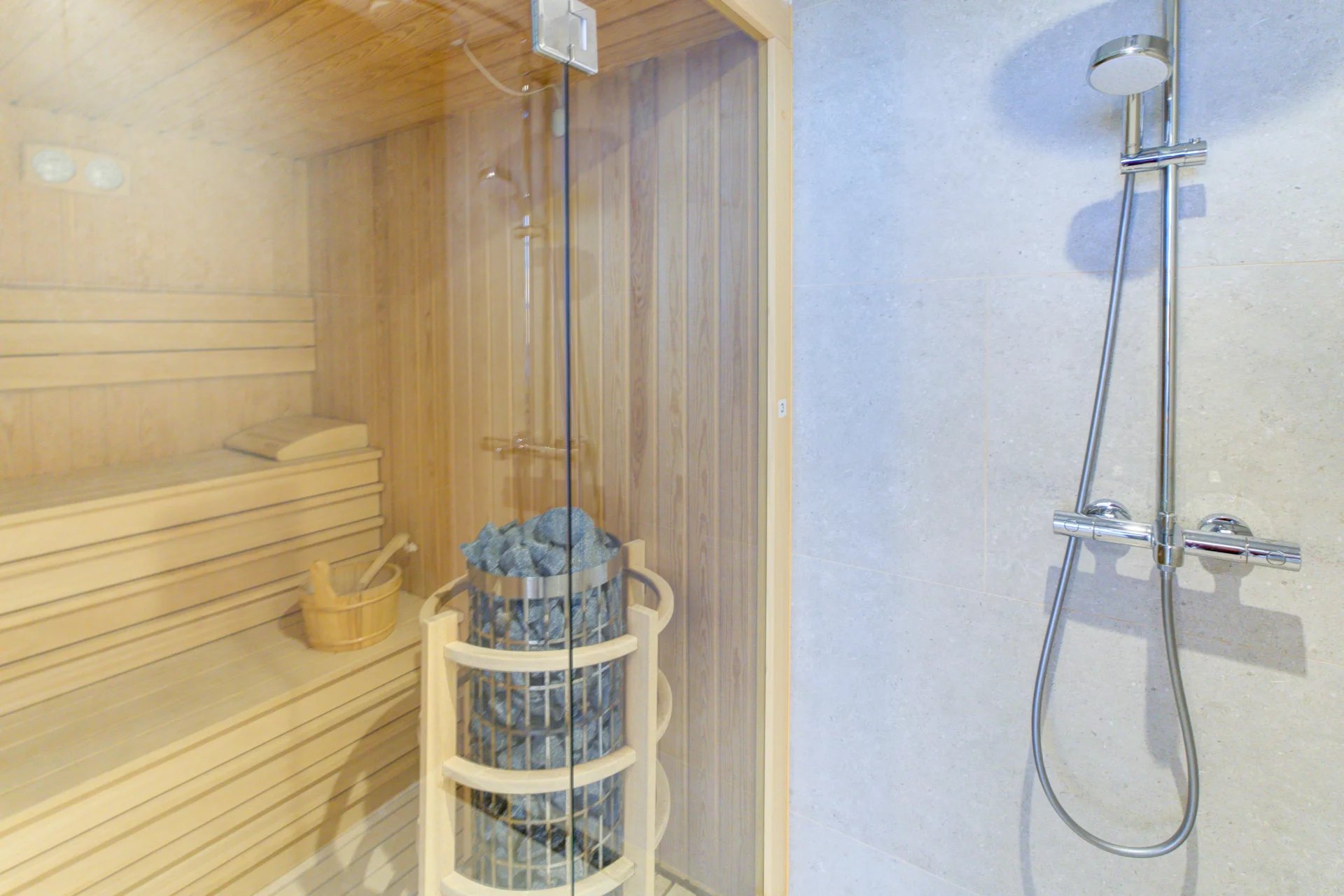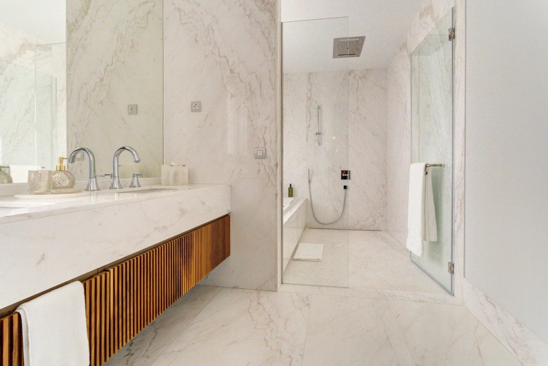 The night area comprises four bedrooms, all with en-suite bathrooms. The master bedroom, located at the back of the residence, enjoys exceptional privacy and boasts a walk-in closet and spacious bathroom. In addition, one of the other bedrooms has direct access to the terrace, making it ideal as a lounge or study.