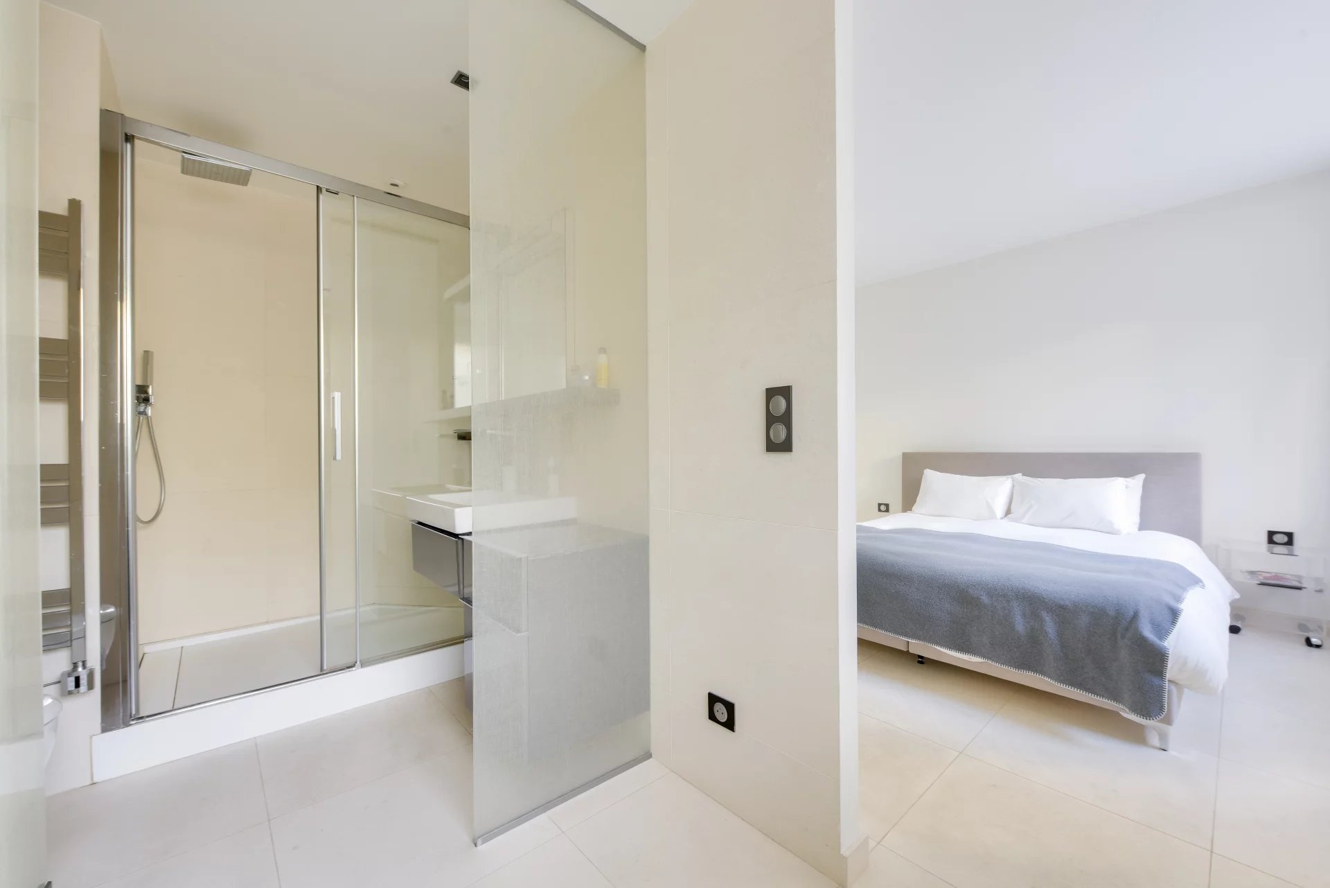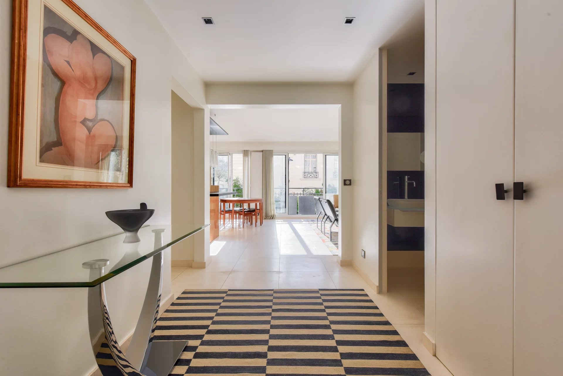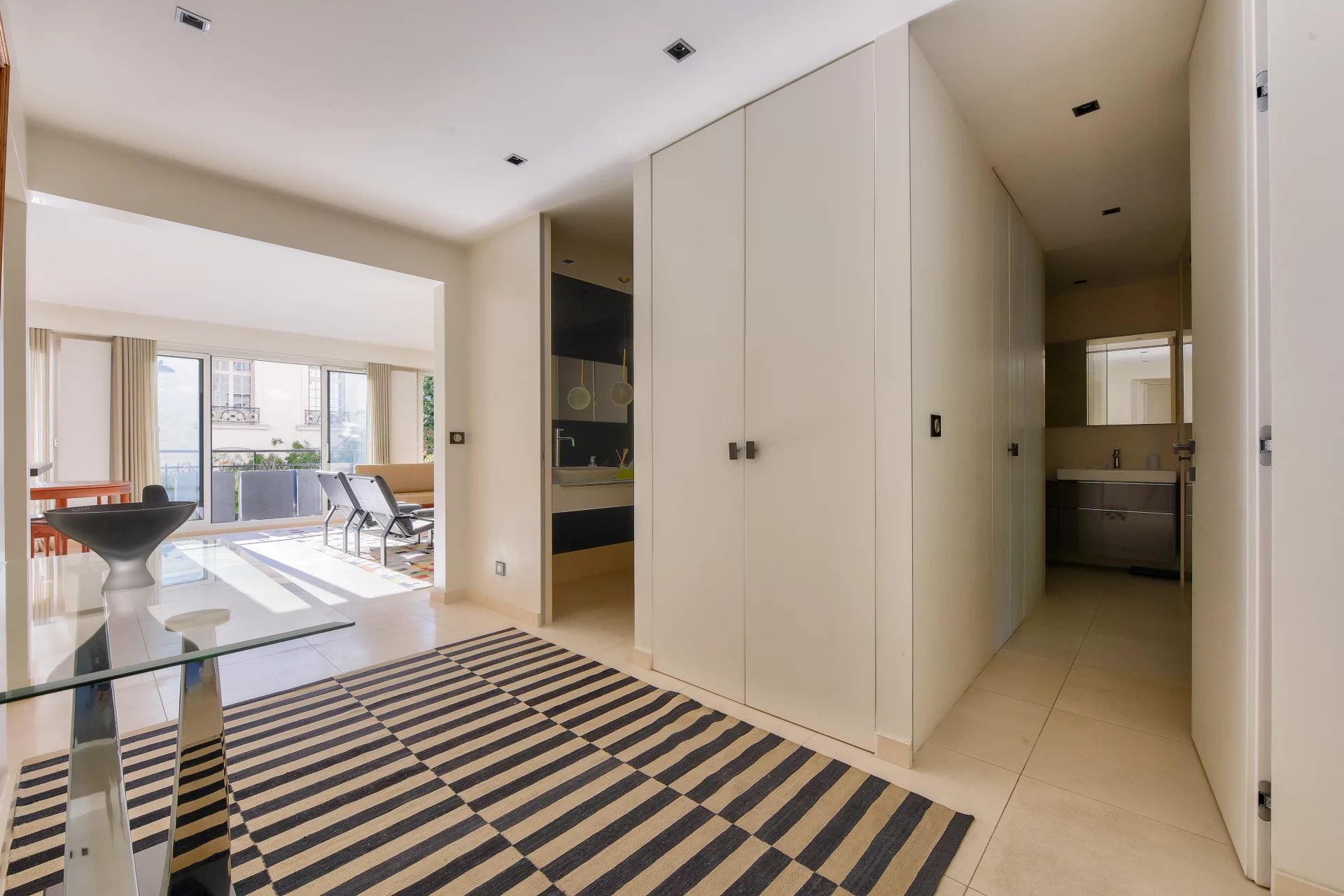 - A spacious entry hall separating the living area from the private quarters,